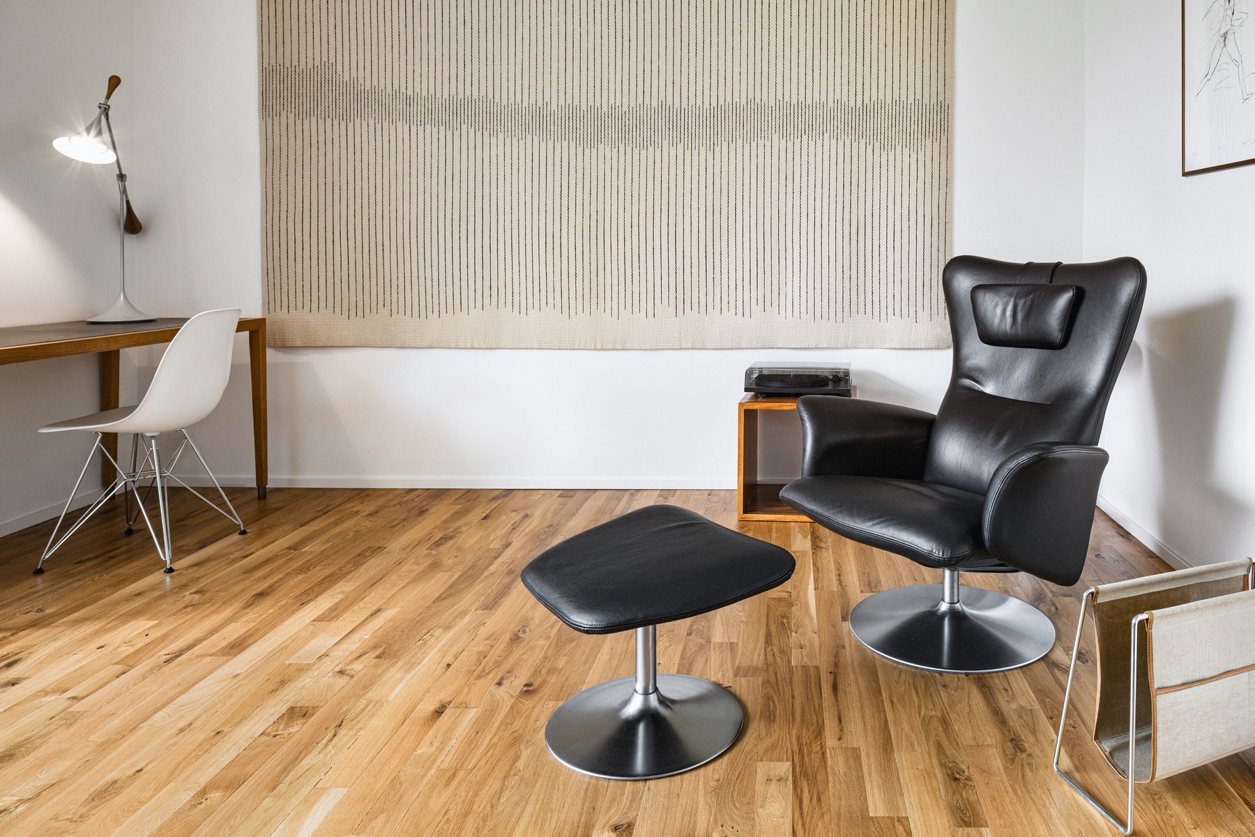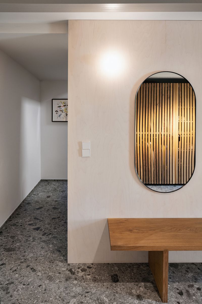 V interiéru jsou ponechány a doplněny některé původní prvky, například pozinkované zábradlí, které propojením na hlavních a vedlejších podestách jednotlivých ramen získalo „neprašovský“ charakter. Renovovány a doplněny byly původní parkety a podlahové „lišty“ z pozinkovaného plechu. Stěny barevně ztlumené do bílé a šedé dávají vyniknout obrazům, část je obložena překližkou v přírodním tónu. Také koupelny byly změněny jak prostorově, tak celkovým laděním. Bílé velkoformátové obklady (3 x 1 m) doplňuje teracová dlažba a truhlářské kusy z dubového masivu. Původní vnitřní dveře s nadsvětlíky prošly renovací, nové jsou provedeny se skrytými zárubněmi.