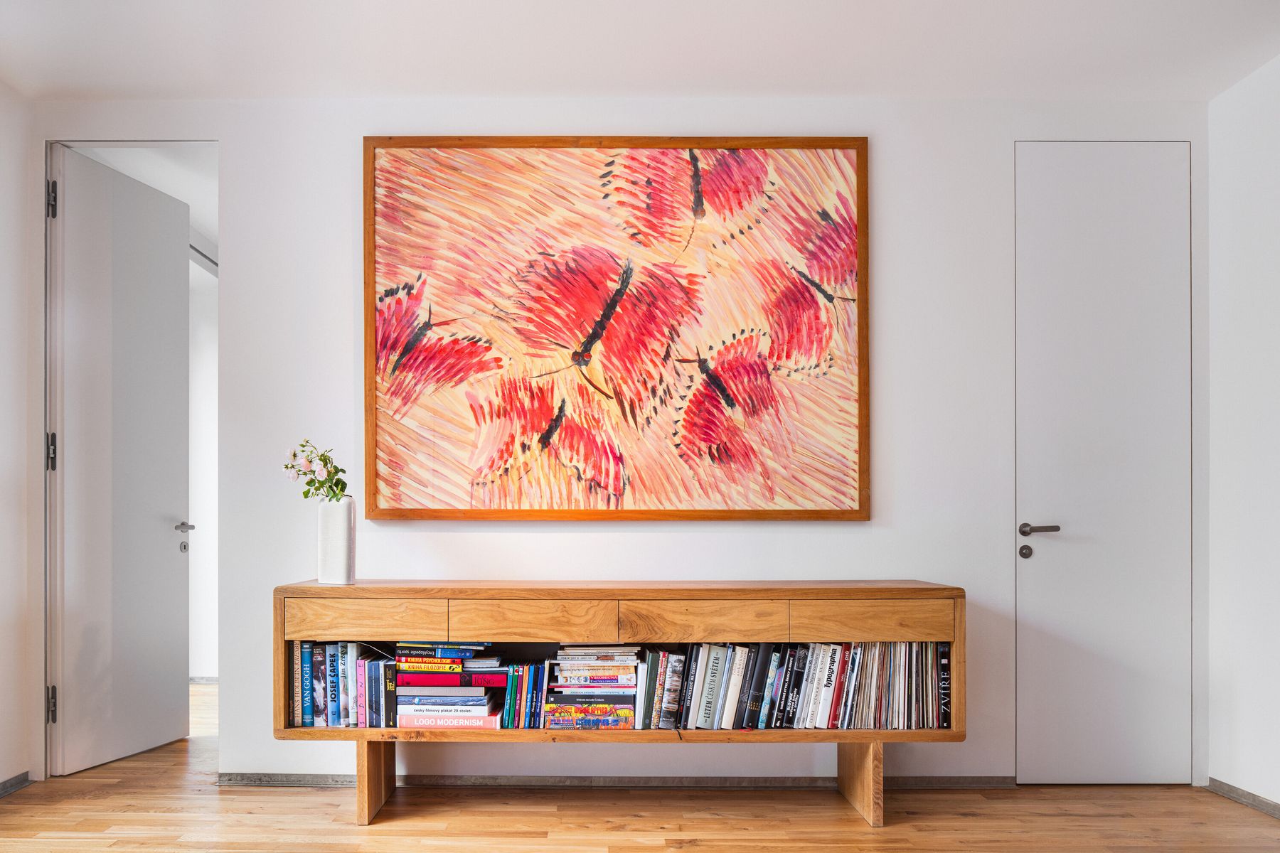 Interiér je především sbírkou věcí shromažďovaných s citem a rozmyslem po celý život. Věcí poutajících investora k lidem a událostem. Spíše než sbírkou předmětů je tak sbírkou lidí skrze předměty. Kamna v obývacím pokoji vytvořil přítel Jürgen Rajh, truhlářské vybavení z masivu vyrobil syn Jakub. Skleněná socha spočívající na kamnech je dílem kamarádky Dany Vachtové. Textilní prvky interiéru ušila investorka z vlny přivezené ze Skotska, světla nad jídelním stolem pořídil investor na dánském bazaru. Betonové dlaždice terasy jsou z betonárny nedaleko Javornické palírny, dalšího investorova „příběhu“. Stejně jako první, i druhá rekonstrukce domu je nepřekvapivě spojena s kamarády architekty. Každý centimetr domu je „pokryt příběhy“, racionálními i impulzivními rozhodnutími, je zrcadlem jeho obyvatel.