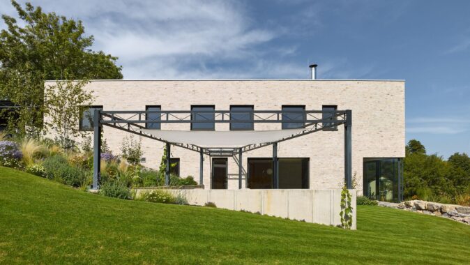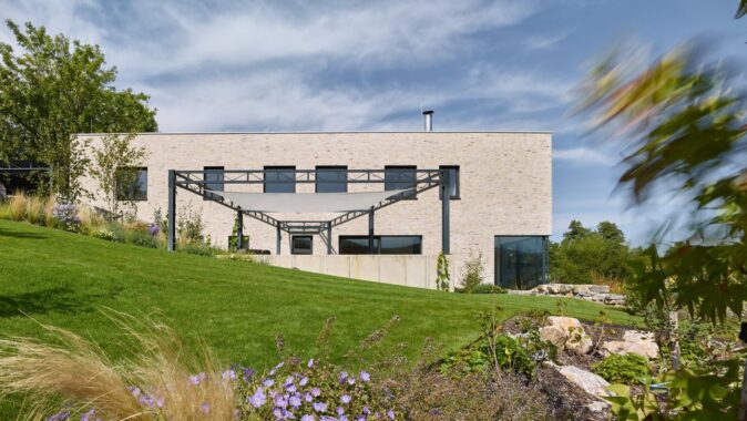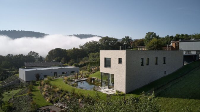 Celkově jsme dům koncipovali jako stavbu, která se nesnaží terén překonávat, ale naopak s ním spolupracuje. Všechny klíčové provozní i tvarové principy domu vycházejí z reakce na lokalitu. Výsledkem je dům, který je pevně zakotvený ve svém prostředí, krajinu nejen rámuje, ale svou dispozicí ji aktivně využívá.