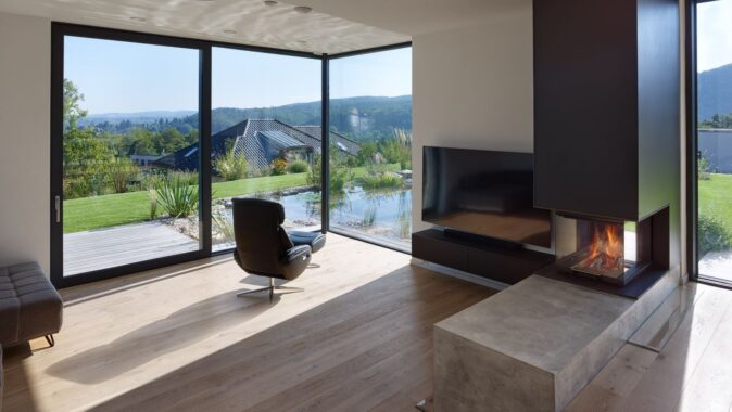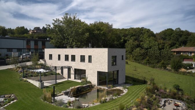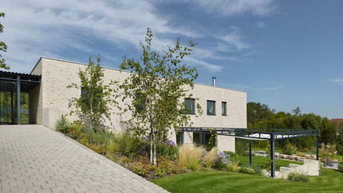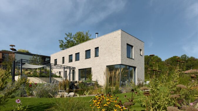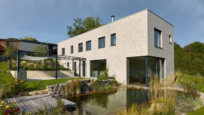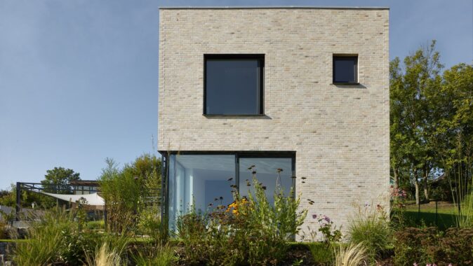Volba materiálů sjednocuje vzhled fasády a interiéru a zajišťuje jejich vzájemnou návaznost. Fasáda z pískových cihel dodává stavbě pevný, klidný výraz. Stejné světlé tóny jsme uplatnili i uvnitř domu – zejména na běleném dubu použitým pro podlahy, schodišťové stupně i vestavěný nábytek. Dominantním prvkem obytného prostoru je třístranný krb, který přirozeně definuje hranici mezi jídelní a obývací částí, umožňuje vnímat oheň z různých míst a prostor zónuje bez nutnosti fyzických bariér. Plní tak jak estetickou, tak funkční roli a stává se přirozeným středobodem společenského života domu.