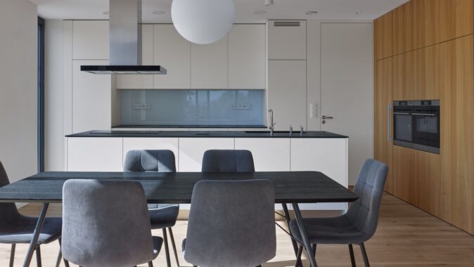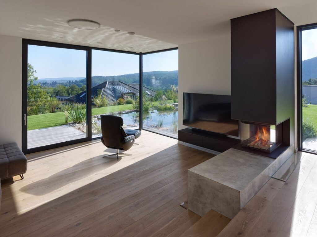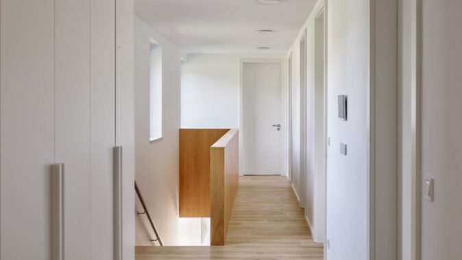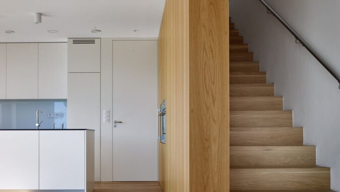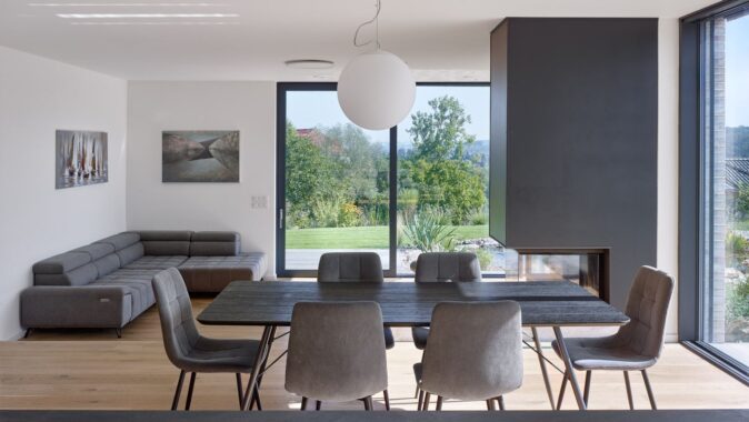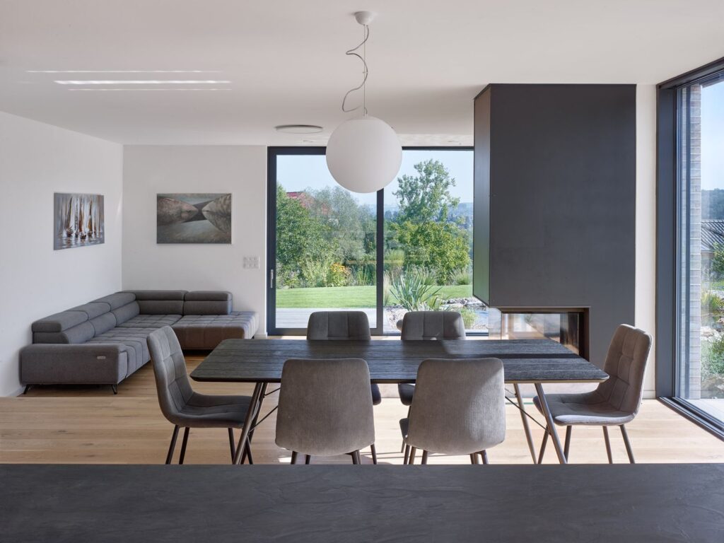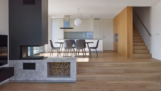 Z ložnicového patra se po schodišti sestupuje do společenské části domu, kde jsme situovali kuchyňský kout s jídelnou a obývací pokoj. Toto vertikální členění odkazuje na koncept známý například z vily Tugendhat v Brně, kde se obytné prostory otevírají směrem k nejkvalitnějším výhledům a propadají se terénem. Podobná logika nám zde umožnila vytvořit plynulé prostorové gradace – od kompaktního horního podlaží až po plně otevřený obytný prostor s výhledem do údolí.