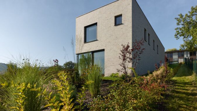 Svažitý pozemek s výhledem do údolí Berounky přivedl studio Stempel Tesař architekti k netradičnímu uspořádání domu. Terén neumožňoval klasickou dispozici s obytným přízemím a klidovou částí v patře. Zvolili obrácený princip: hlavní vstup umístili do horní úrovně, ve které jsou i ložnice.