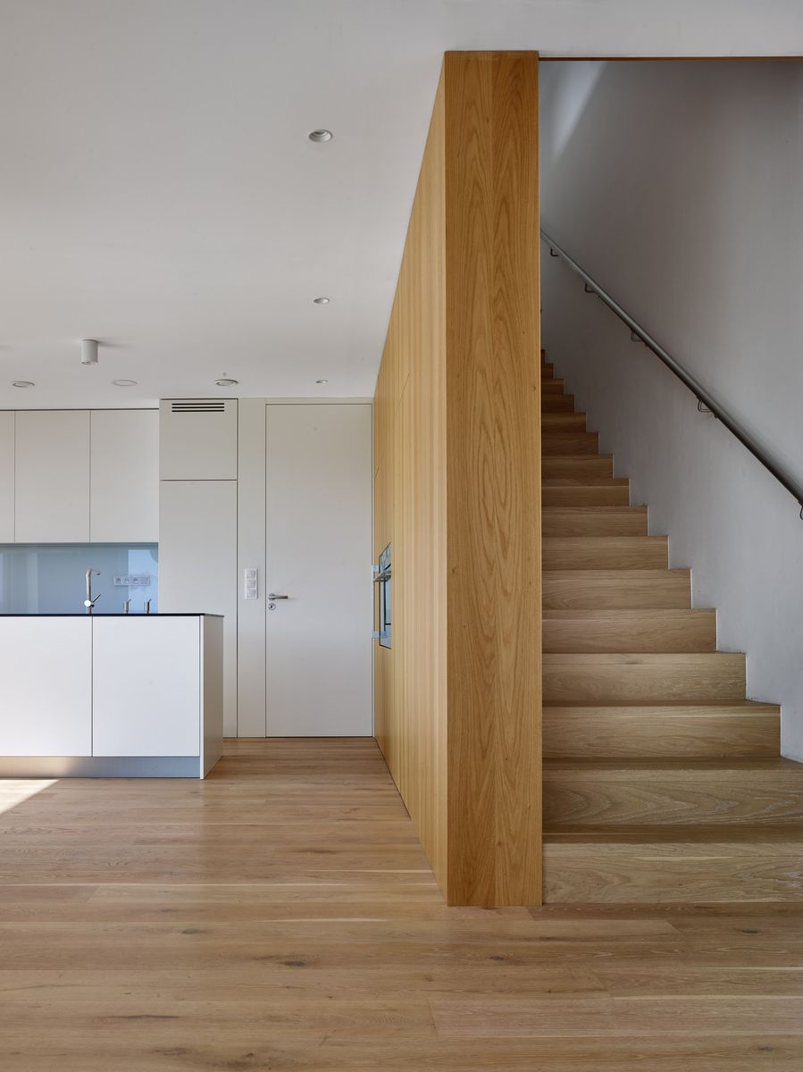 Z ložnicového patra se po schodišti sestupuje do společenské části domu, kde jsme situovali kuchyňský kout s jídelnou a obývací pokoj. Toto vertikální členění odkazuje na koncept známý například z vily Tugendhat v Brně, kde se obytné prostory otevírají směrem k nejkvalitnějším výhledům a propadají se terénem. Podobná logika nám zde umožnila vytvořit plynulé prostorové gradace – od kompaktního horního podlaží až po plně otevřený obytný prostor s výhledem do údolí.