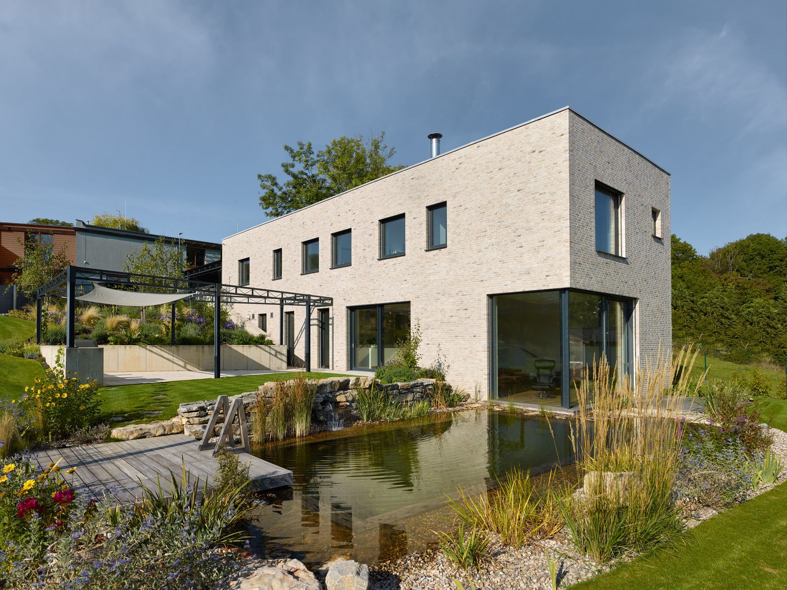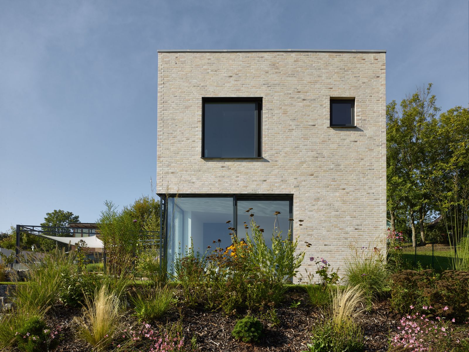 Volba materiálů sjednocuje vzhled fasády a interiéru a zajišťuje jejich vzájemnou návaznost. Fasáda z pískových cihel dodává stavbě pevný, klidný výraz. Stejné světlé tóny jsme uplatnili i uvnitř domu – zejména na běleném dubu použitým pro podlahy, schodišťové stupně i vestavěný nábytek. Dominantním prvkem obytného prostoru je třístranný krb, který přirozeně definuje hranici mezi jídelní a obývací částí, umožňuje vnímat oheň z různých míst a prostor zónuje bez nutnosti fyzických bariér. Plní tak jak estetickou, tak funkční roli a stává se přirozeným středobodem společenského života domu.