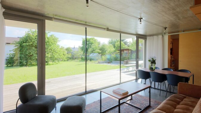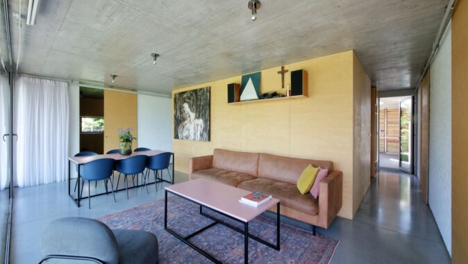 Betonový strop vybíhá ven nad jižní prosklenou stěnou, kterou chrání proti přehřívání. Podlaha je z hlazeného betonu. Plné cihly jsou v interiéru doplněny nábytkem a obklady z překližky.