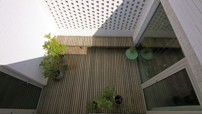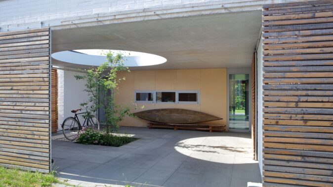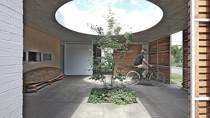 Po stranách jsou dva cihelné bloky, jeden s ložnicí otevřenou do atria se saunou, druhý s dětskými pokoji a kůlnou. Mezi nimi proplouvá denní život. Od ulice vstupním nádvořím se stromkem a krytým stáním, kolem kuchyně a koupelen do obýváku s jídelnou až na terasu do zahrady.