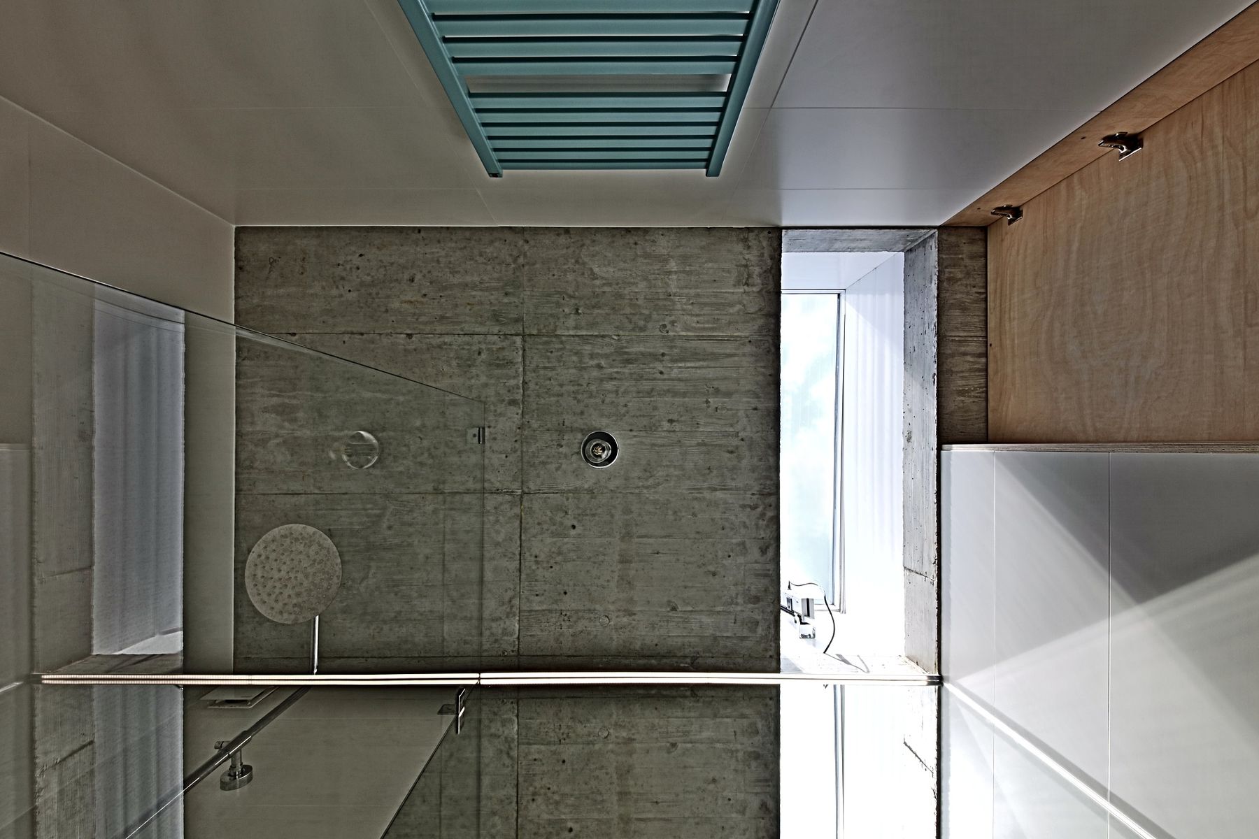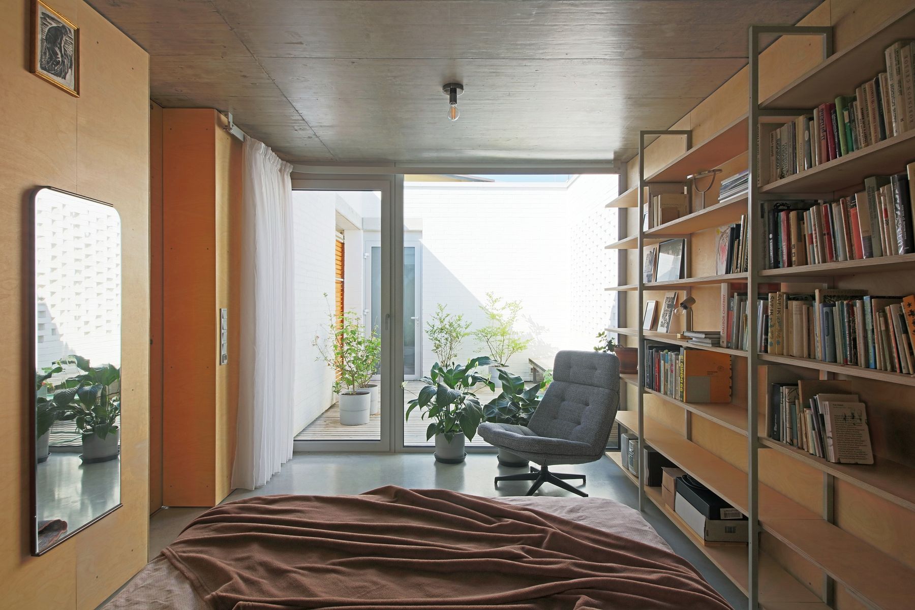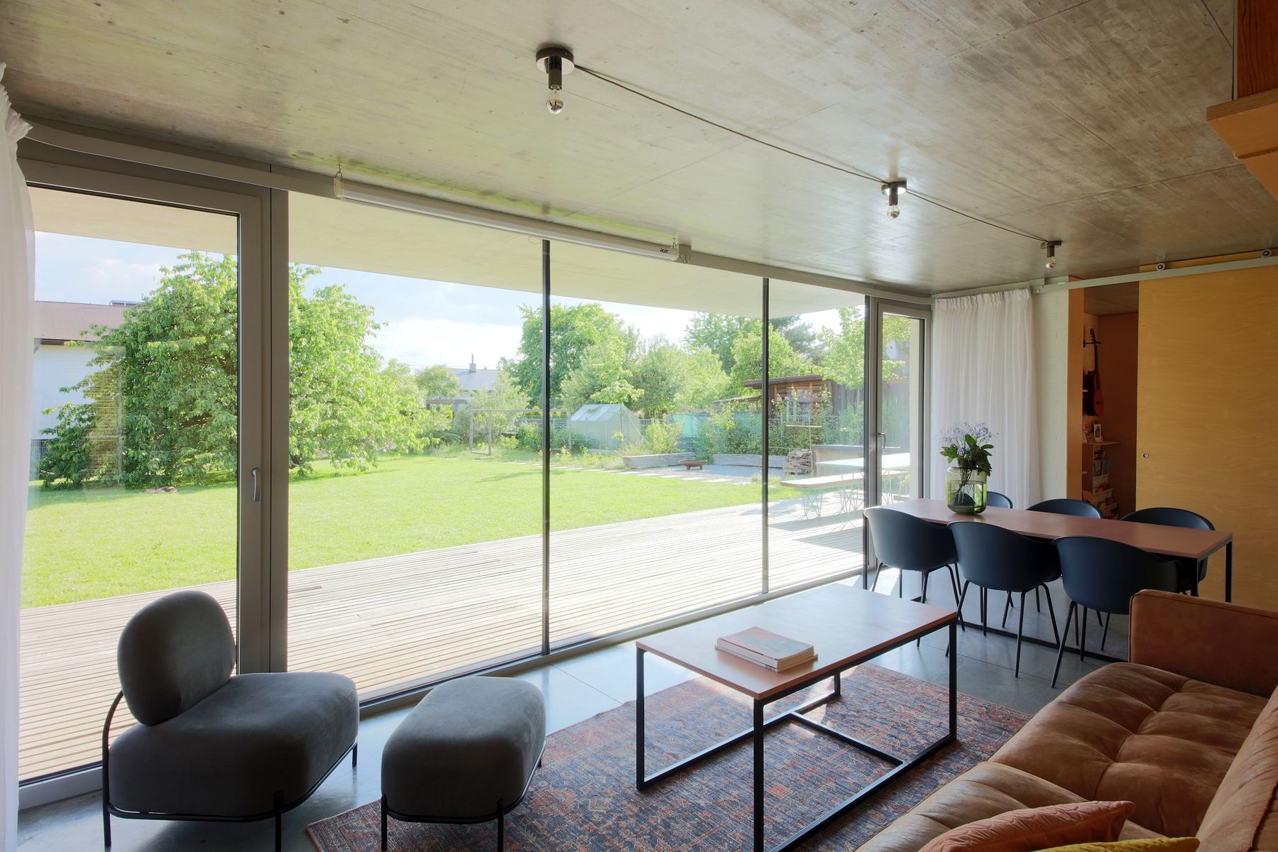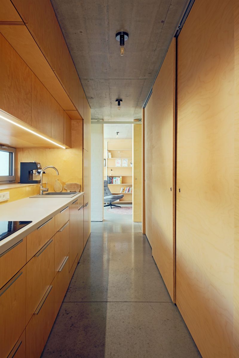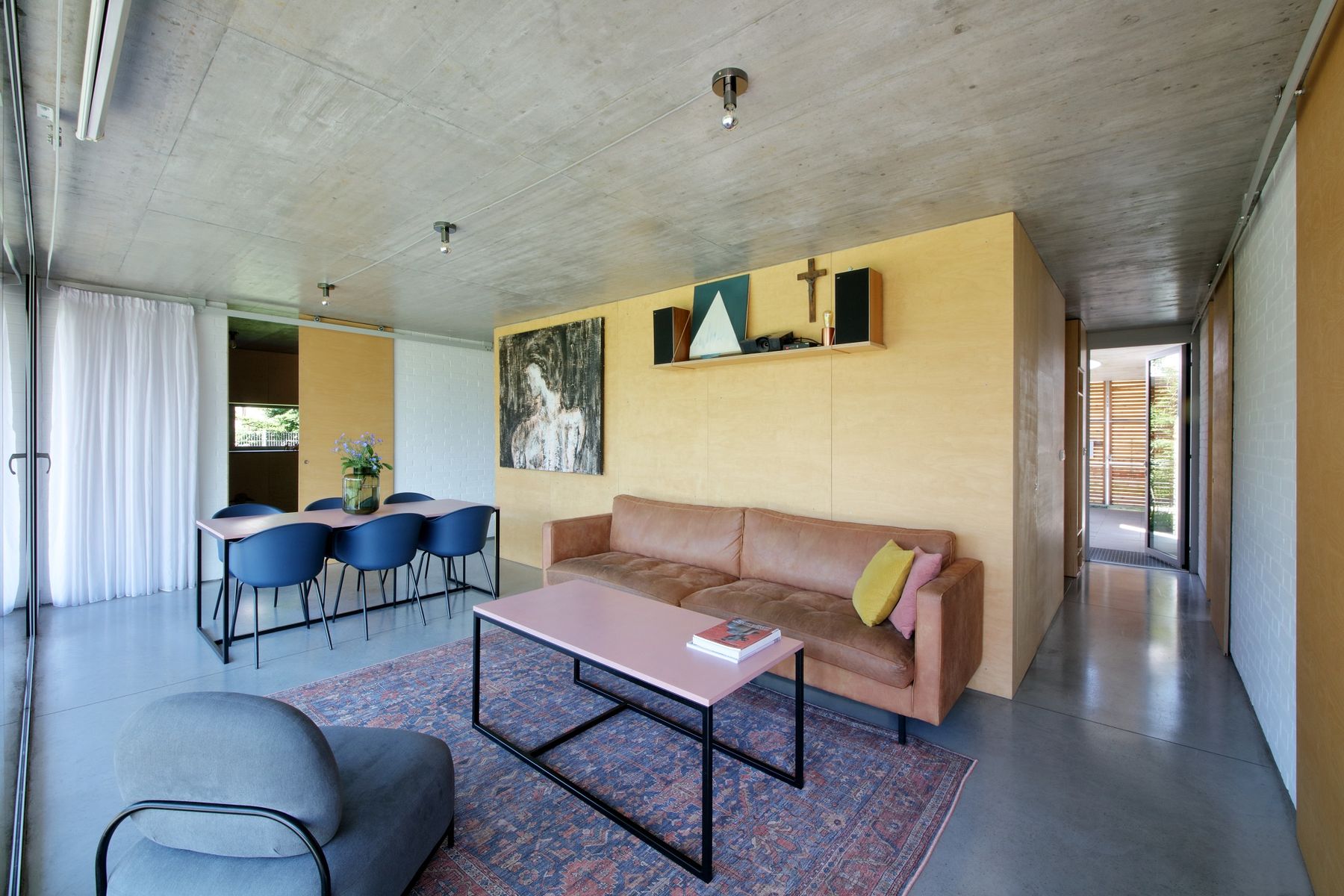 Betonový strop vybíhá ven nad jižní prosklenou stěnou, kterou chrání proti přehřívání. Podlaha je z hlazeného betonu. Plné cihly jsou v interiéru doplněny nábytkem a obklady z překližky.