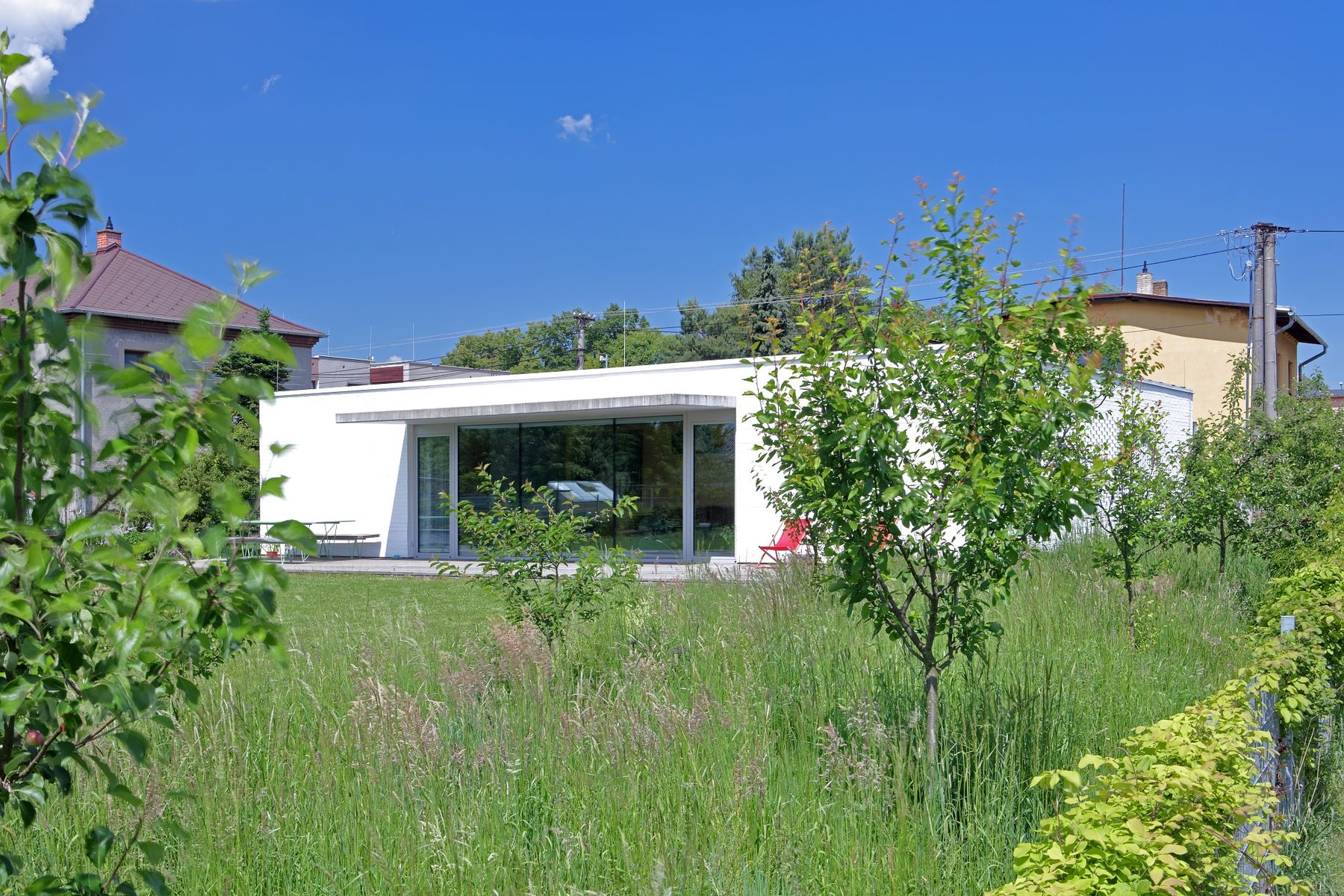 Někdo se diví, že nám je vidět až do talíře. Nám to ale nevadí. Užíváme si výhledu do krajiny, psa povalujícího se na terase, květinové louky, ovocných stromů v sadu, vůně bylinek a šumění rákosí.