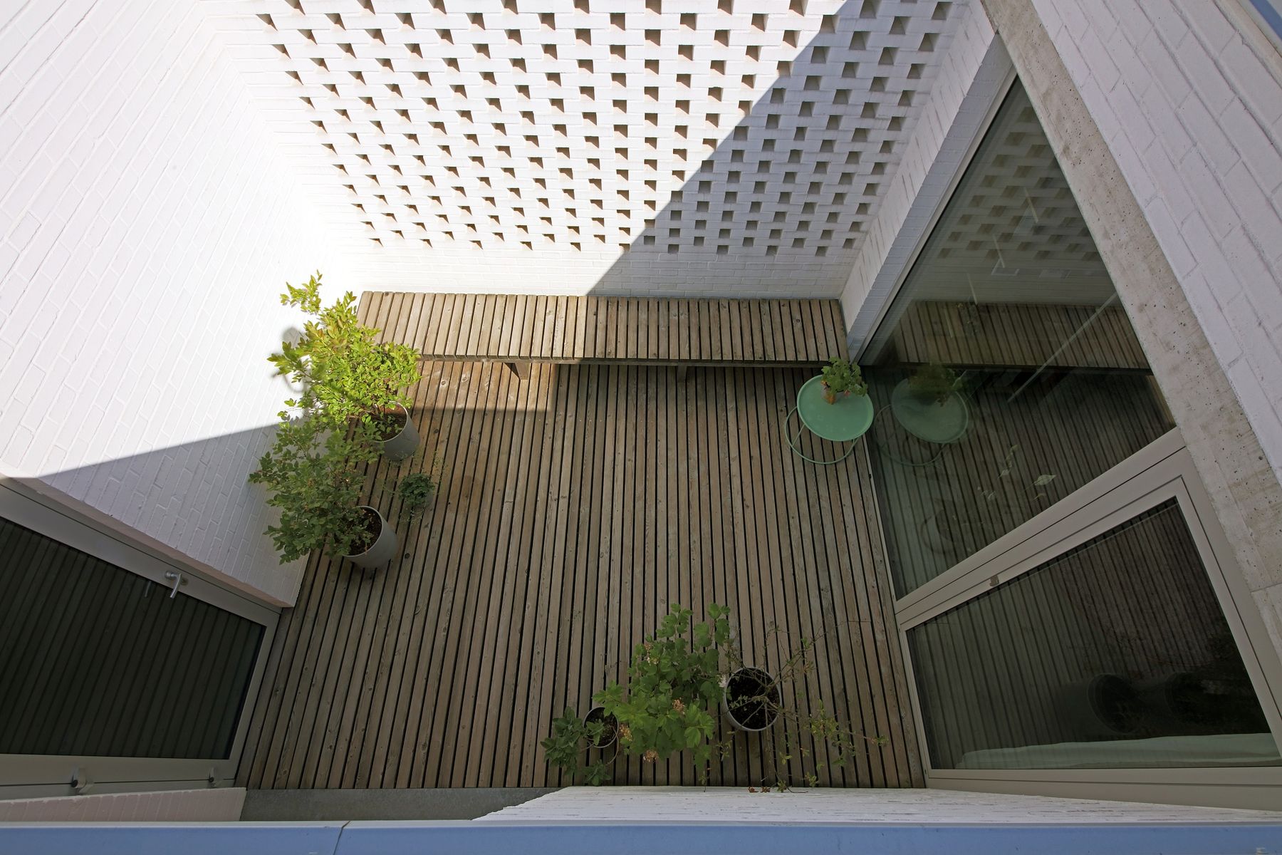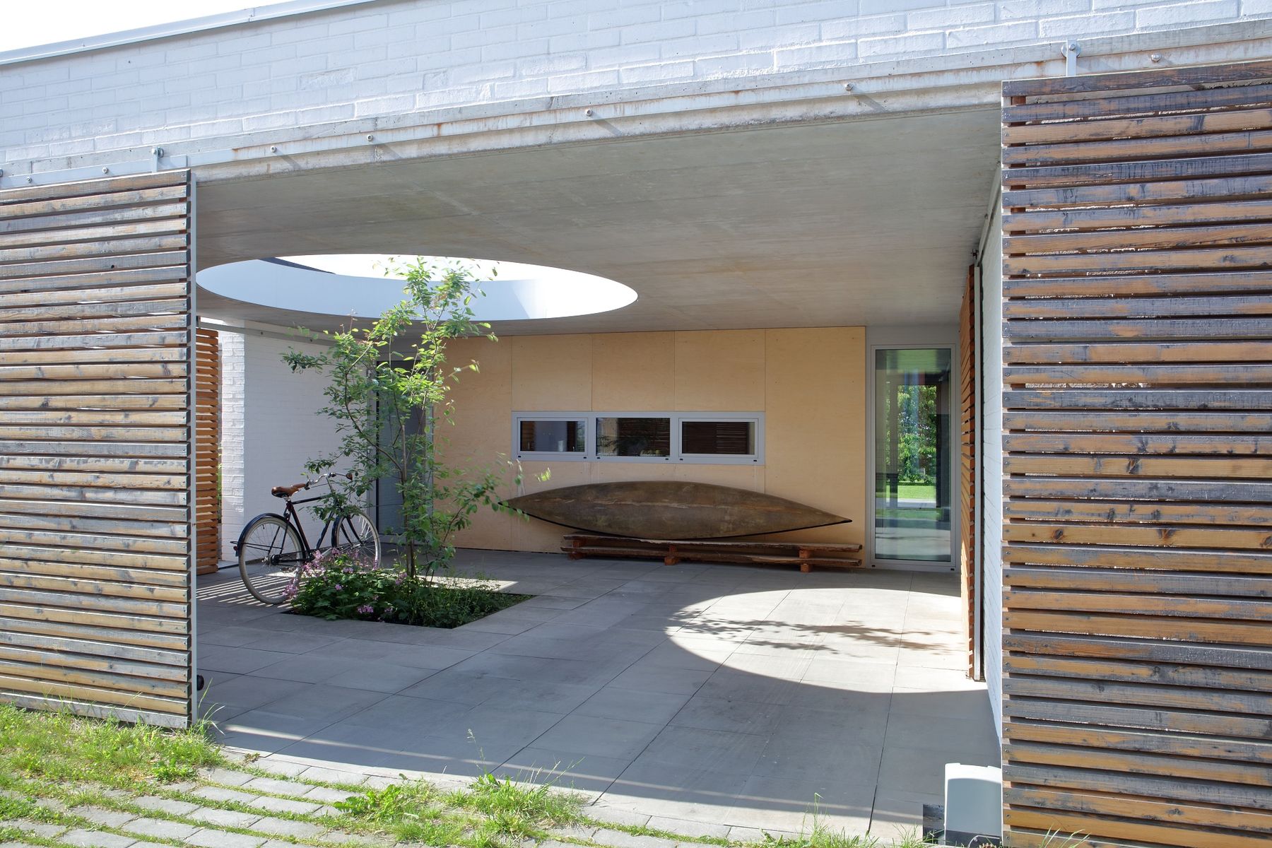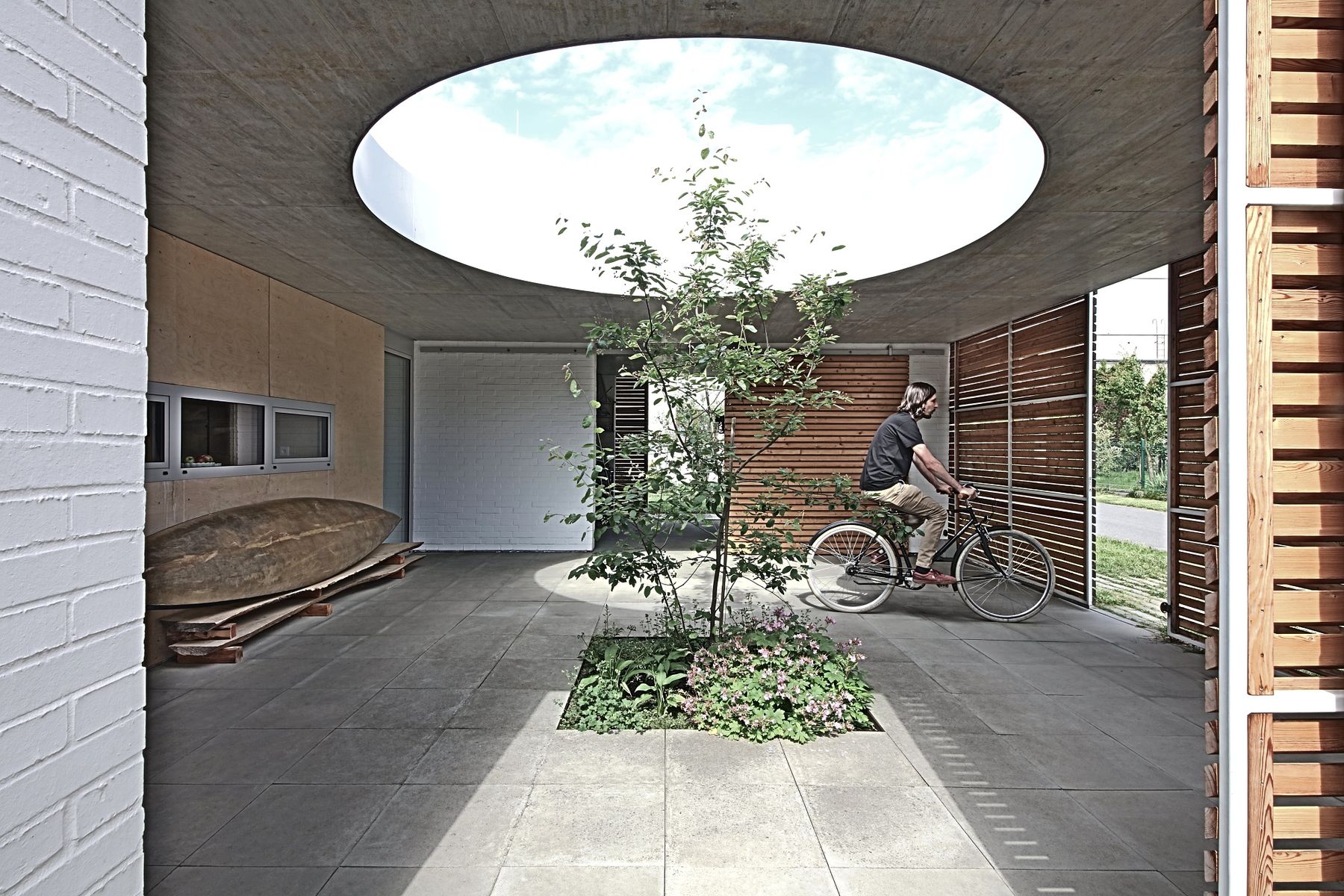 Po stranách jsou dva cihelné bloky, jeden s ložnicí otevřenou do atria se saunou, druhý s dětskými pokoji a kůlnou. Mezi nimi proplouvá denní život. Od ulice vstupním nádvořím se stromkem a krytým stáním, kolem kuchyně a koupelen do obýváku s jídelnou až na terasu do zahrady.