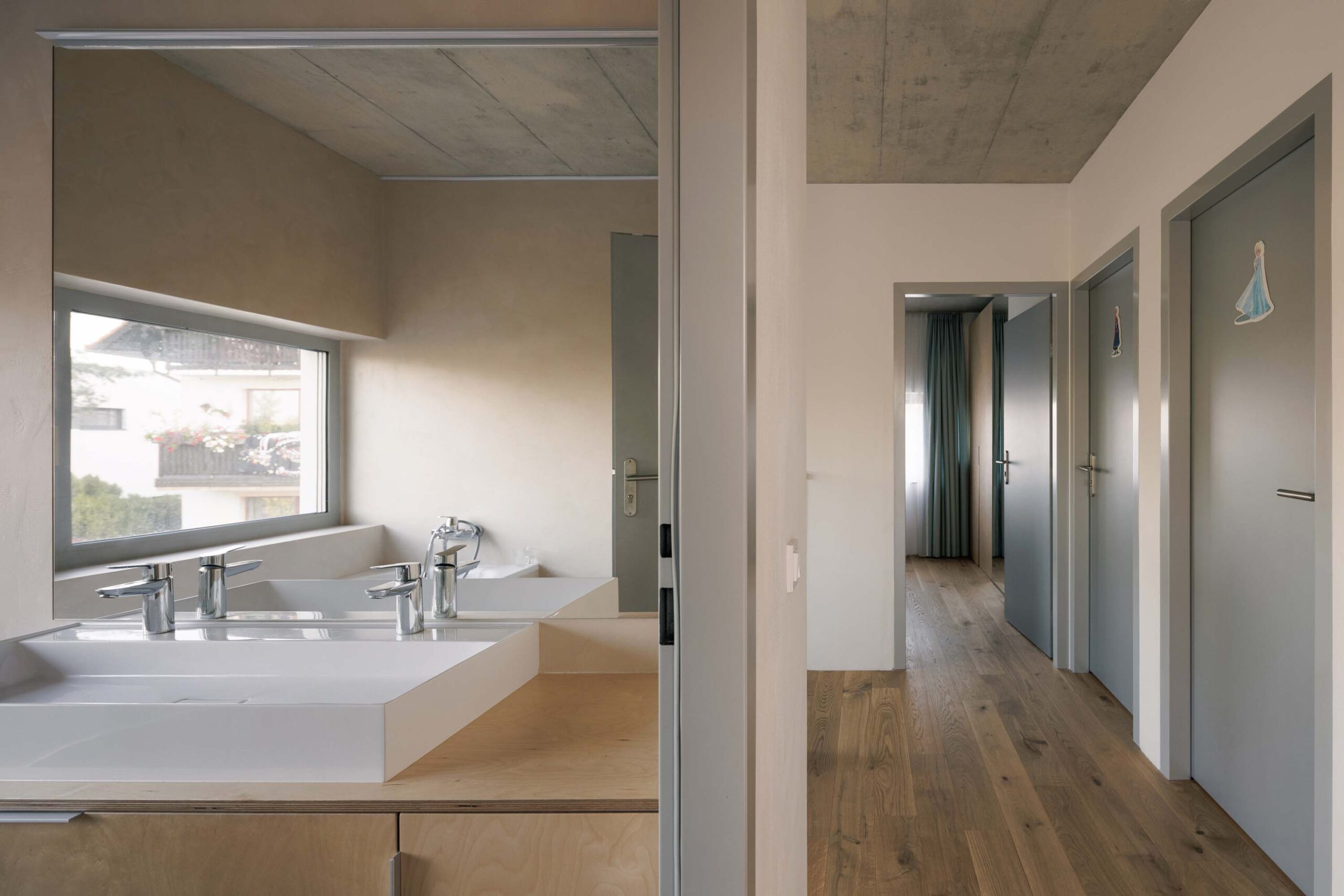 Hlavní obytný prostor je významným těžištěm domu a je vymezen vstupní částí s předsíní, pracovnou, schodišťovým prostorem, kuchyní a knihovnou s krbem. Vznikají tak čtyři hlavní otvory přes celou výšku prostoru, v půdoryse jemně rámované ostěním do oblouku. Hledáme příjemnou míru otevření se domu do okolní zahrady na všechny světové strany. Okna jsou vsazena hlouběji do dispozice obývacího pokoje, čímž jsou velkorysé prosklené plochy přirozeně chráněné proti přímému světlu.