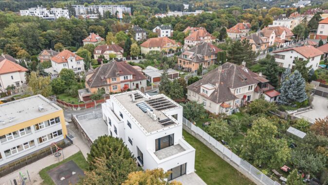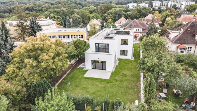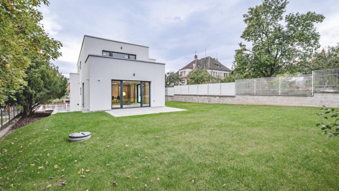 Novostavba leží na svažitém pozemku v Praze 5, na rozhraní mezi vilovými domy, občanskou vybaveností a vícepodlažní bytovou zástavbou. Návrh architektky Štěpánky Hájkové využívá konfiguraci parcely a zajišťuje propojení vnitřních a venkovních prostorů.