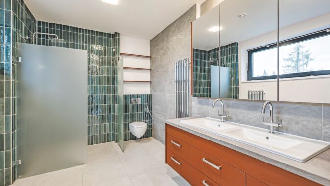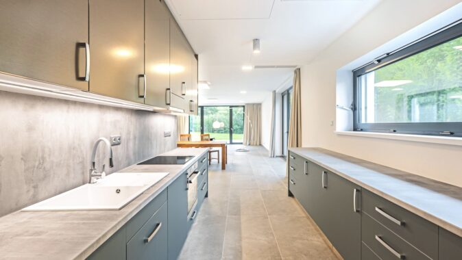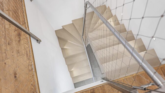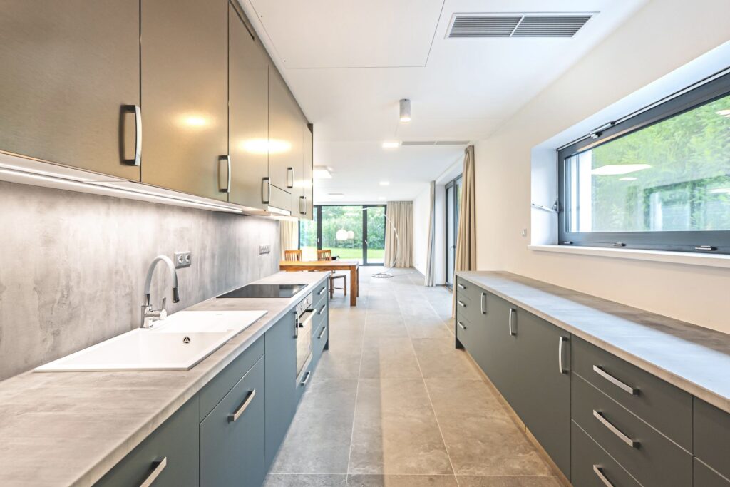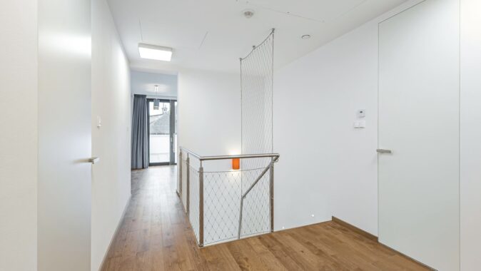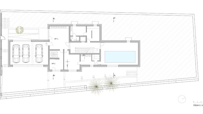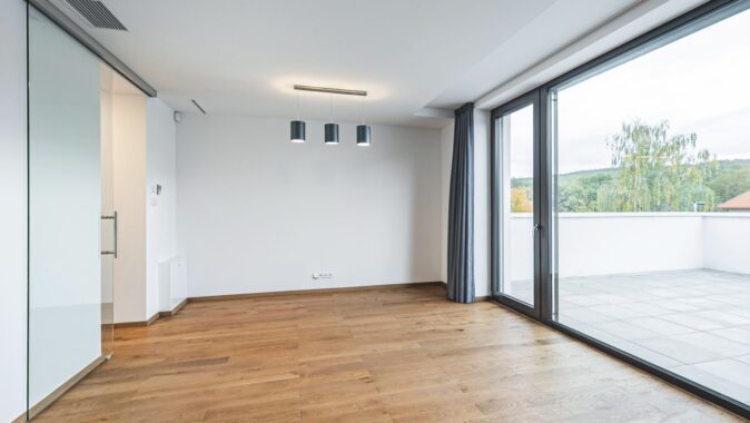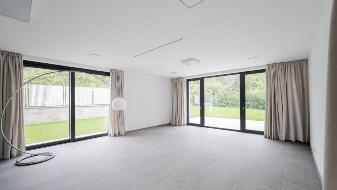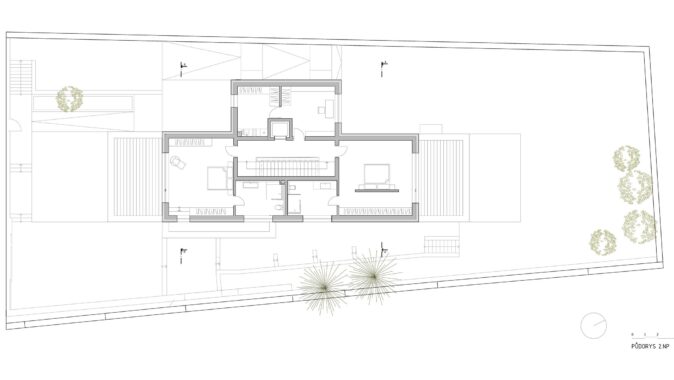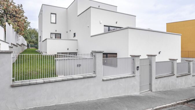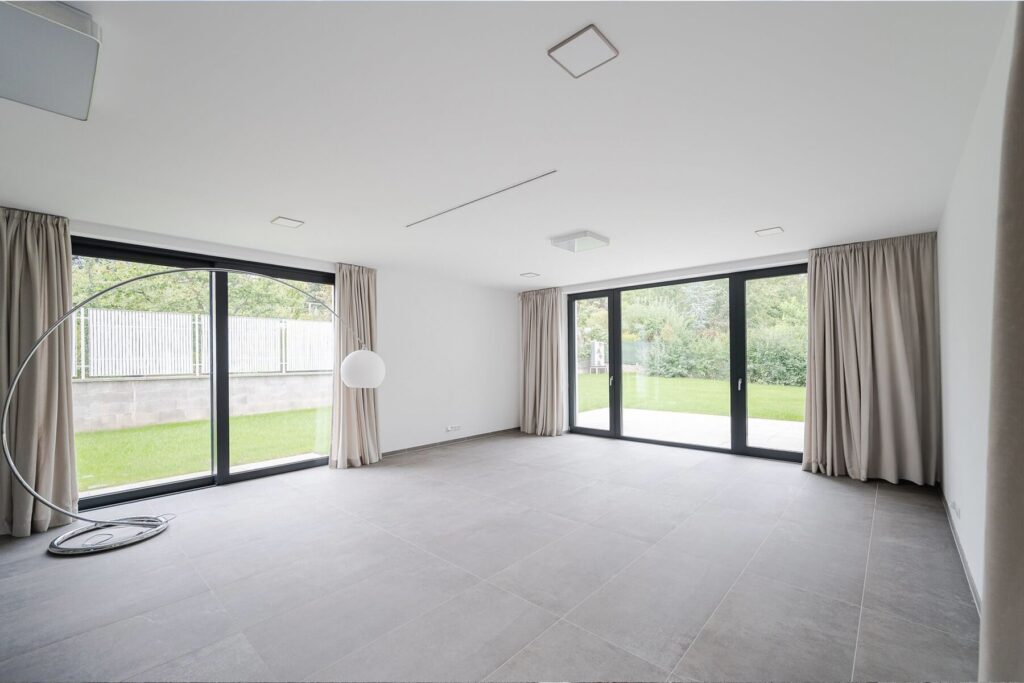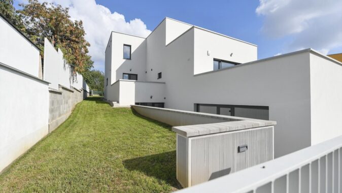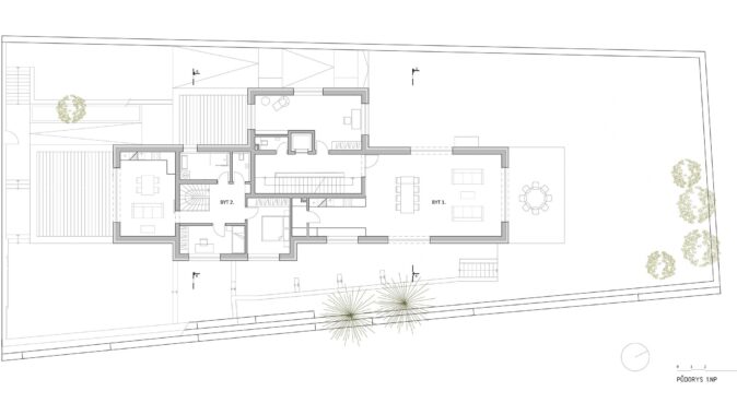 Terénní konfigurace umožnila návrh ustupujících teras, které vytvářejí přirozené propojení domu s exteriérem a poskytují přímý venkovní prostor každé obytné části. Obývací pokoj bytu č. 1 je řešen jako otevřený prostor s velkoformátovým zasklením a HS portálem vedoucím na terasu v úrovni zahrady.