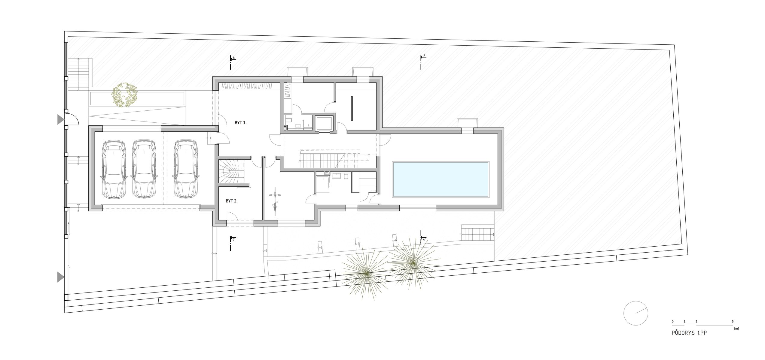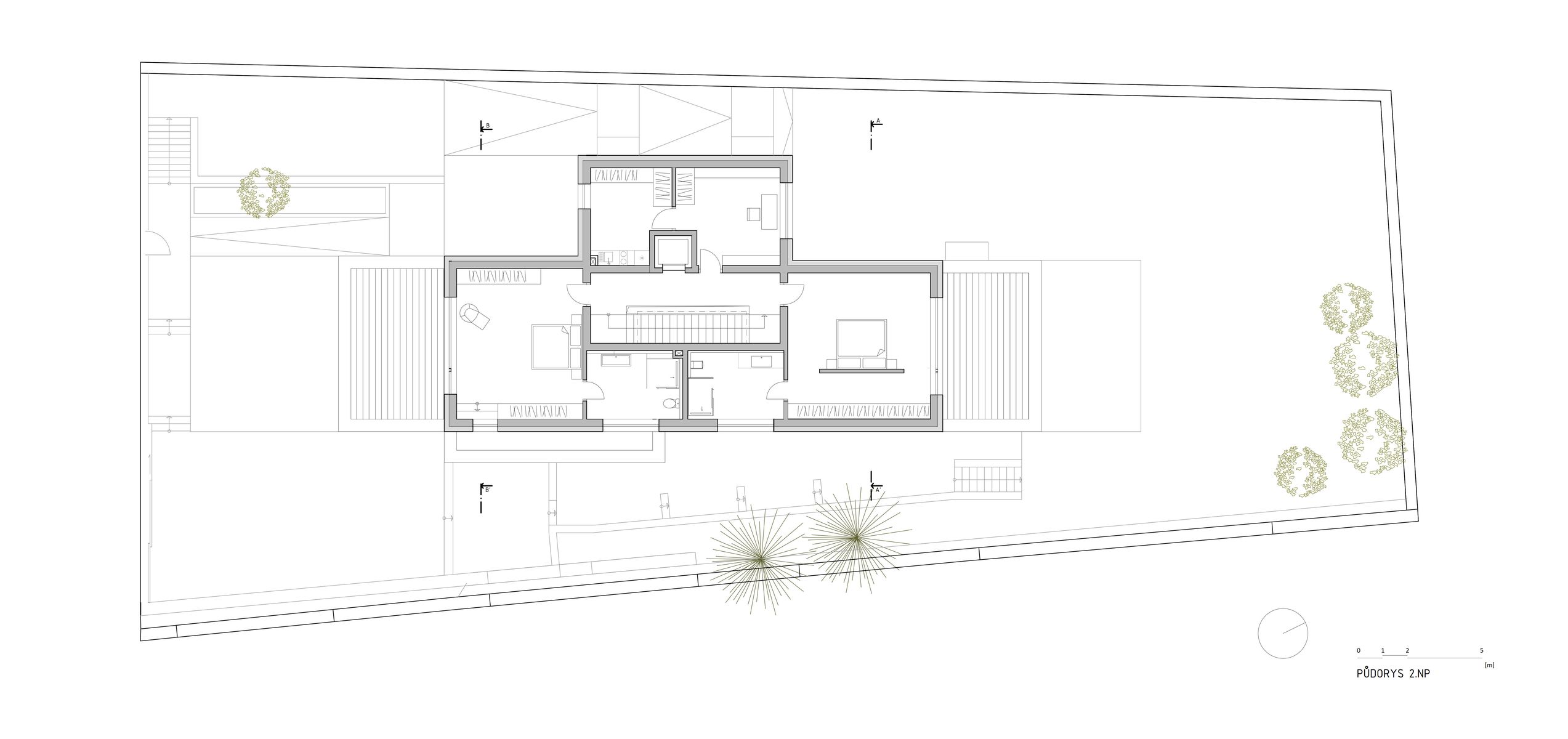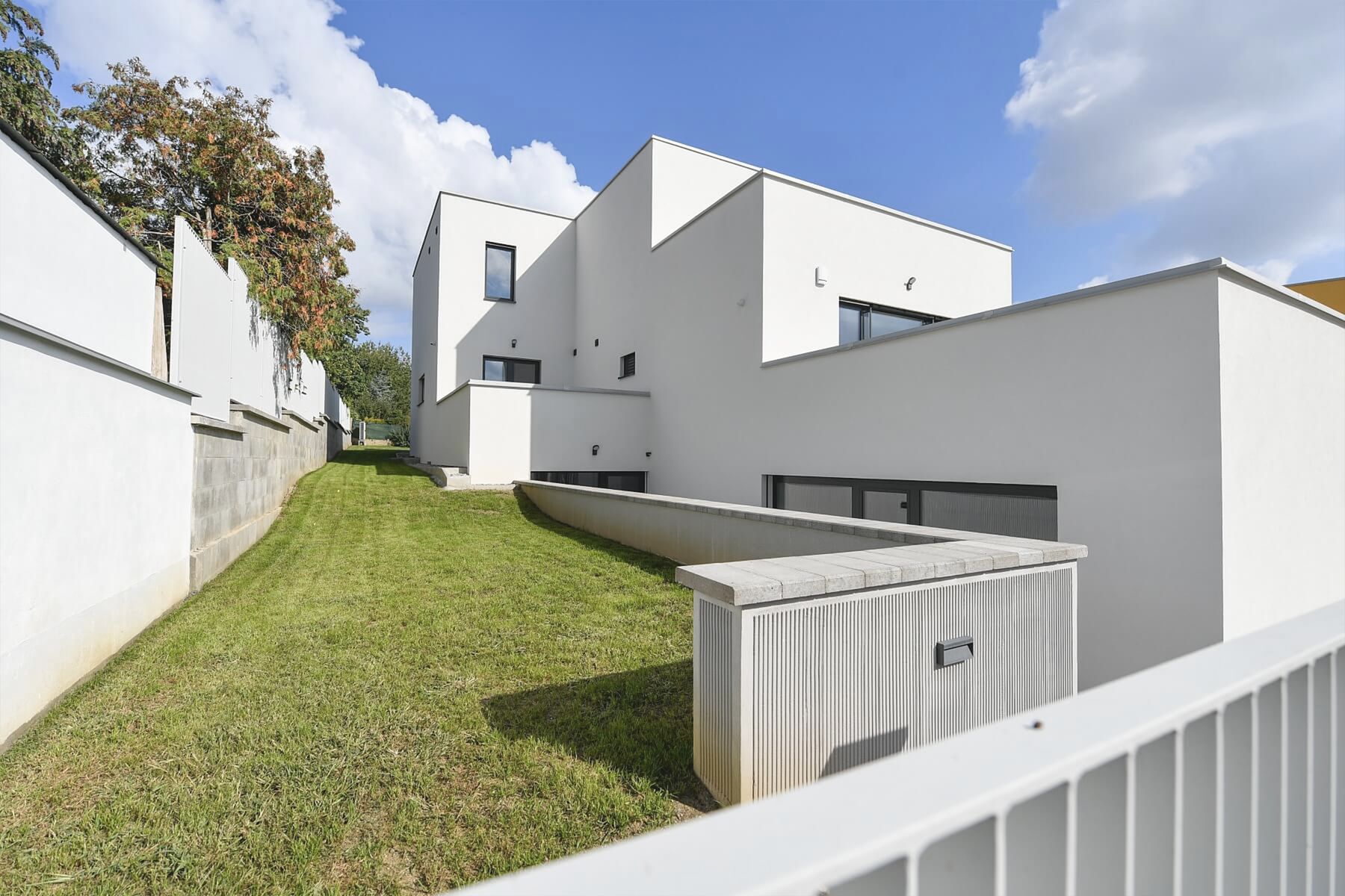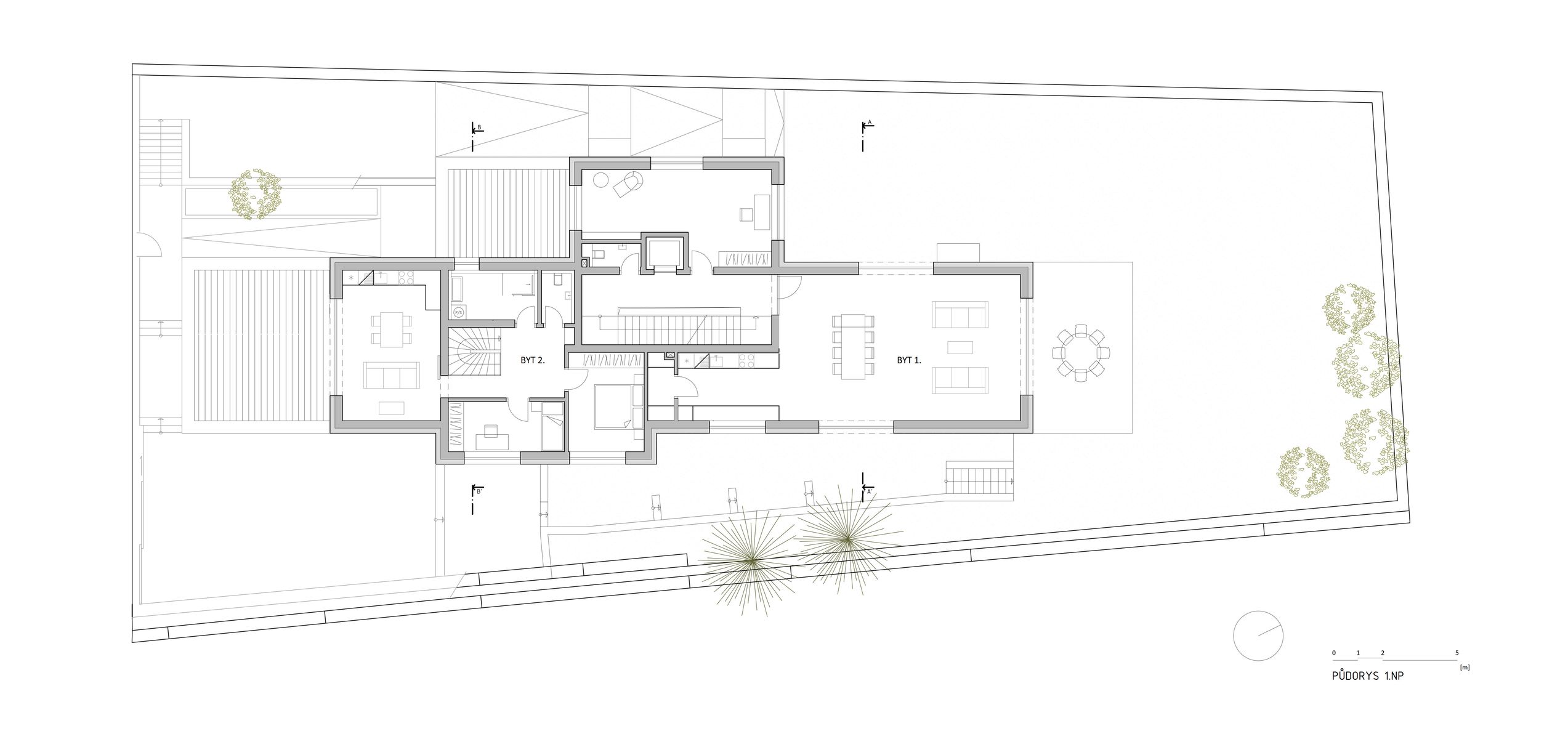 Terénní konfigurace umožnila návrh ustupujících teras, které vytvářejí přirozené propojení domu s exteriérem a poskytují přímý venkovní prostor každé obytné části. Obývací pokoj bytu č. 1 je řešen jako otevřený prostor s velkoformátovým zasklením a HS portálem vedoucím na terasu v úrovni zahrady.