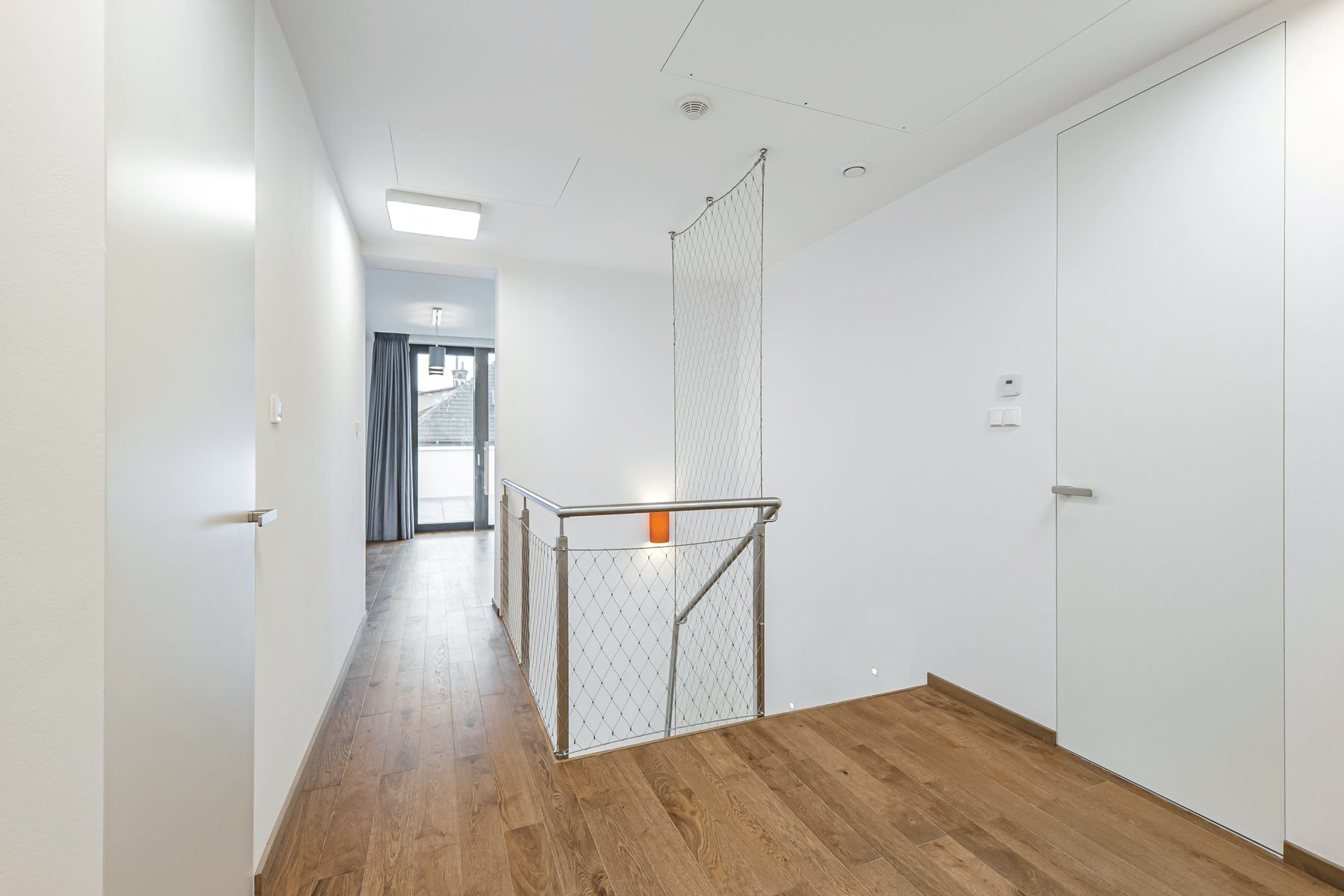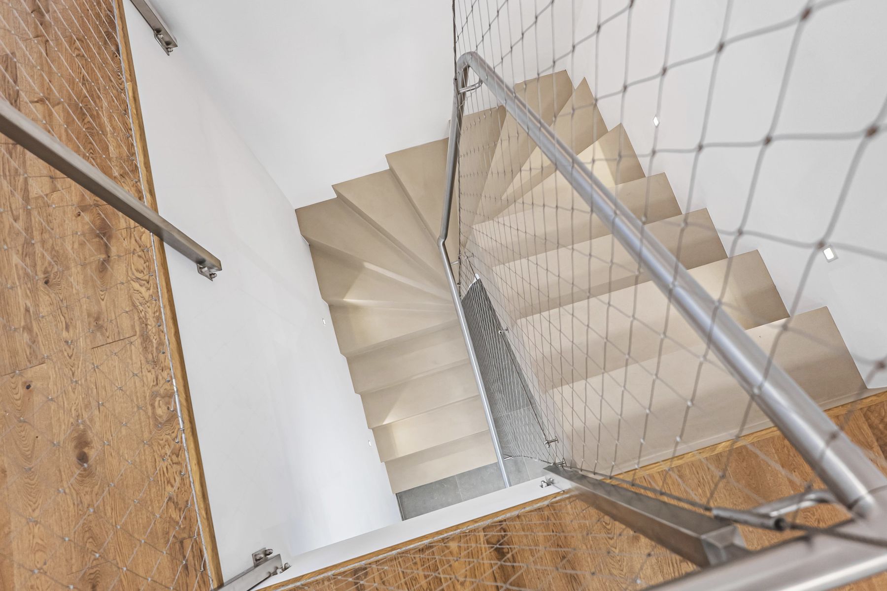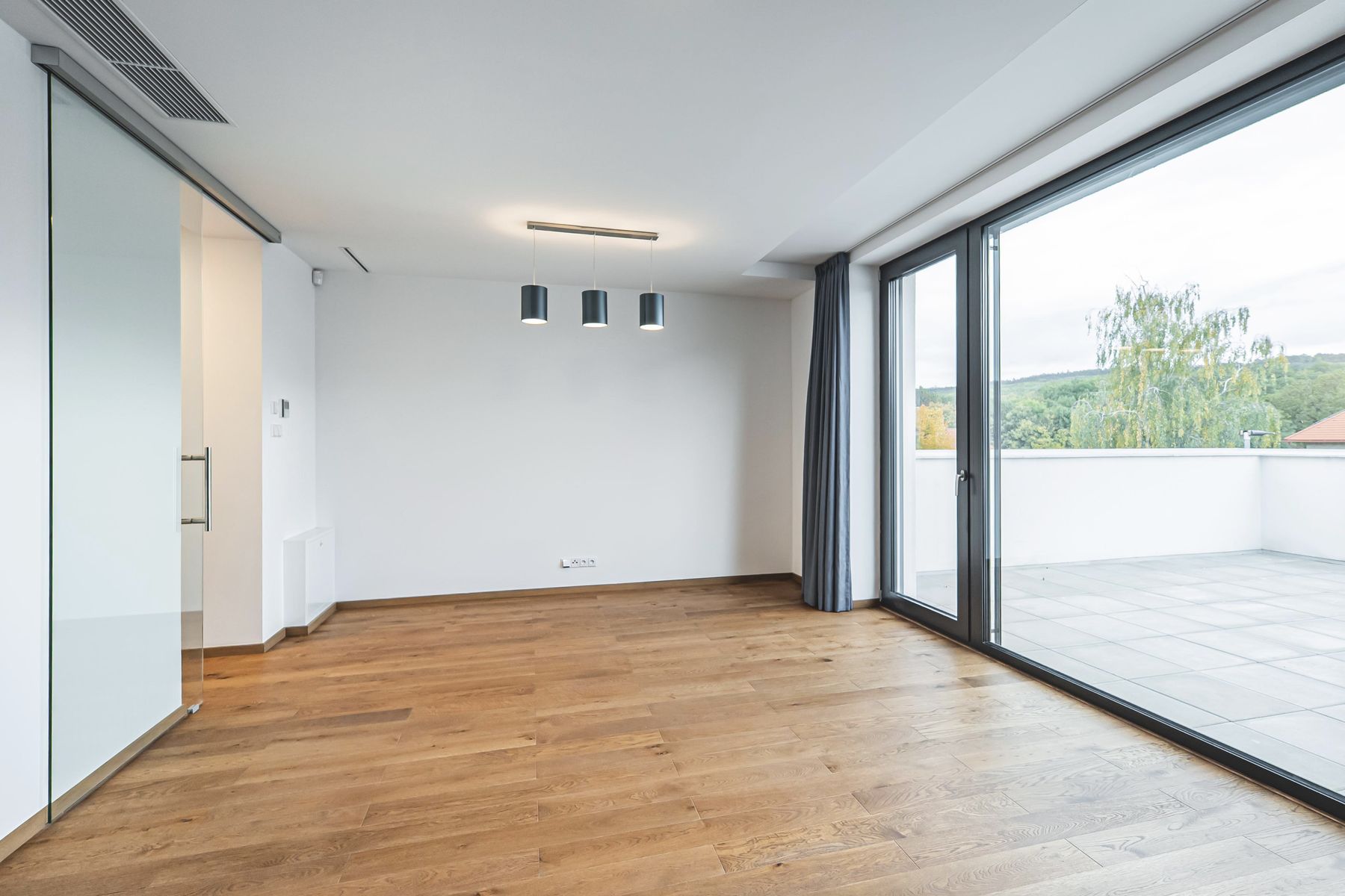 Terénní konfigurace umožnila návrh ustupujících teras, které vytvářejí přirozené propojení domu s exteriérem a poskytují přímý venkovní prostor každé obytné části. Obývací pokoj bytu č. 1 je řešen jako otevřený prostor s velkoformátovým zasklením a HS portálem vedoucím na terasu v úrovni zahrady.