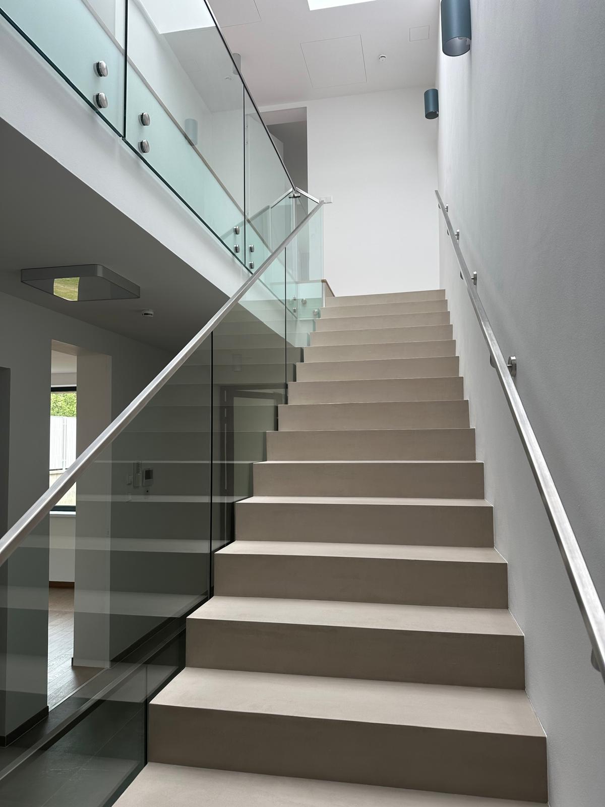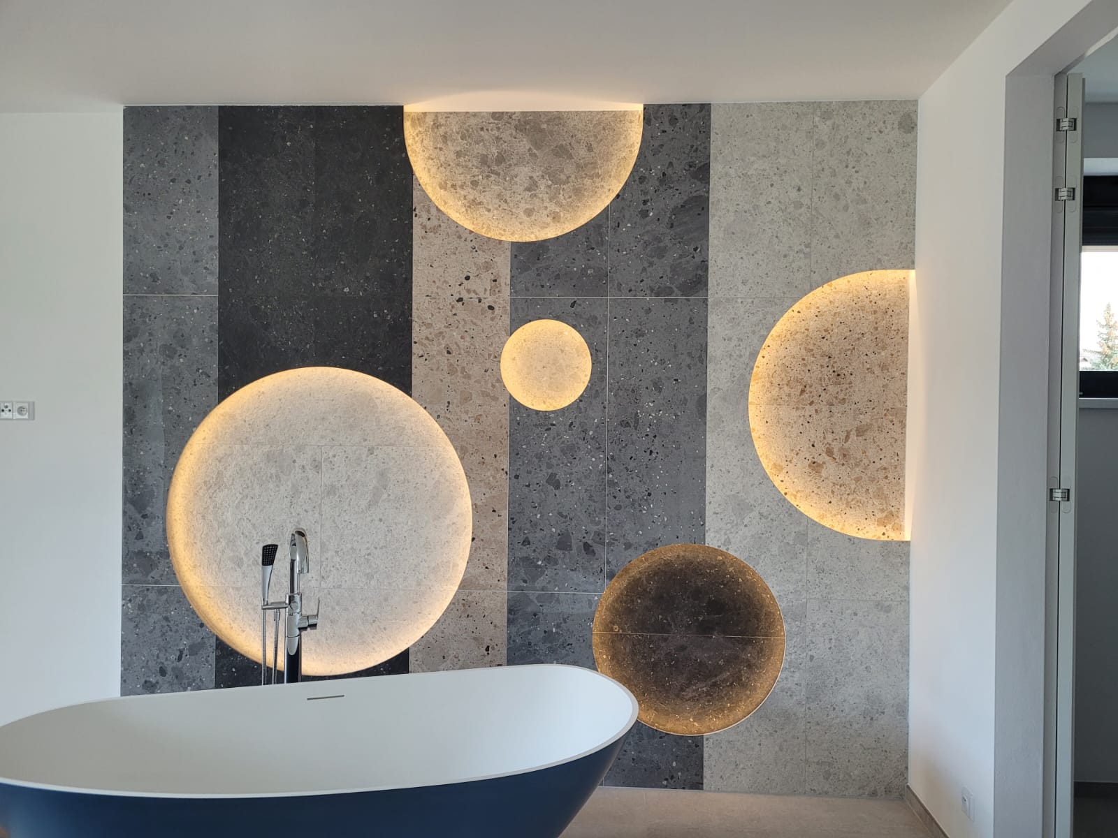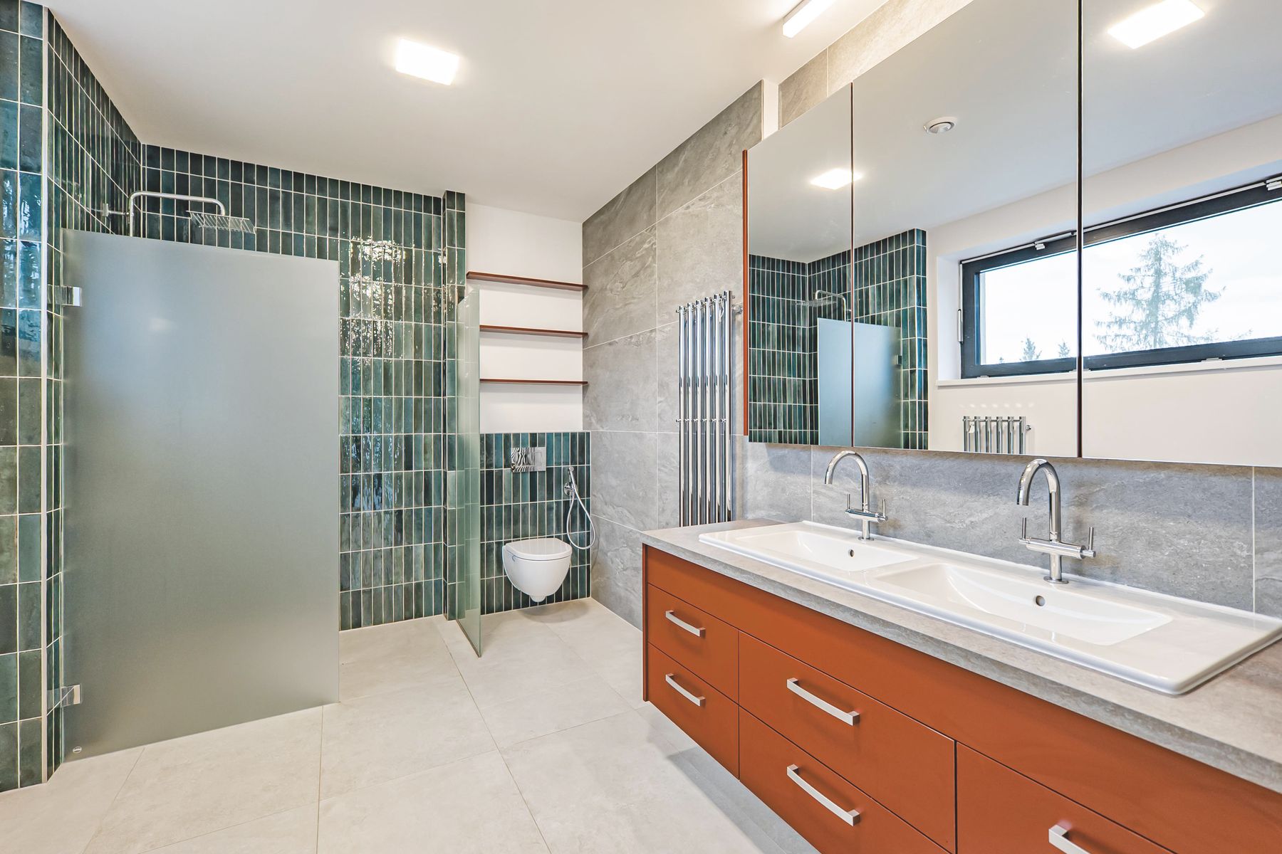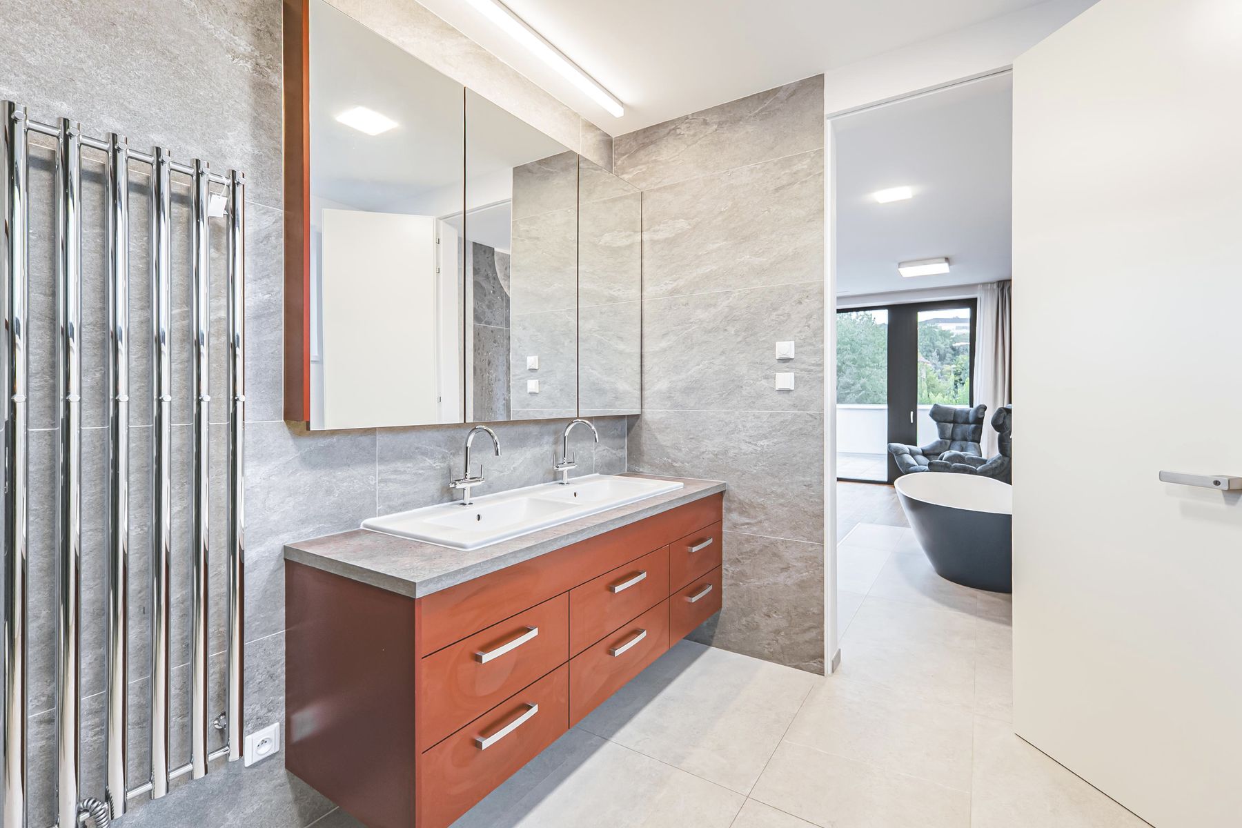 Terénní konfigurace umožnila návrh ustupujících teras, které vytvářejí přirozené propojení domu s exteriérem a poskytují přímý venkovní prostor každé obytné části. Obývací pokoj bytu č. 1 je řešen jako otevřený prostor s velkoformátovým zasklením a HS portálem vedoucím na terasu v úrovni zahrady.