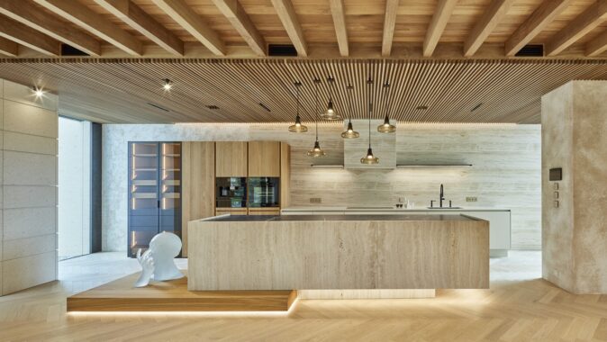 Celý dům, byt na zahradě, je koncipovaný jako jeden plynoucí prostor z interiéru přes terasy do exteriéru, a to především proto, že víme, že bydlení nekončí doma. Příjemnou atmosféru interiéru podtrhují použité jemné přírodní materiály. Dubové podlahy, béžové stěrky, travertin, medové lamelové podhledy. Do detailu vyladěná kuchyňská část, pocitově oddělená od zbytku obytného prostoru kuchyňským ostrůvkem. Masivní jídelní stůl orámovaný černými ikonickými židlemi, který je možné od části se sedací soupravou oddělit posuvnou lamelovou stěnou. Nenápadně krásná architektura, ve které se skvěle bydlí.