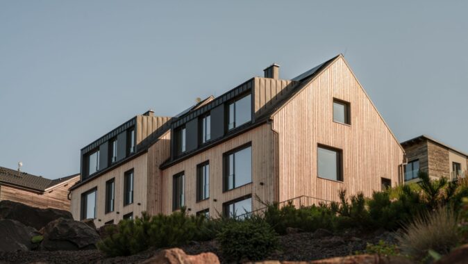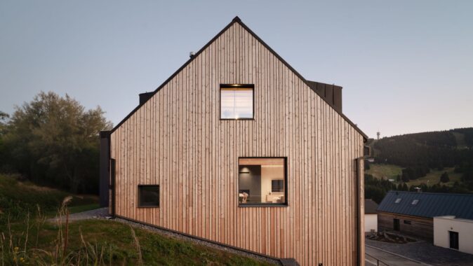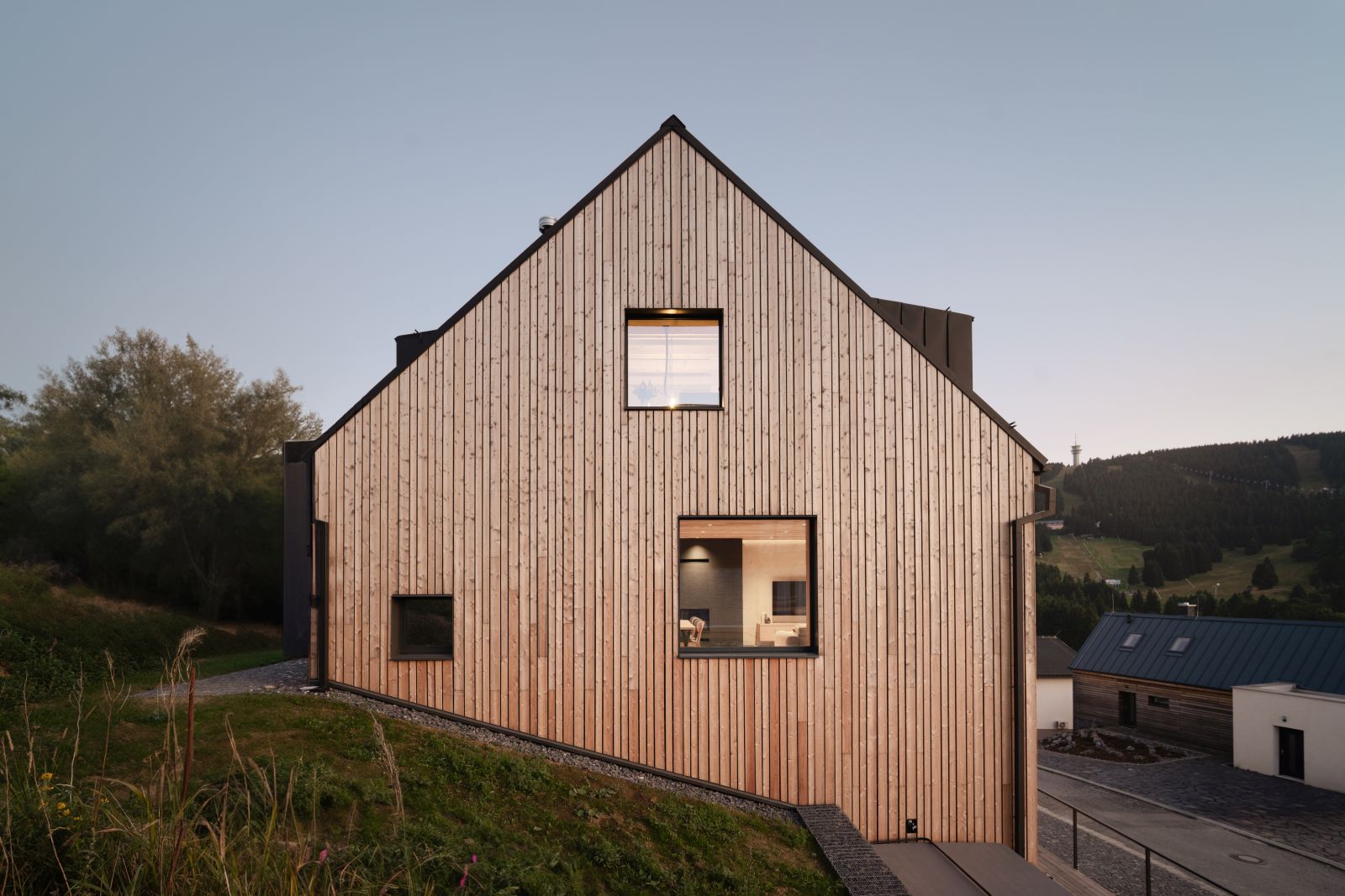 Ve stínu Krušných hor, kde každá stavba podléhá výzvám krajiny i klimatu, stojí dvojdům podle návrhu ateliéru BekArch. Klíčovou inspirací návrhu byly pohledy do okolní krajiny.