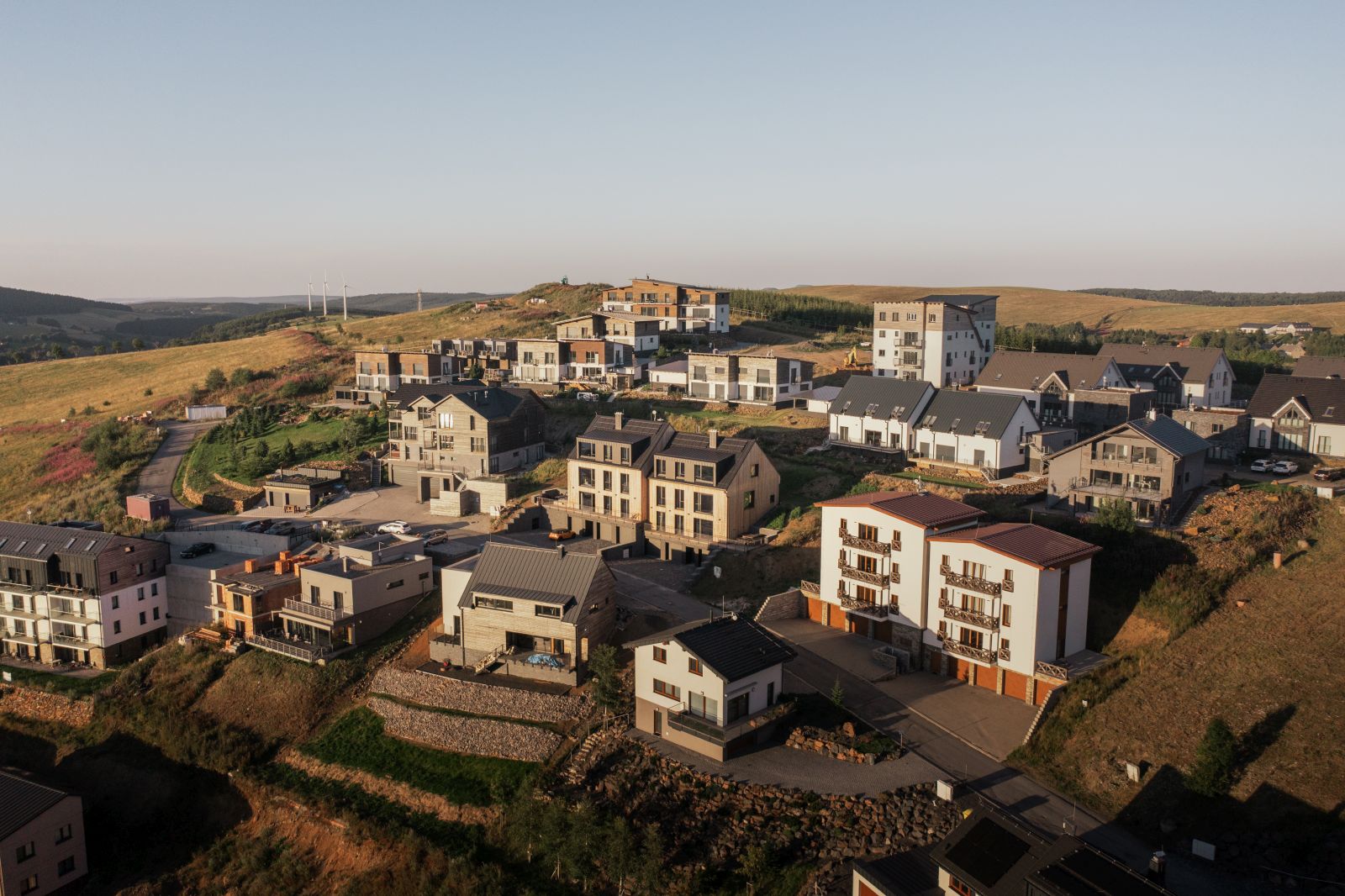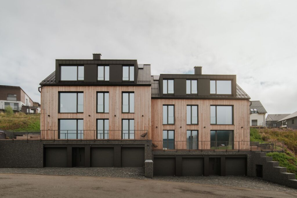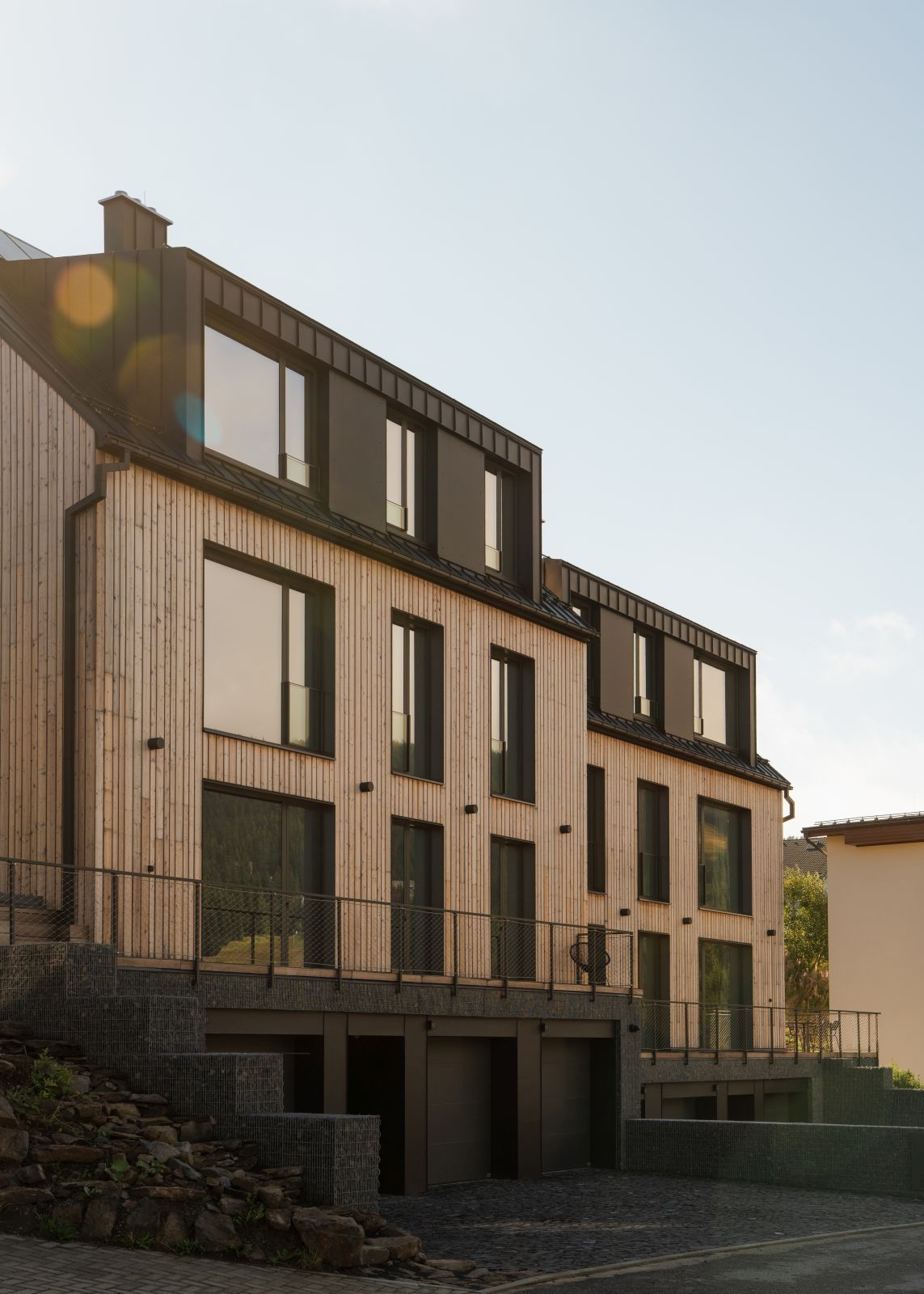 V suterénu obou domů se nacházejí garáže a technické zázemí. Přízemní byty jsou v přímém kontaktu s terénem, podél celé délky bytové jednotky je možné využít k odpočinku soukromou terasu s vířivkou. Architekti zvolili speciální terasovou dřevinu thermojasan. První patro disponuje vlastním zadním vstupem na zahradu. Podkrovní byty nabízejí kouzlo starých chalup, interpretované moderním jazykem. Stropy s přiznanými krovy a velké plochy prosklení vytvářejí prostor, ve kterém se naplno ukazuje ústřední motiv celého domu – výhled.