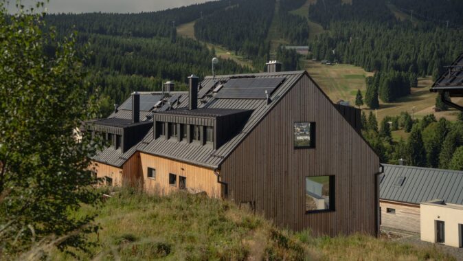 Návrh dvojdomu byl od počátku formován jeho lokalitou – horským prostředím, které klade na stavbu specifické technické i estetické nároky. Architekti proto přizpůsobili podobu domu nejen panoramatům, ale také klimatickým podmínkám, jež určily výběr materiálů i konstrukční řešení. Dřevěný obklad umožňuje stavbě splynout s okolní krajinou. Nepravidelný rytmus prken dvou šířek se propisuje i do interiéru, a to v podobě podlah, či stěn společných prostor. Suterénní podlaží naopak kombinuje plechový obklad a gabionové koše.