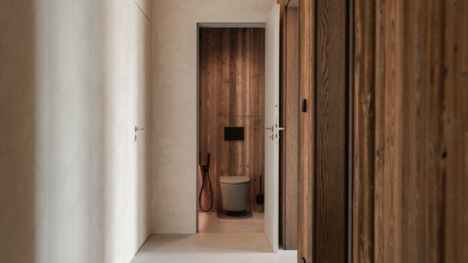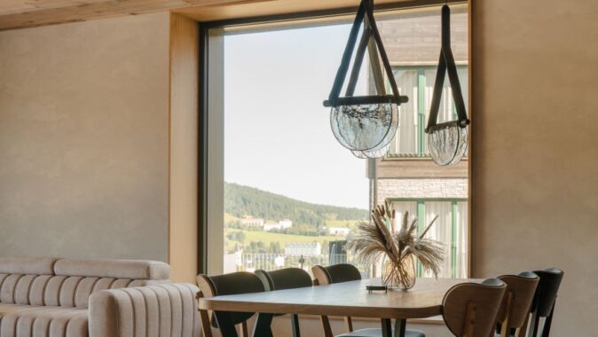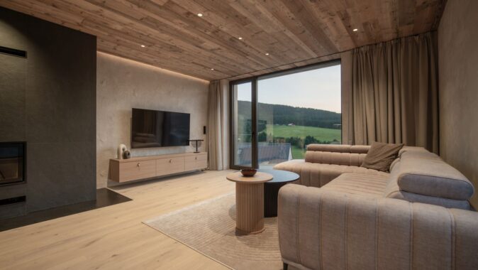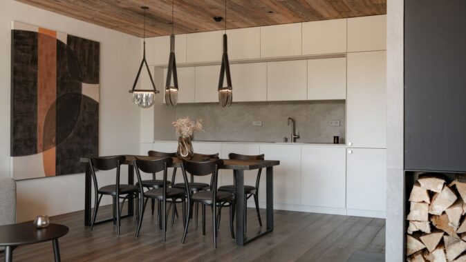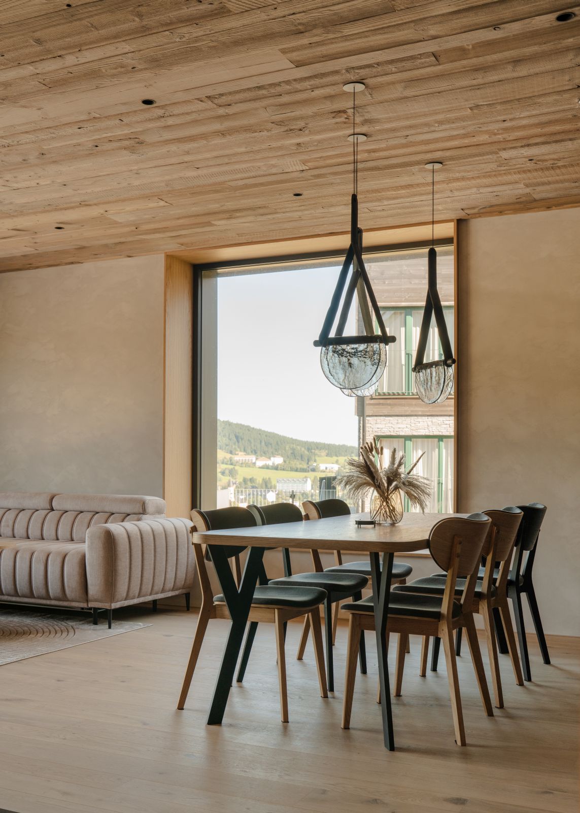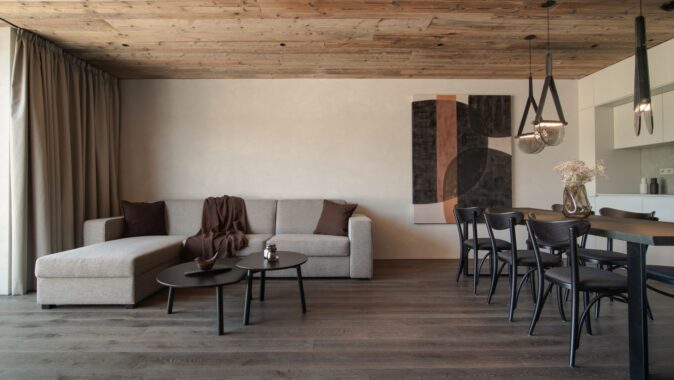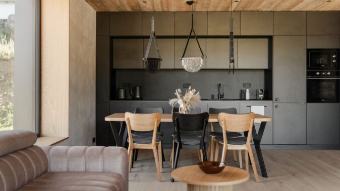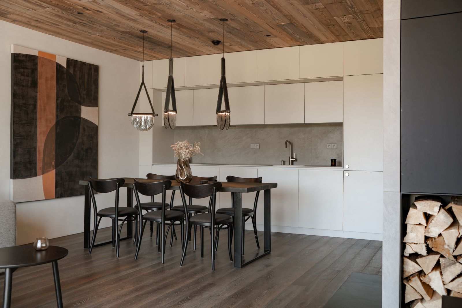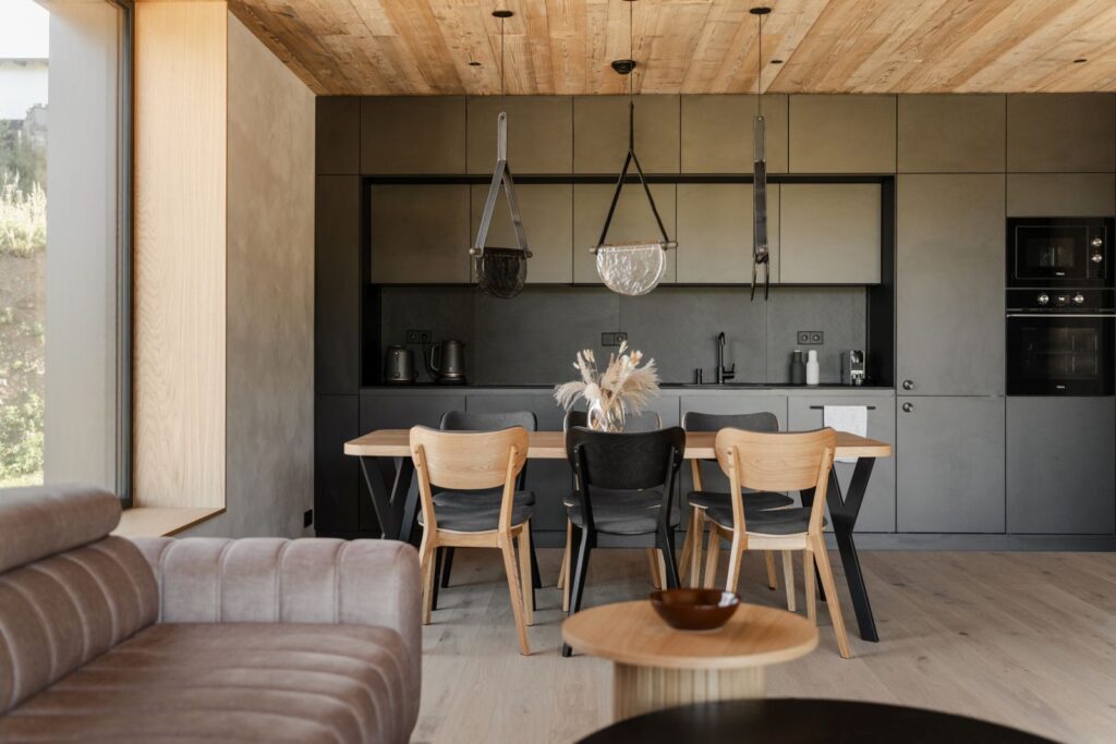 Hlavní obytný prostor je příkladem minimalistického designu, který stojí na harmonii přírodních materiálů, čistých linií a tlumené barevnosti. Propojuje kuchyň, jídelnu a obývací část do jednoho plynulého celku, aniž by jednotlivé zóny ztrácely vlastní charakter. Opět zde dominují zemité tóny a přírodní dřevo, které společně vytvářejí klidnou, vyváženou atmosféru. Praktický jídelní stůl, k němuž se pohodlně vejde i větší společnost, zaujme robustní dřevěnou deskou a kovovým podnožím.