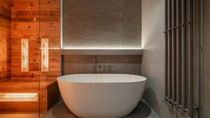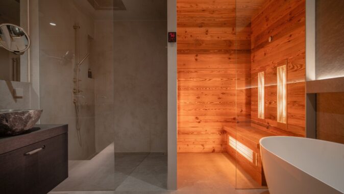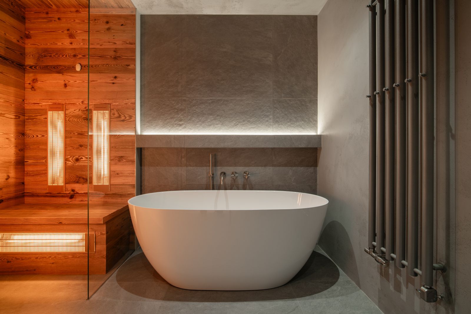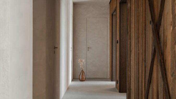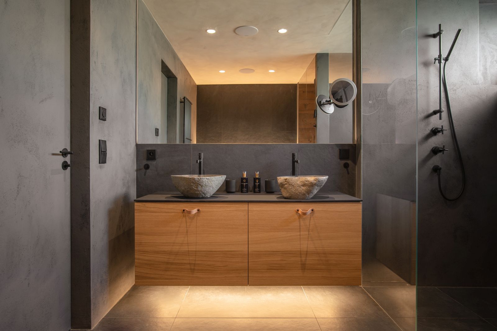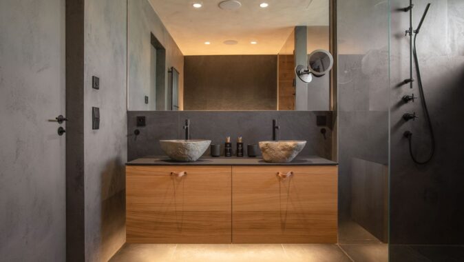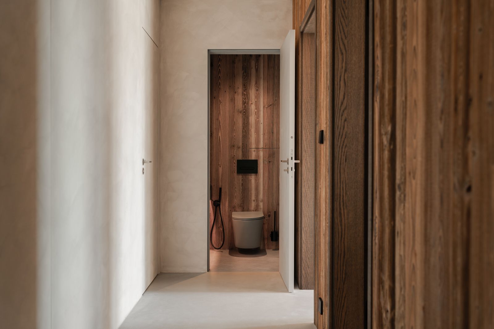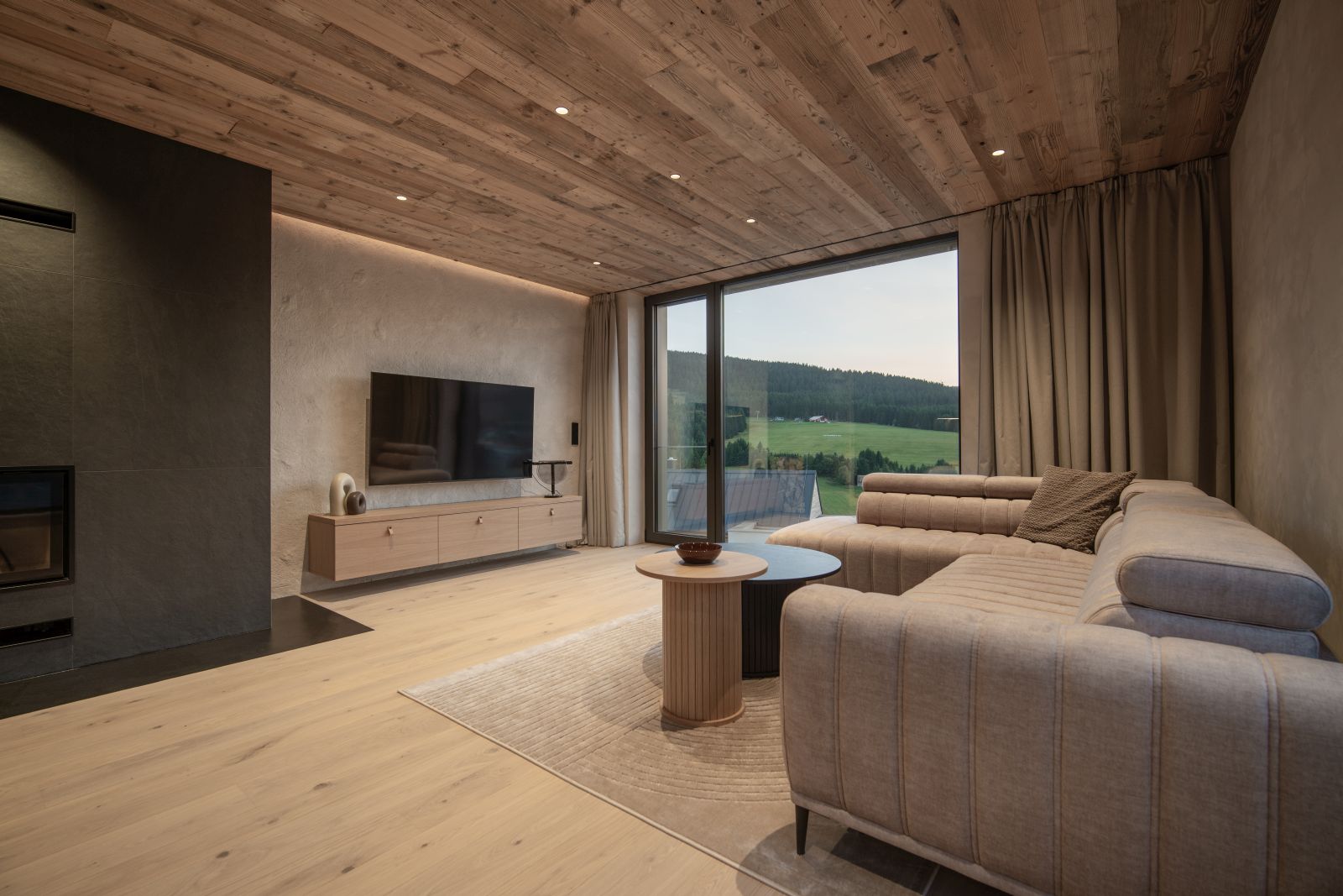 Hlavní obytný prostor je příkladem minimalistického designu, který stojí na harmonii přírodních materiálů, čistých linií a tlumené barevnosti. Propojuje kuchyň, jídelnu a obývací část do jednoho plynulého celku, aniž by jednotlivé zóny ztrácely vlastní charakter. Opět zde dominují zemité tóny a přírodní dřevo, které společně vytvářejí klidnou, vyváženou atmosféru. Praktický jídelní stůl, k němuž se pohodlně vejde i větší společnost, zaujme robustní dřevěnou deskou a kovovým podnožím.