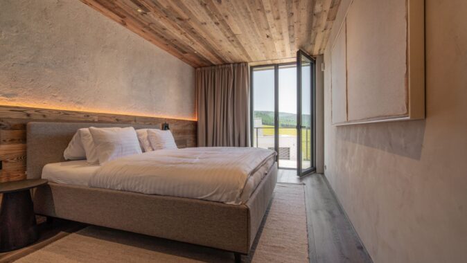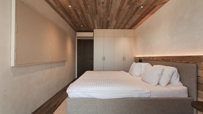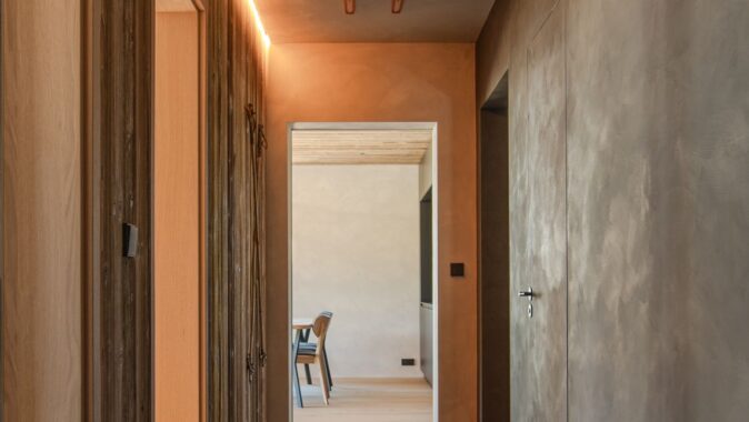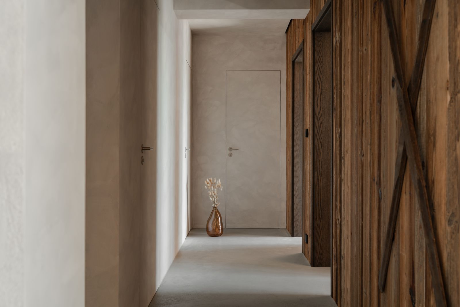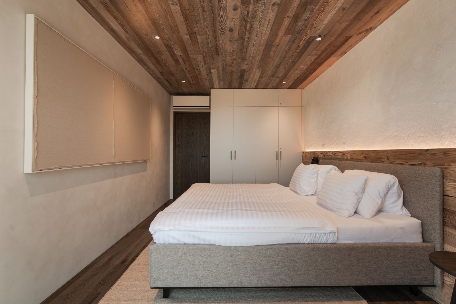Skryté bezobložkové zárubně interiérových dveří umožnily vzniknout na pohled ničím nerušenému jednolitému povrchu betonové stěrky. Z chodby lze vstoupit do dvou oddělených ložnic, koupelny i toalety. Ložnice je zařízena účelně a jednoduše. Velkoformátový okenní portál nechává vyniknout proměnlivé scenérii za sklem. Vybrané stěny interiéru, například za čelem postele či následně v hlavní obytné zóně za televizí, byly záměrně upraveny tradiční technikou nahazované vápenné omítky.