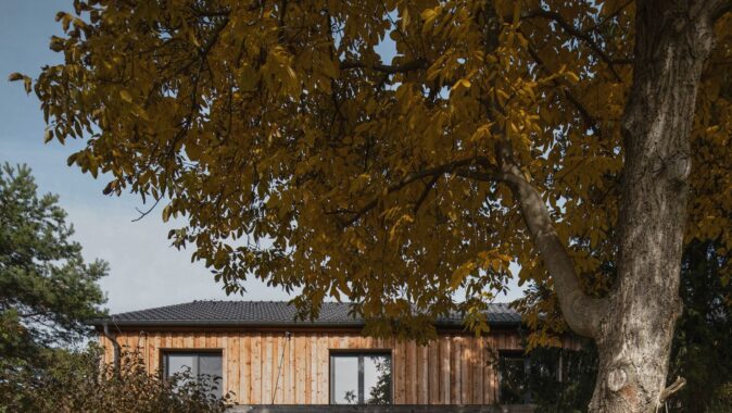 Dům v městysu Vraný od atelieru Mimosa architekti obydlel zdivočelou vzrostlou zahradu padající mezi štíty sousedních domů dolů k Vranskému potoku. Se svahem klesajícím k jihu se dům otevírá zahradě i výhledům.