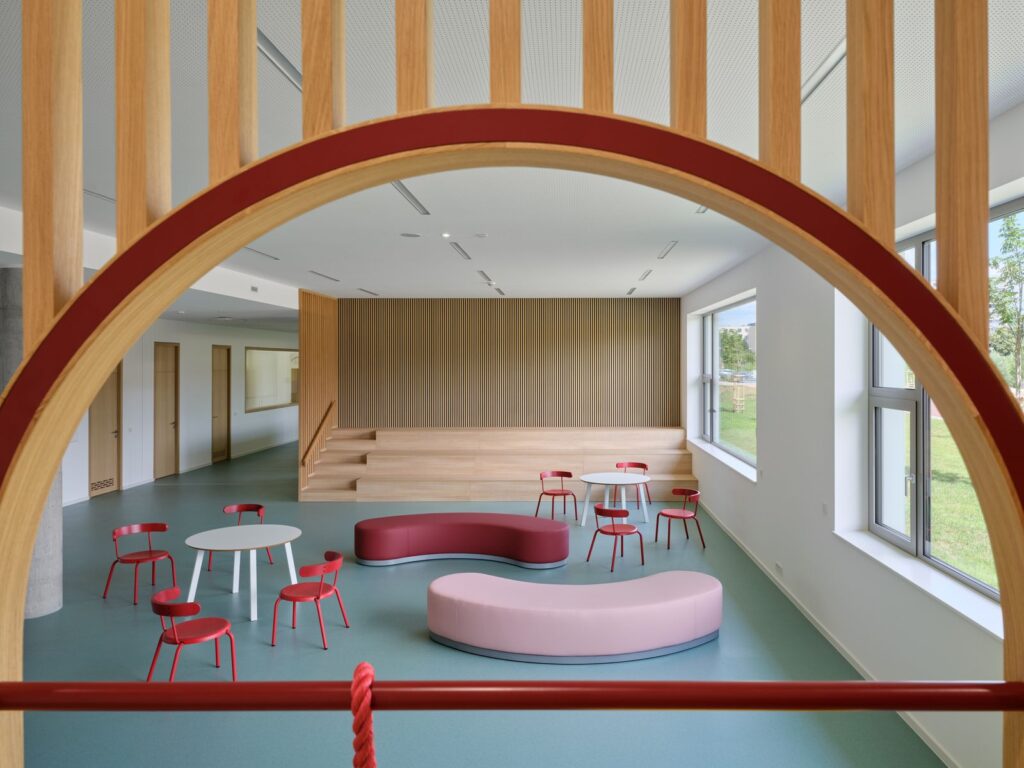 Soukromá základní a mateřská škola je navržena studiem OVA s důrazem na individualitu, kreativitu a ekologii. Zvenku hravá s fasádou z bílého vlnitého plechu, uvnitř vzdušná a reprezentativní s materiály jako dřevo a teraco. Velkoplošným prosklením se škola otevírá všudypřítomné zeleni.