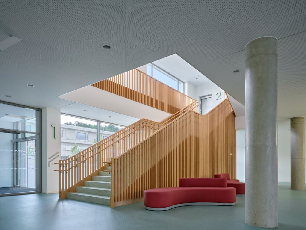 Interiér celé budovy zdůrazňuje její reprezentativní charakter, který se odráží ve zvolených materiálech, zejména ve dřevě a teracové dlažbě. Zvláštní pozornost je věnována jedinečnému životu v chodbách. Ty nabízejí velkorysé prostory s různými typy sezení a průhledy do jednotlivých učeben. Prostory chodeb jsou určeny dětem k setkávání, hře, samostudiu a rovněž poskytují příležitosti pro alternativní výuku nebo mimoškolní aktivity mimo hlavní učebny. Hlavní učebny a laboratoře jsou flexibilní, prostorné místnosti s různými typy uspořádání sezení a moderním vybavením.