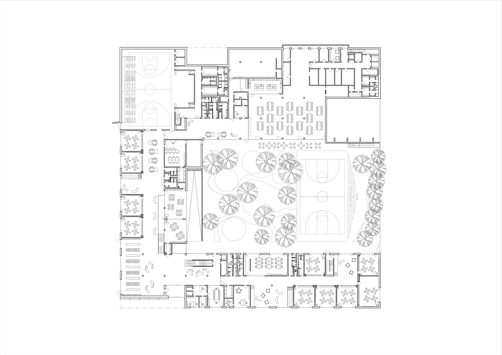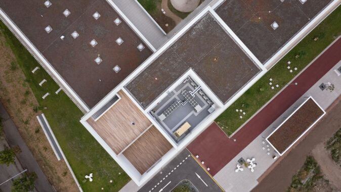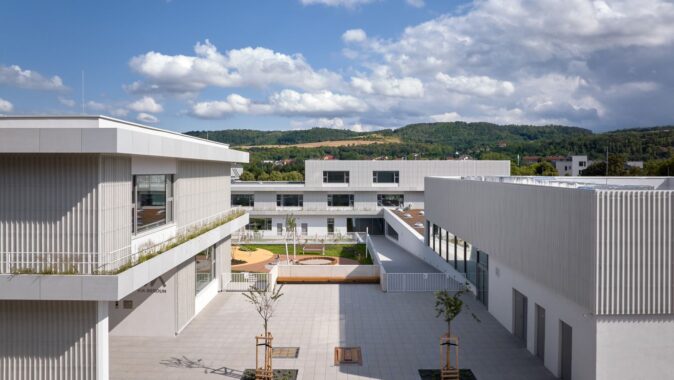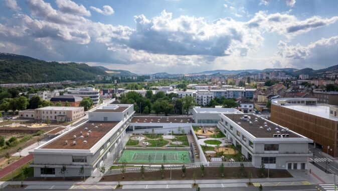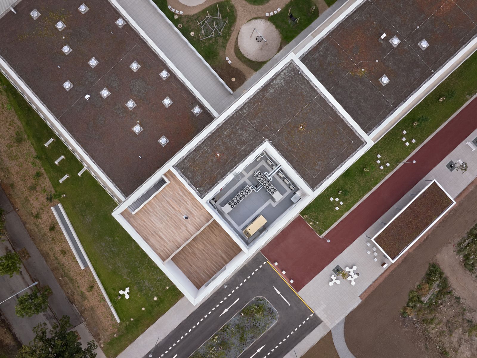 Ta prostupuje celým areálem – od centrálního atria s bohatou výsadbou, záhony a skleníkem až po přístupné střechy s intenzivní i extenzivní zelení, hřiště a navazující svah se stromy. Flexibilní prostory učeben a laboratoří propojují velkorysé prosvětlené chodby, určené hře, samostudiu i alternativní výuce, součástí zázemí je také multifunkční sál pro školní i komunitní akce. Ekologické řešení doplňují úsporné technologie a promyšlené hospodaření s vodou.