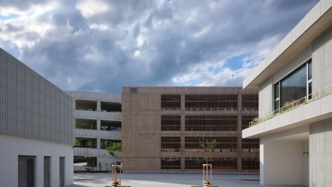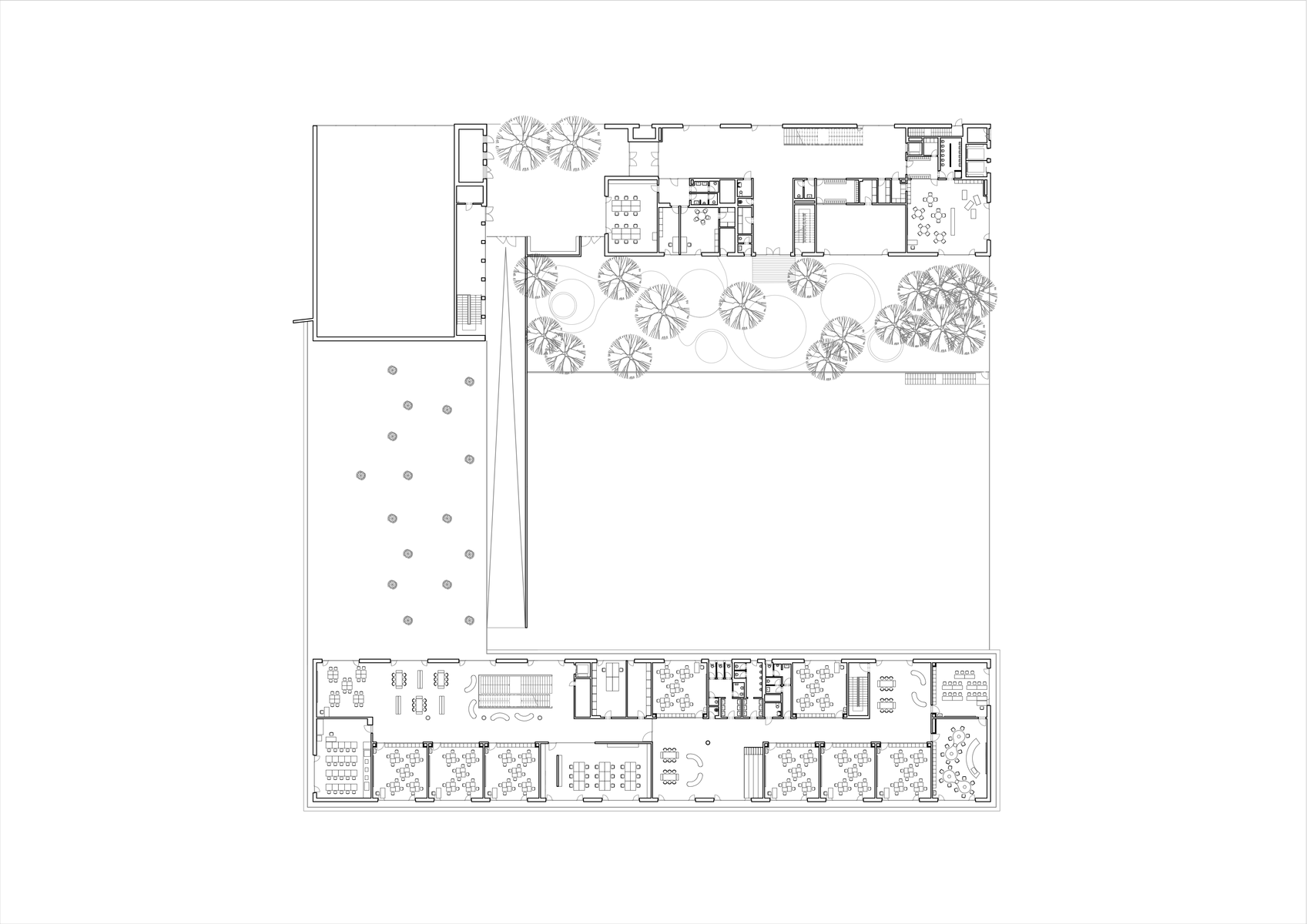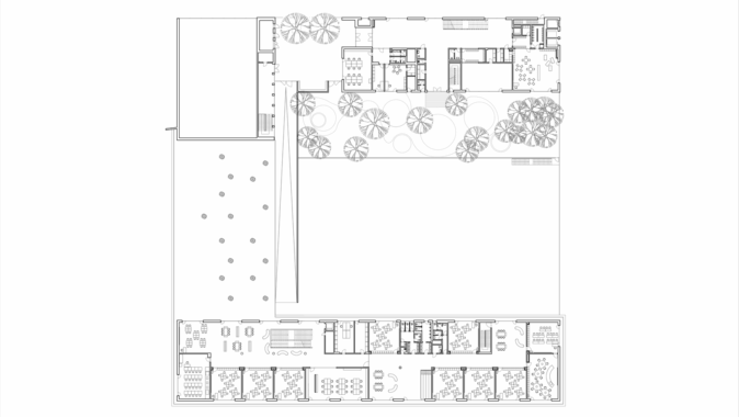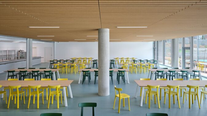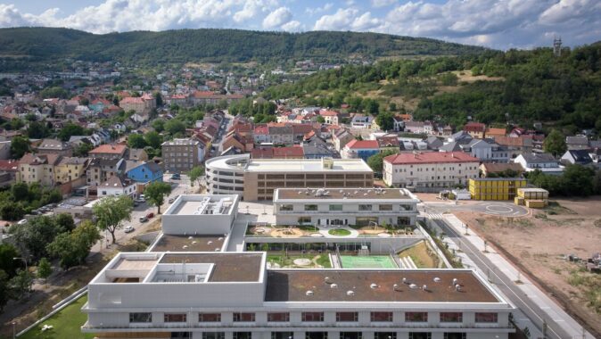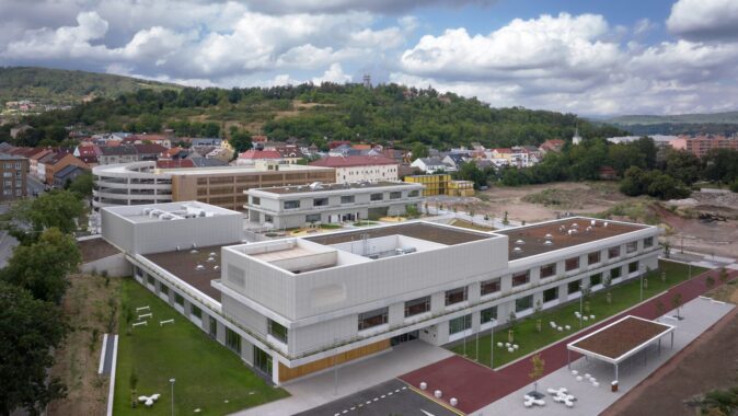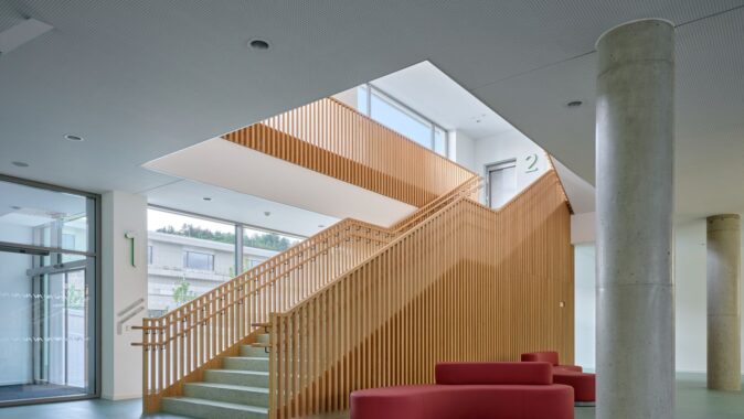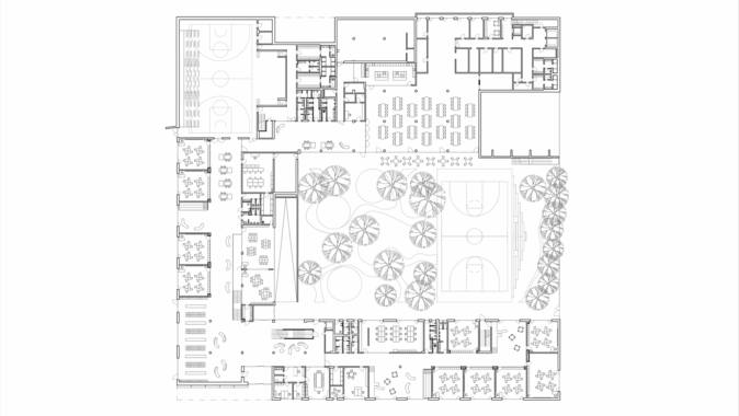 Ta prostupuje celým areálem – od centrálního atria s bohatou výsadbou, záhony a skleníkem až po přístupné střechy s intenzivní i extenzivní zelení, hřiště a navazující svah se stromy. Flexibilní prostory učeben a laboratoří propojují velkorysé prosvětlené chodby, určené hře, samostudiu i alternativní výuce, součástí zázemí je také multifunkční sál pro školní i komunitní akce. Ekologické řešení doplňují úsporné technologie a promyšlené hospodaření s vodou.