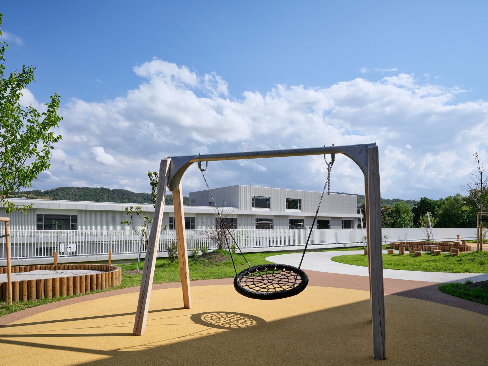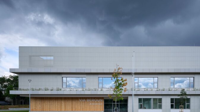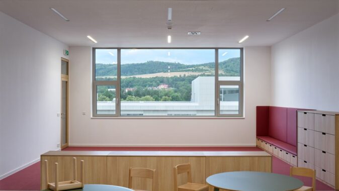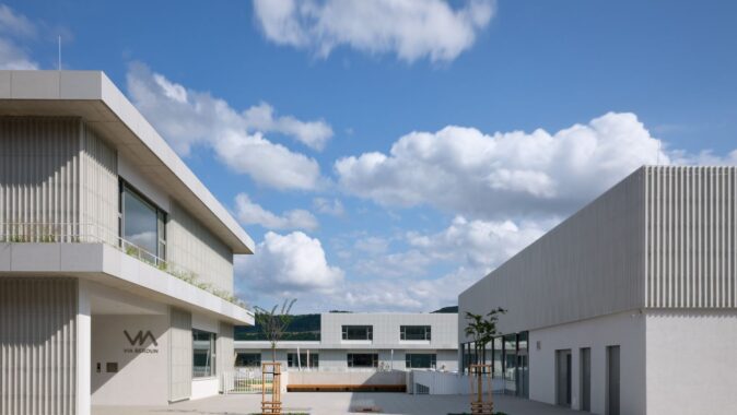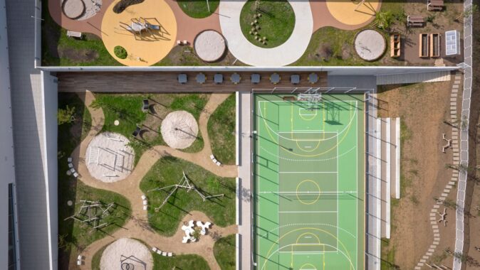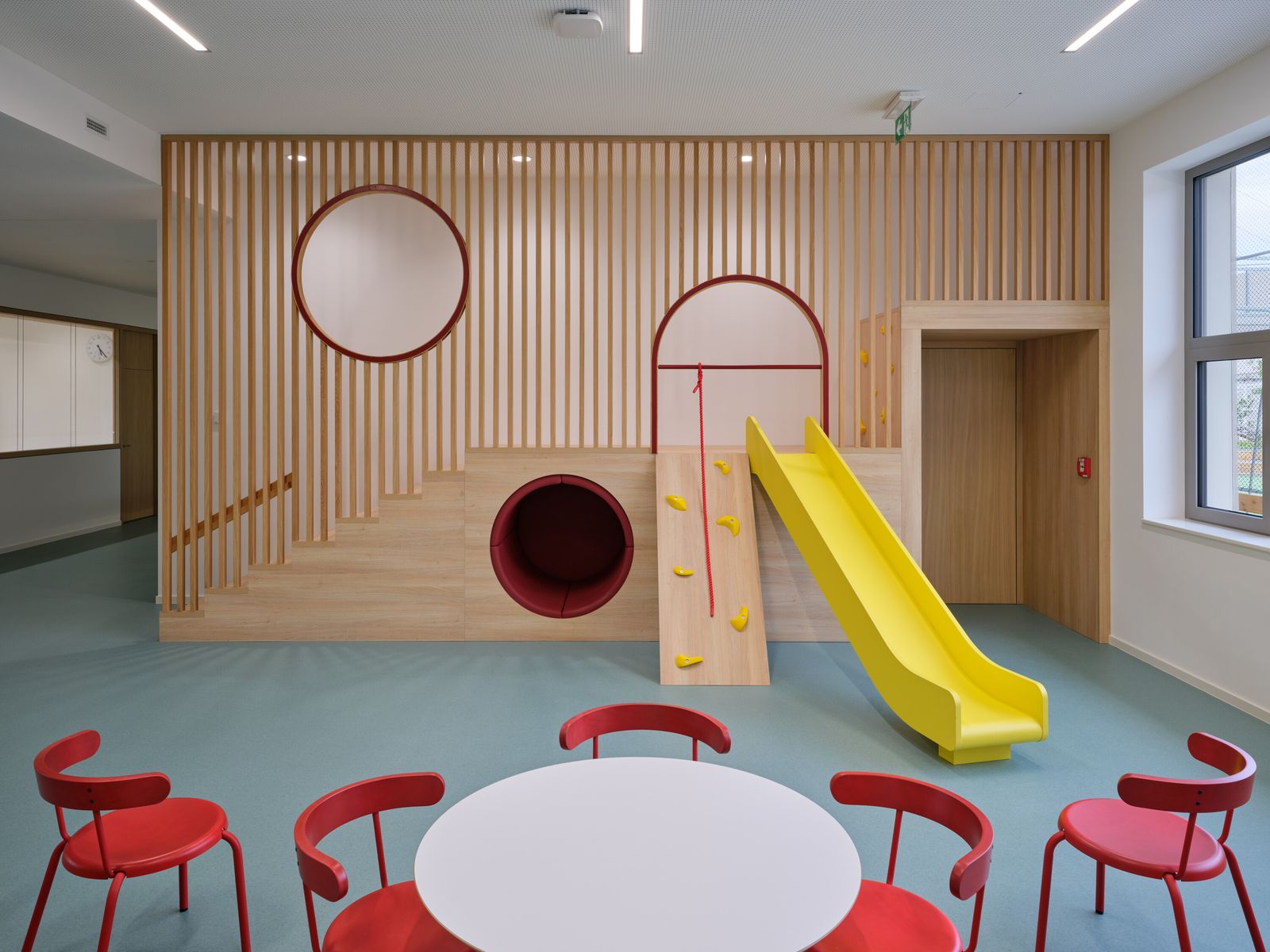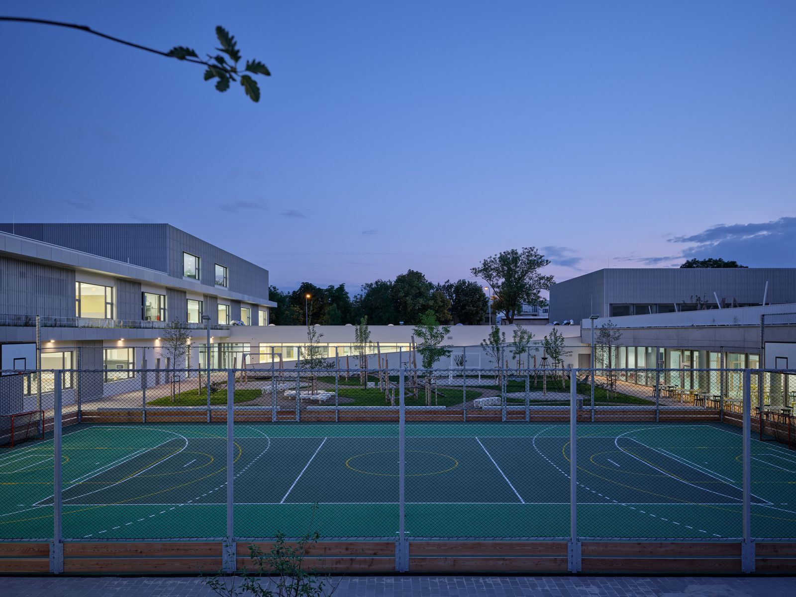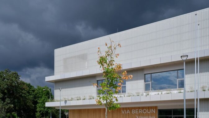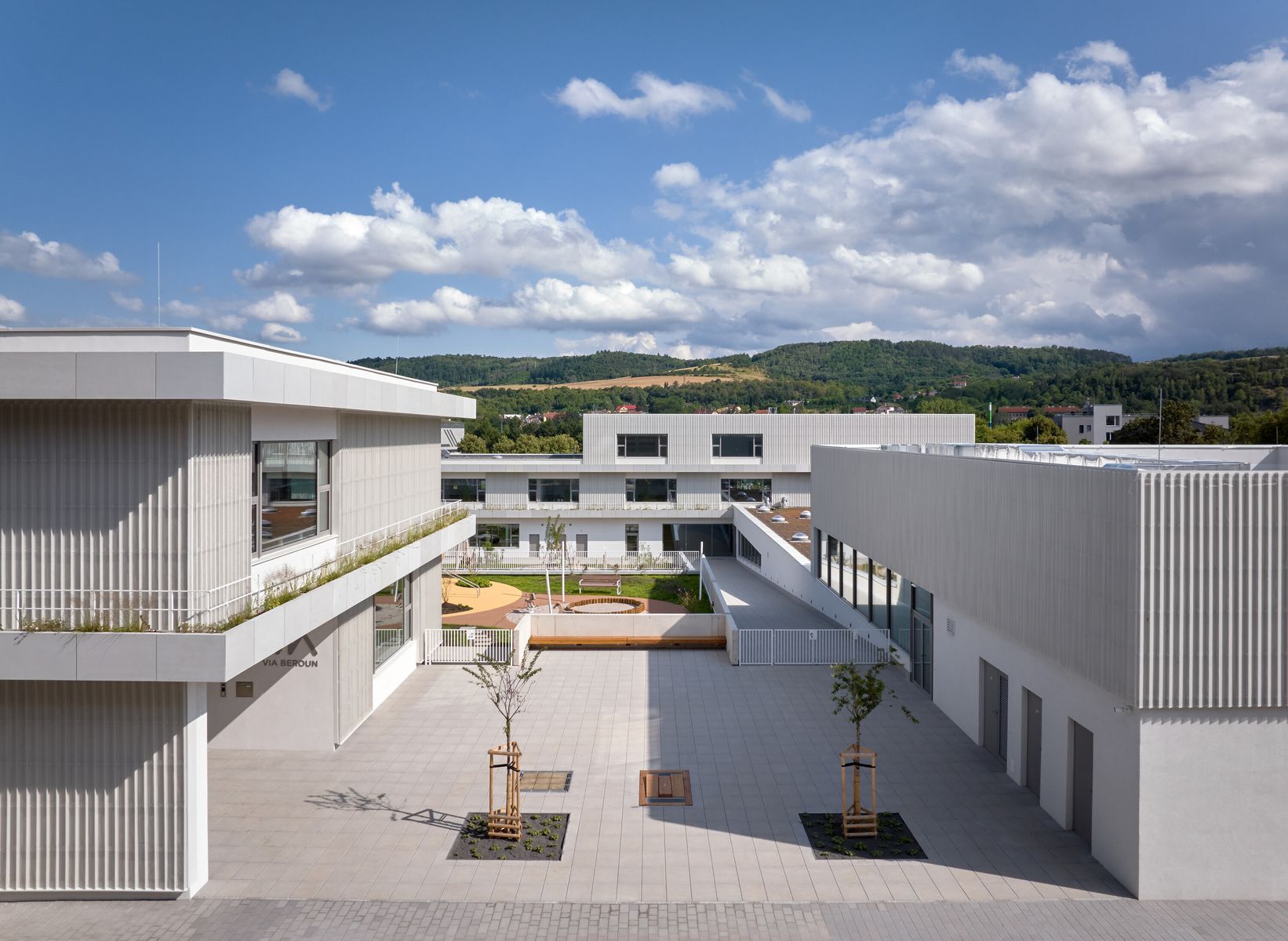 Soukromá základní a mateřská škola je navržena studiem OVA s důrazem na individualitu, kreativitu a ekologii. Zvenku hravá s fasádou z bílého vlnitého plechu, uvnitř vzdušná a reprezentativní s materiály jako dřevo a teraco. Velkoplošným prosklením se škola otevírá všudypřítomné zeleni.