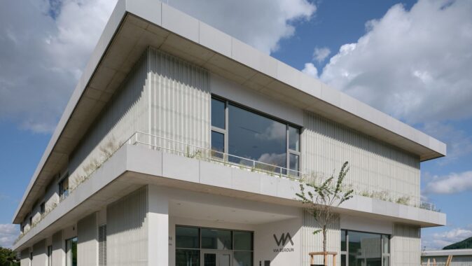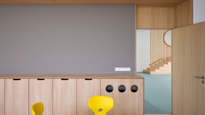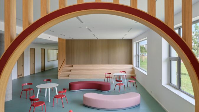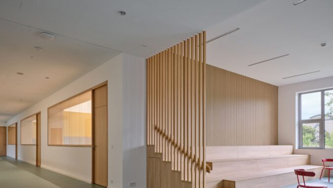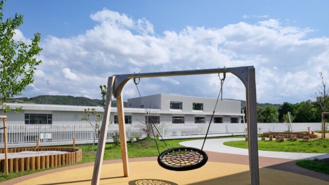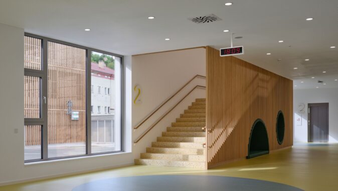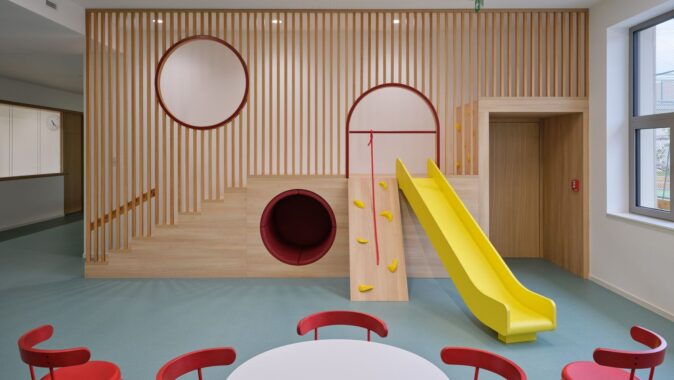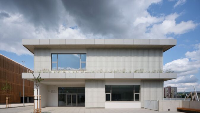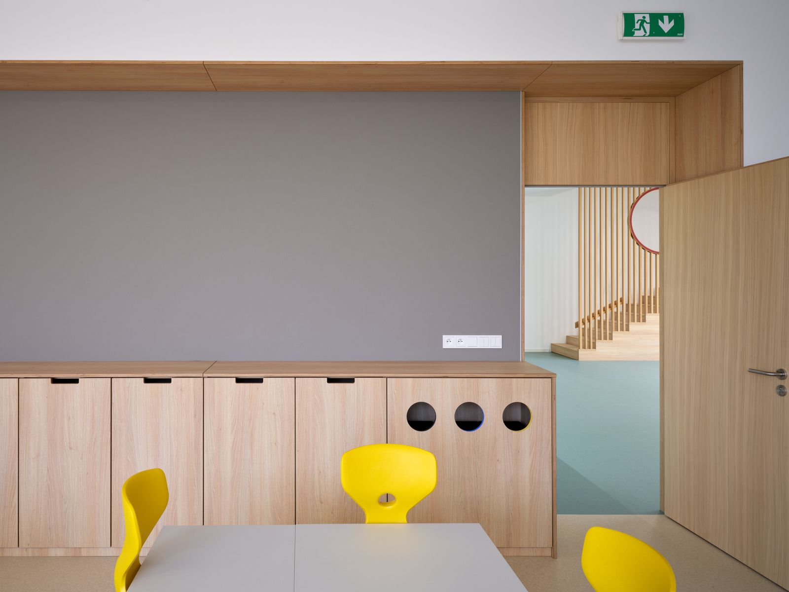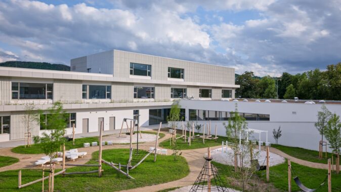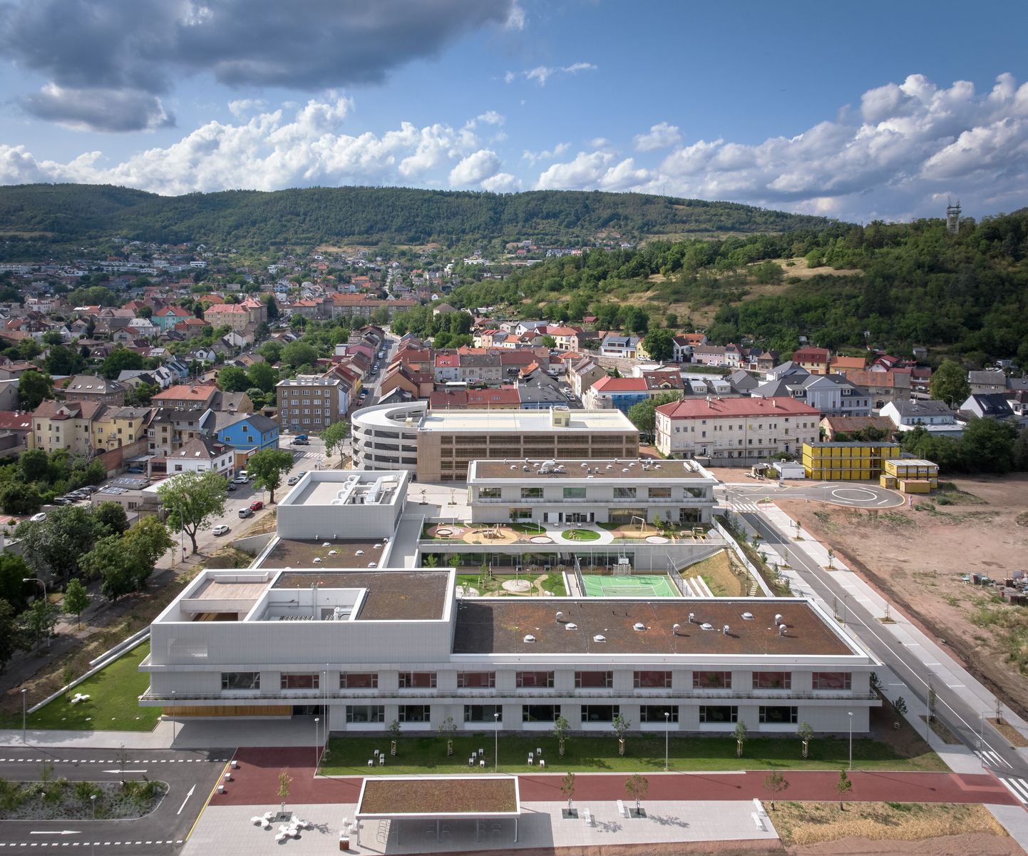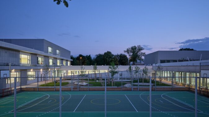 Soukromá základní a mateřská škola je navržena studiem OVA s důrazem na individualitu, kreativitu a ekologii. Zvenku hravá s fasádou z bílého vlnitého plechu, uvnitř vzdušná a reprezentativní s materiály jako dřevo a teraco. Velkoplošným prosklením se škola otevírá všudypřítomné zeleni.