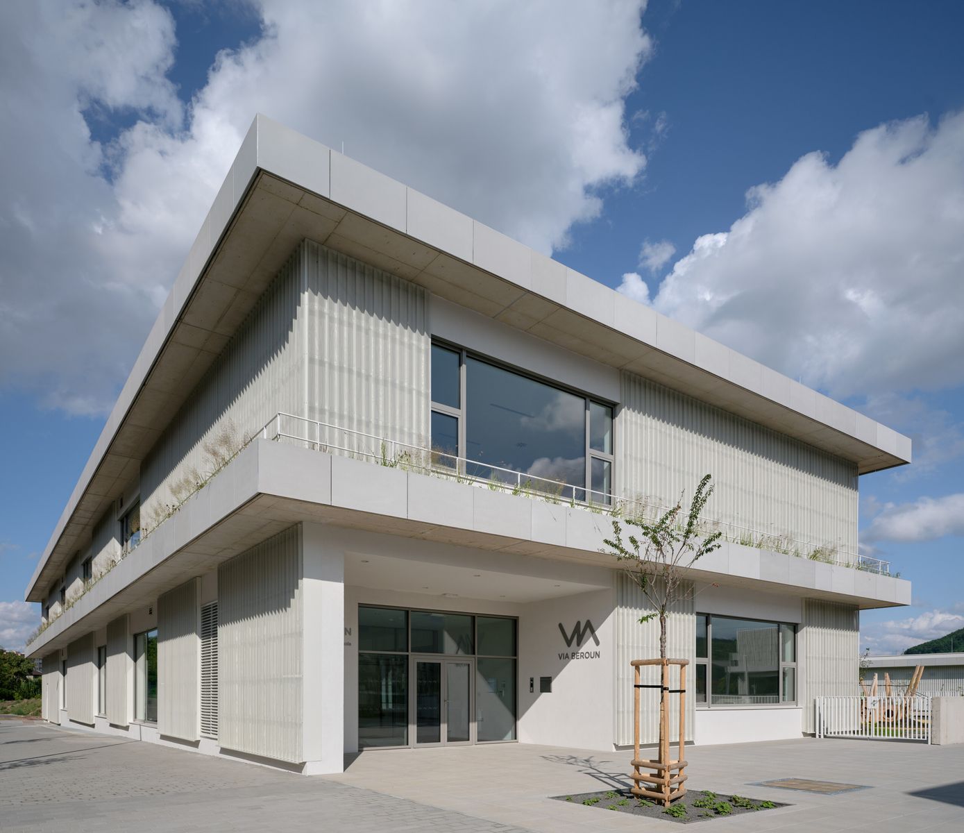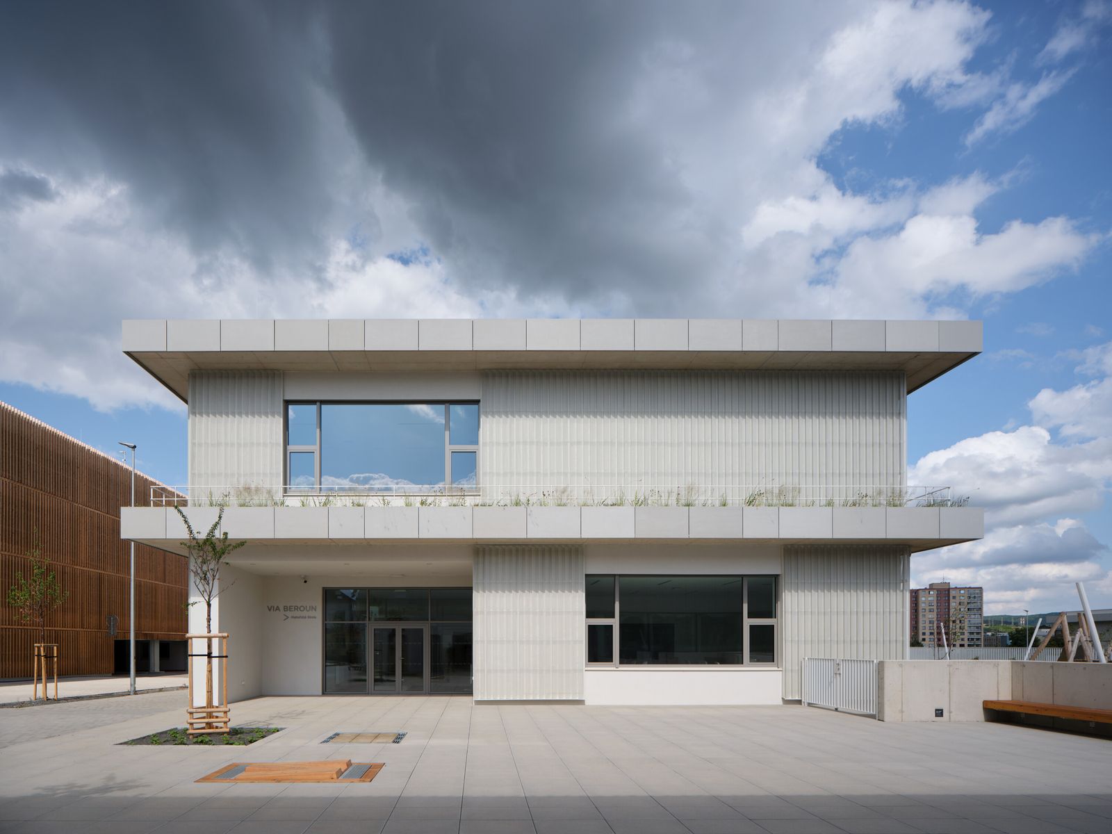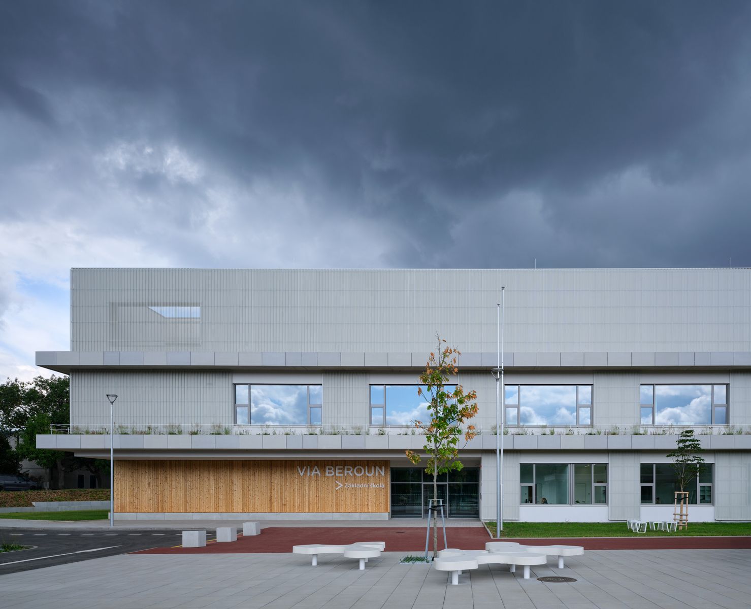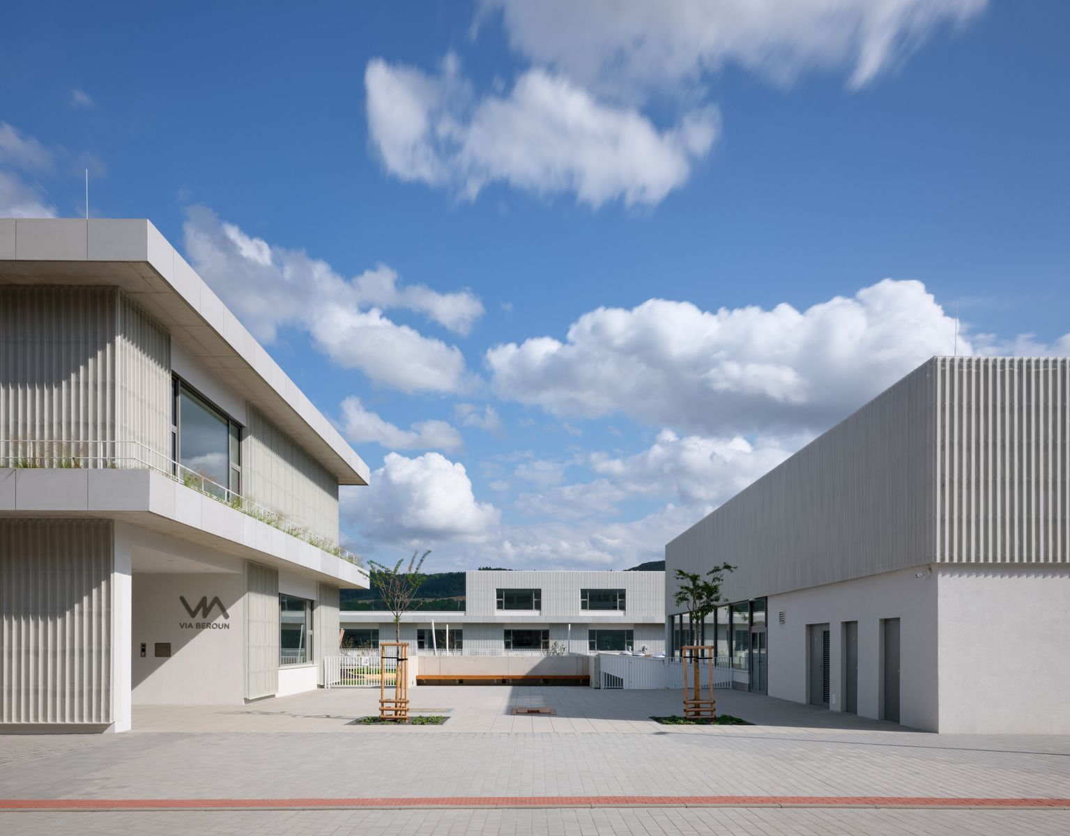 Kampus školy VIA Beroun tvoří třípodlažní objekt s uspořádáním křídel kolem centrálního dvora ve tvaru písmene U. Návrh využívá modelaci terénu, čímž budí dojem dvoupodlažní stavby. Zeleň je výrazným prvkem a prostupuje celou školou. V okolí budovy i ve dvoře je navržena bohatá výsadba stromů a travin, a díky rozsáhlému prosklení jsou interiér a exteriér školy vizuálně propojeny. Celý koncept doplňuje hravá fasáda z vlnitého bílého plechu. Ve vyšších podlažích jsou na betonových parapetech truhlíky s travinami.