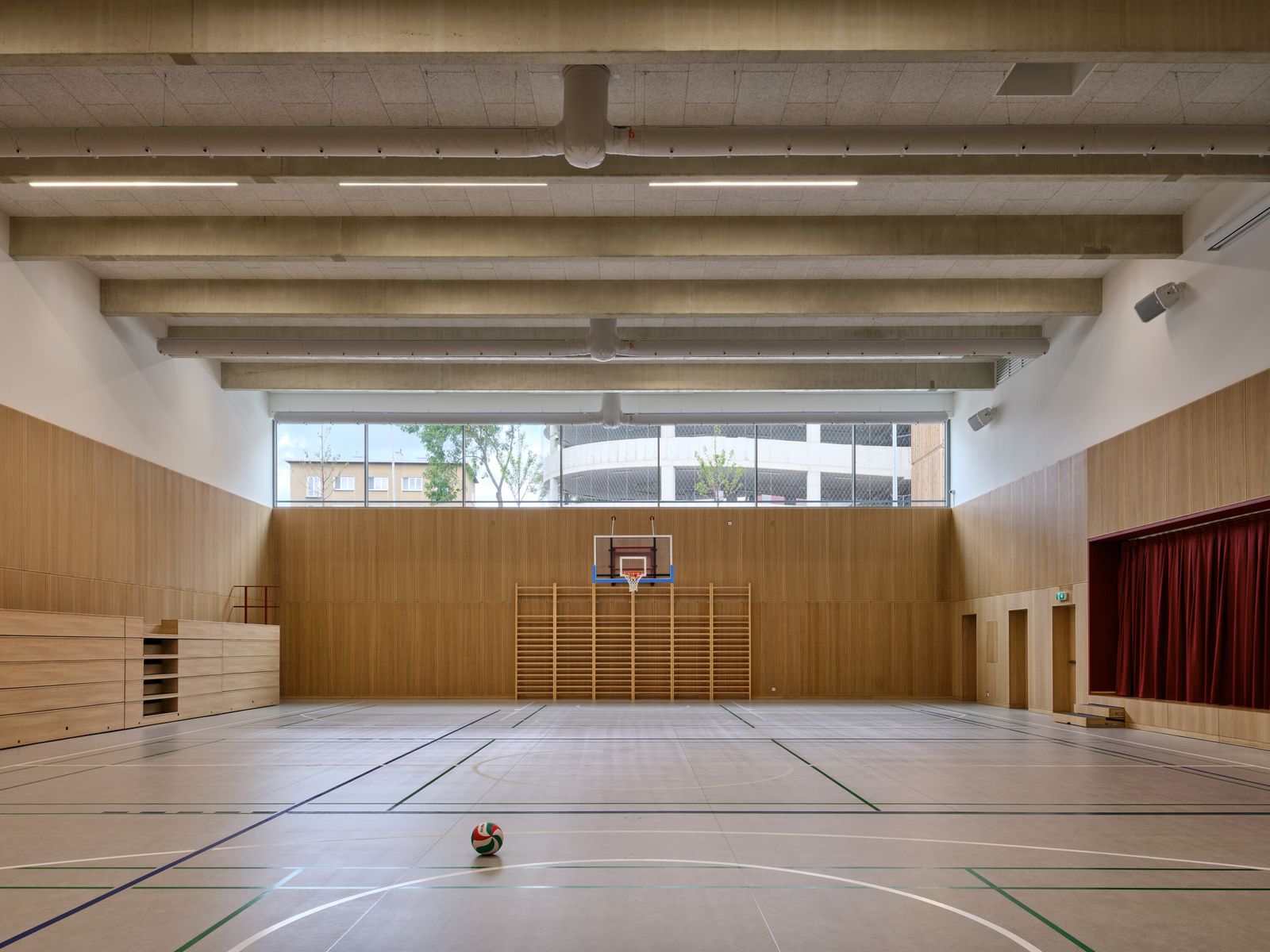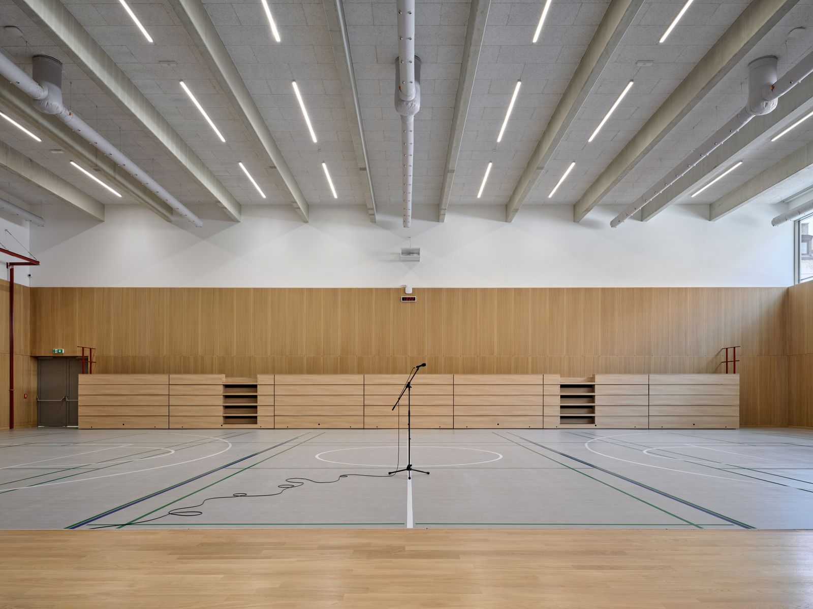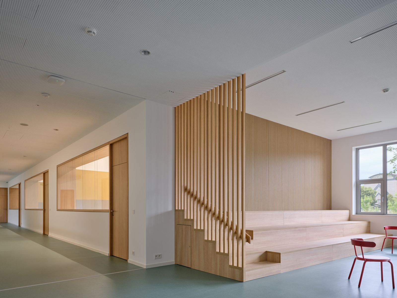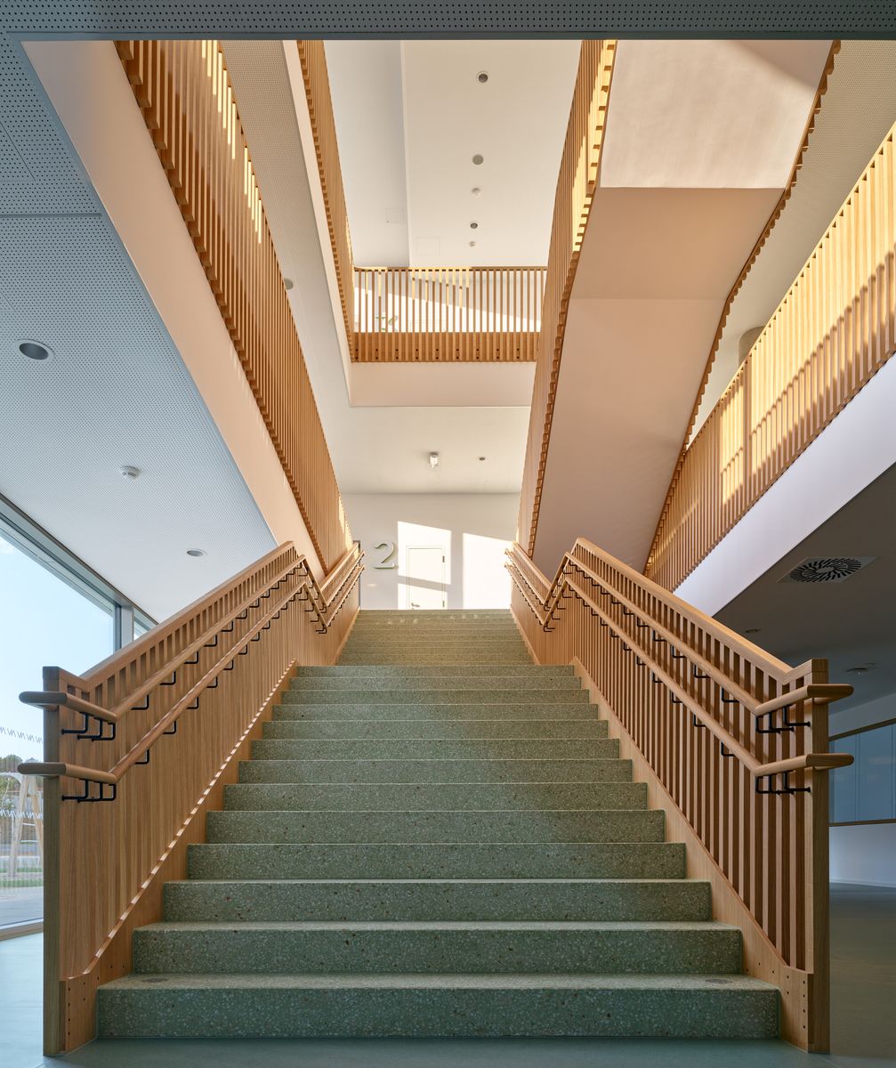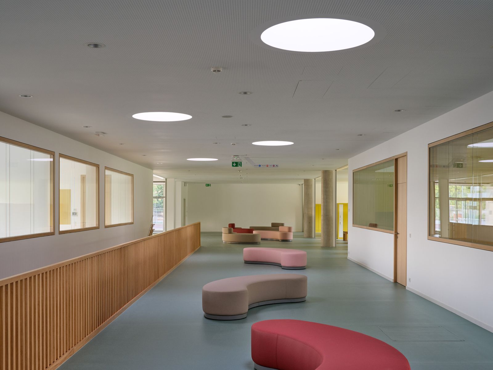 Interiér celé budovy zdůrazňuje její reprezentativní charakter, který se odráží ve zvolených materiálech, zejména ve dřevě a teracové dlažbě. Zvláštní pozornost je věnována jedinečnému životu v chodbách. Ty nabízejí velkorysé prostory s různými typy sezení a průhledy do jednotlivých učeben. Prostory chodeb jsou určeny dětem k setkávání, hře, samostudiu a rovněž poskytují příležitosti pro alternativní výuku nebo mimoškolní aktivity mimo hlavní učebny. Hlavní učebny a laboratoře jsou flexibilní, prostorné místnosti s různými typy uspořádání sezení a moderním vybavením.