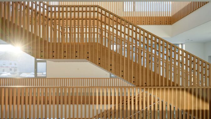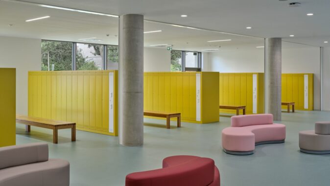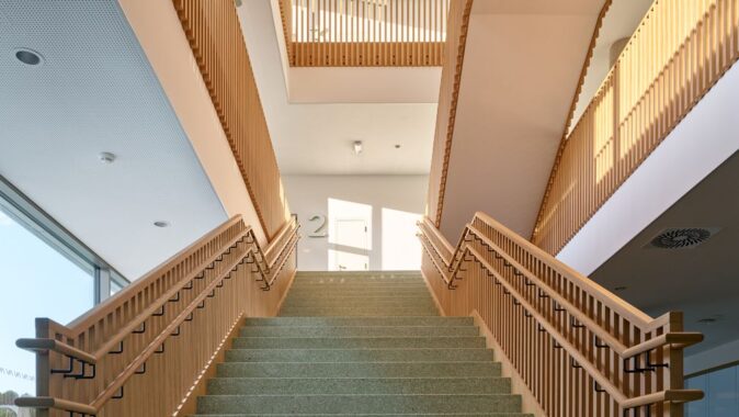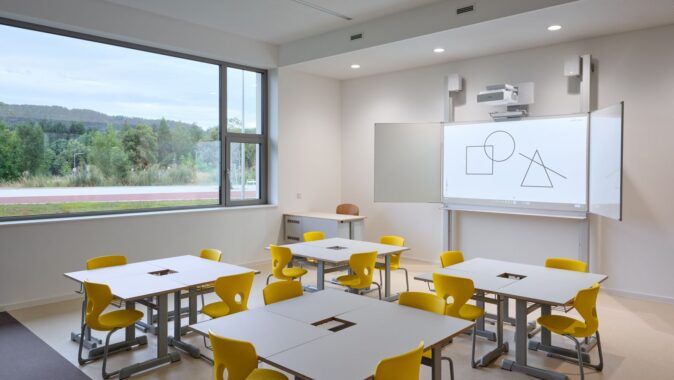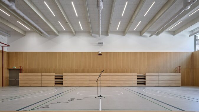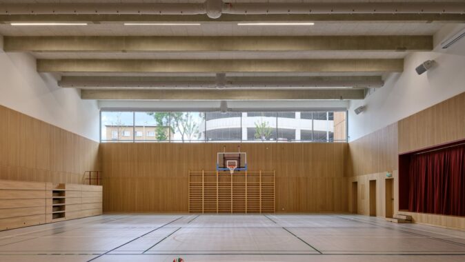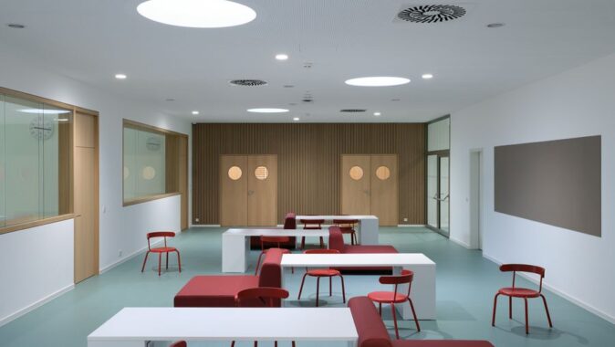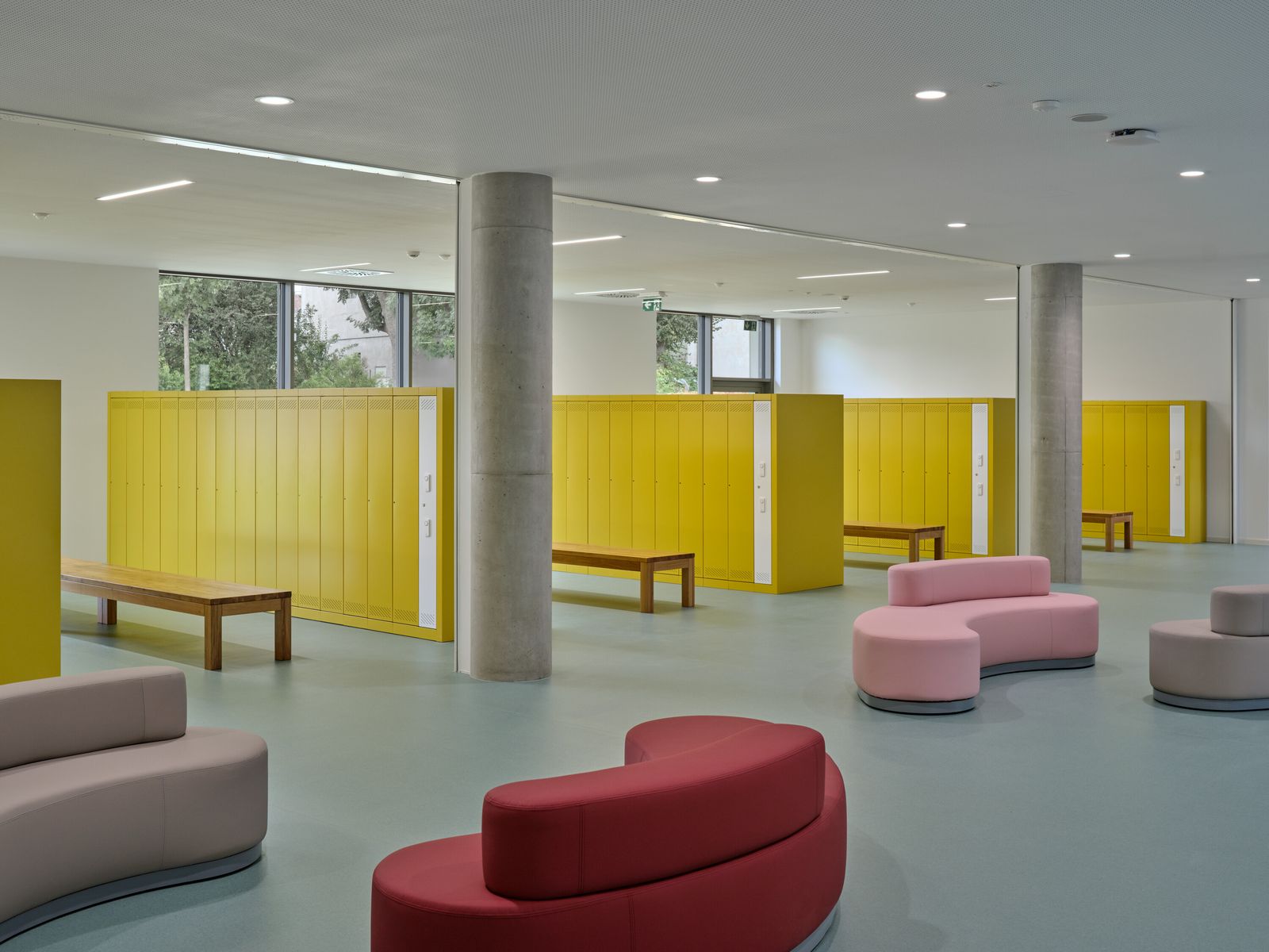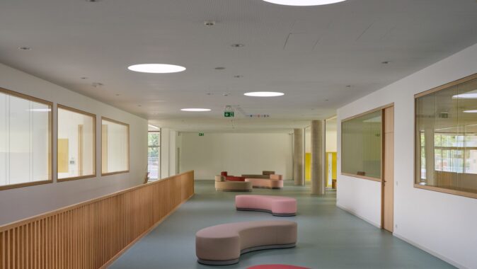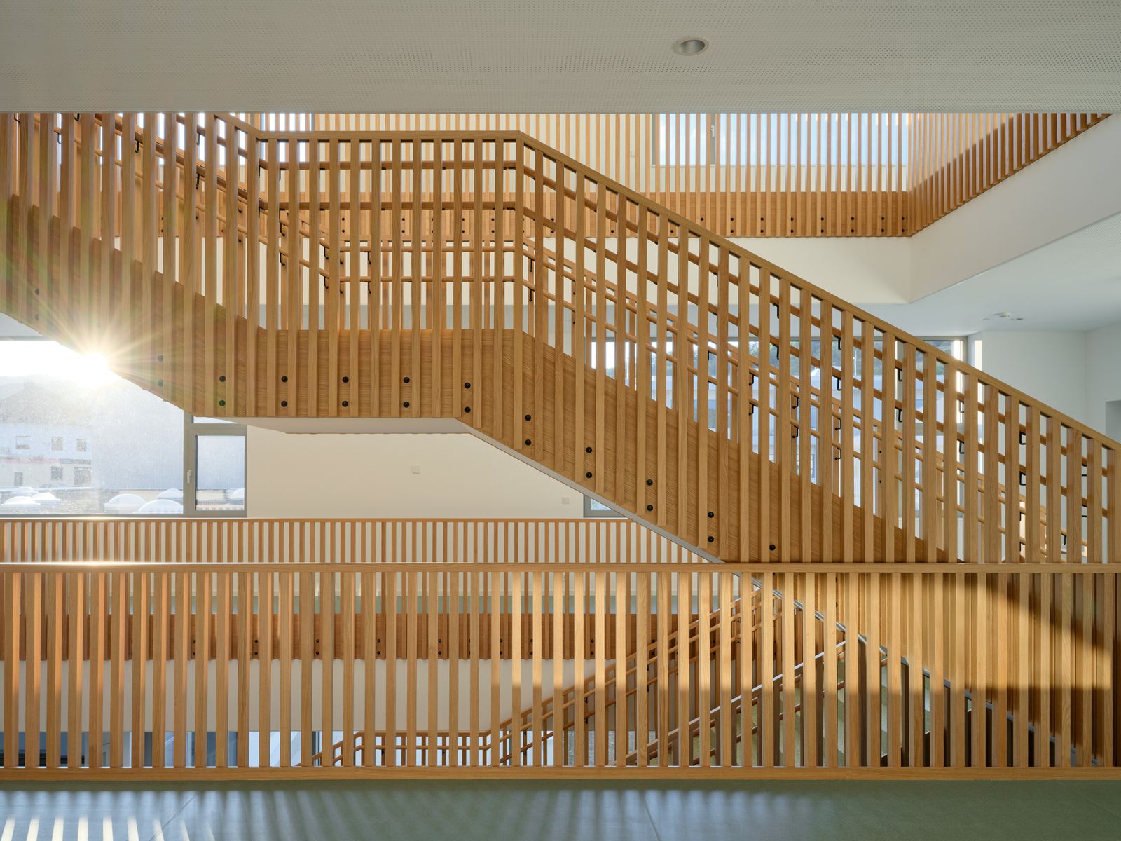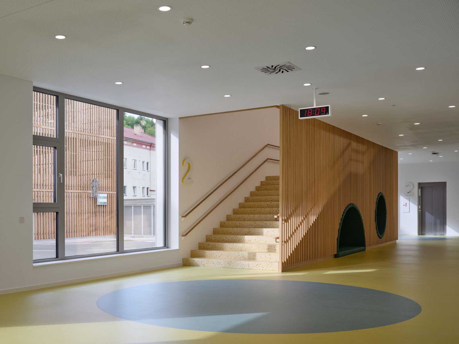Interiér celé budovy zdůrazňuje její reprezentativní charakter, který se odráží ve zvolených materiálech, zejména ve dřevě a teracové dlažbě. Zvláštní pozornost je věnována jedinečnému životu v chodbách. Ty nabízejí velkorysé prostory s různými typy sezení a průhledy do jednotlivých učeben. Prostory chodeb jsou určeny dětem k setkávání, hře, samostudiu a rovněž poskytují příležitosti pro alternativní výuku nebo mimoškolní aktivity mimo hlavní učebny. Hlavní učebny a laboratoře jsou flexibilní, prostorné místnosti s různými typy uspořádání sezení a moderním vybavením.