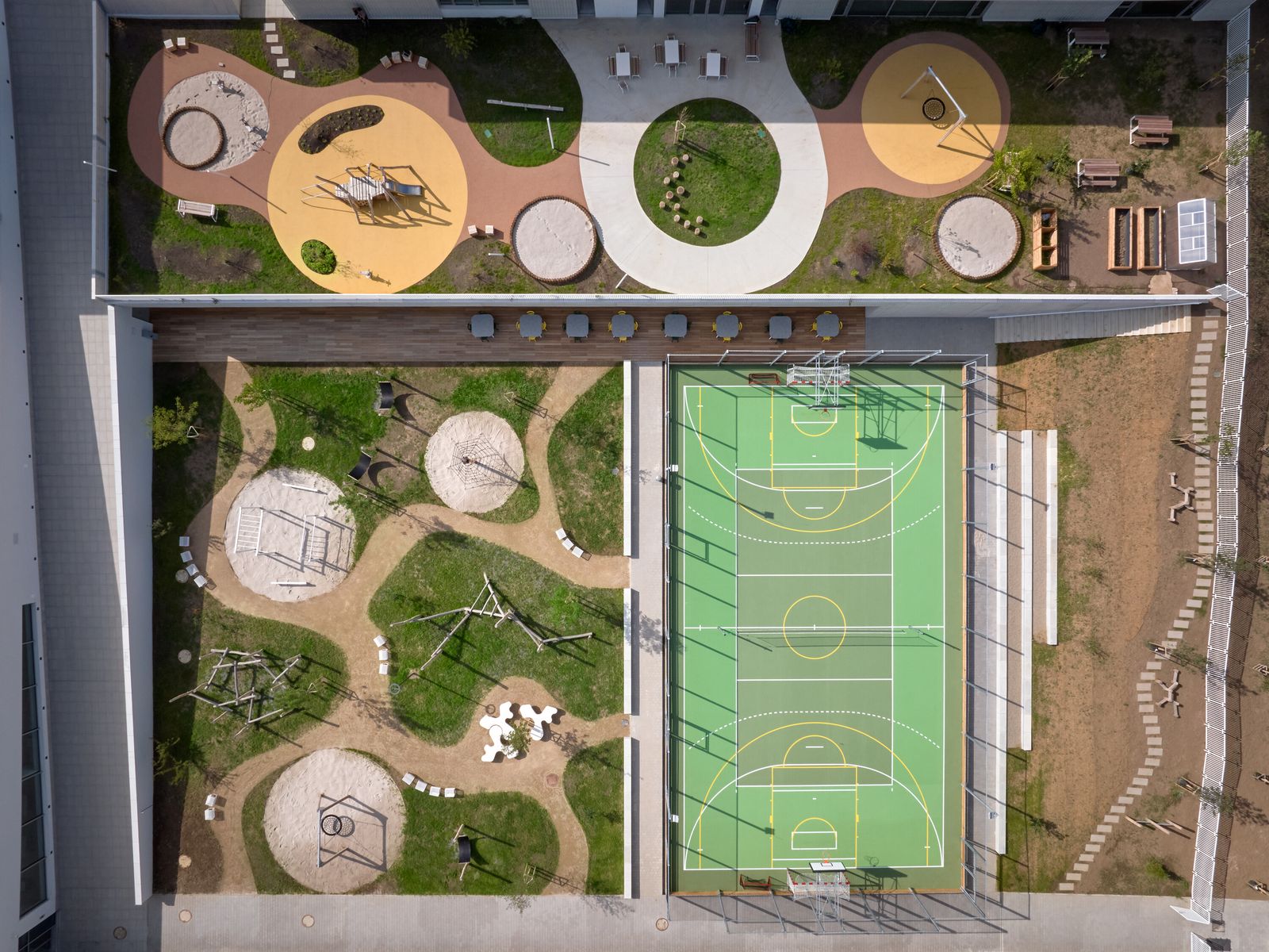Vnitřní dvůr školy tvoří atrium s travnatou plochou a výsadbou stromů. Za přilehlým hřištěm se nachází travnatý svah se stromy. Na jedné ze střech budovy je navržena intenzivní zelená střecha se stromy a keři, další tři střechy jsou řešeny jako extenzivní zelené střechy. Vnitřní školní dvůr je vybaven vzdělávacími prvky, jako je skleník a vyvýšené záhony, dále herními prvky pro mateřskou i základní školu, cvičebními prvky a kvalitním venkovním mobiliářem.