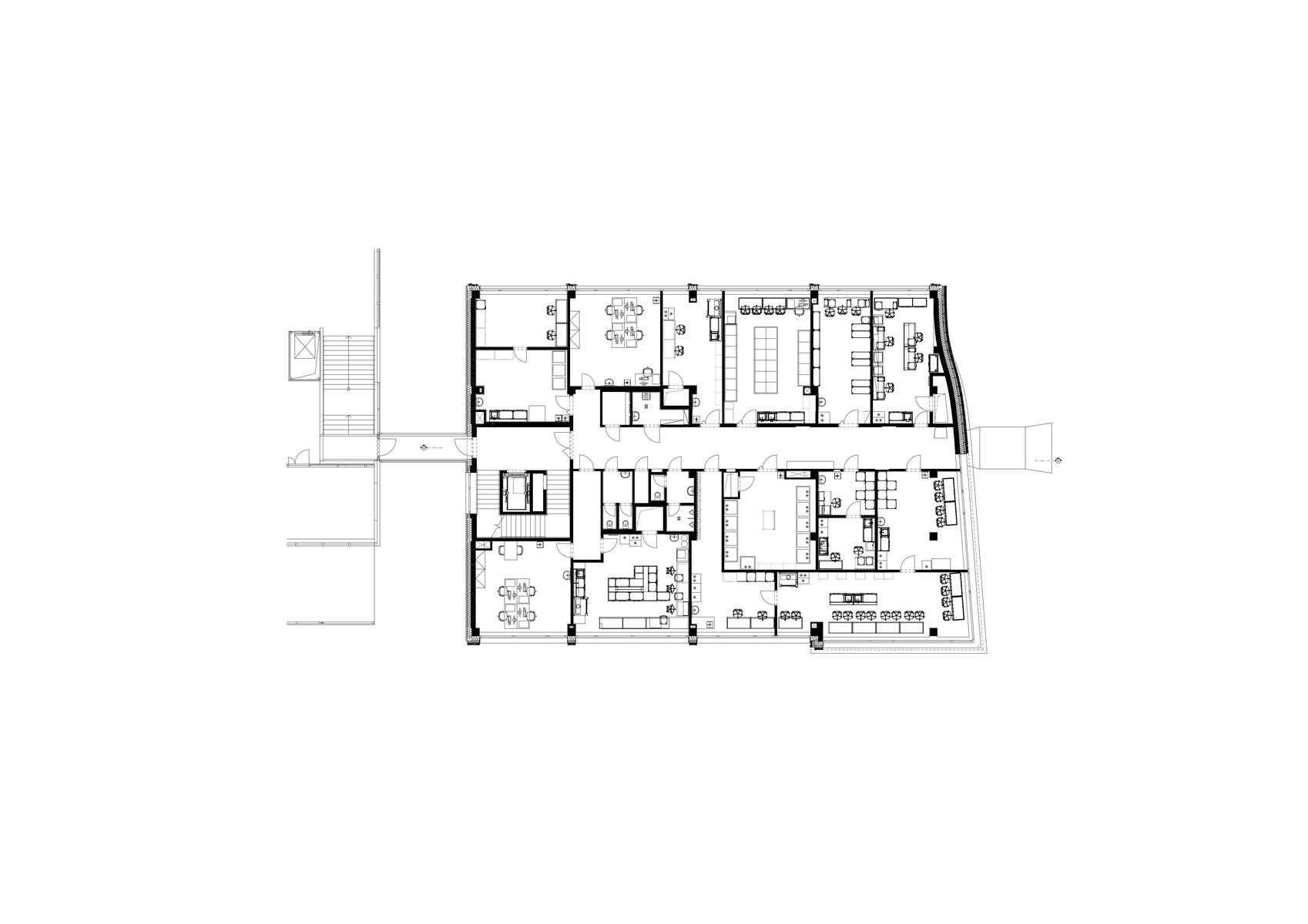 Formálně jde o dostavbu, neboť je pevně propojena s dvěma sousedními budovami, které dosud tvořily neuzavřenou linii a nová budova ji uzavírá nárožím. Na jižní straně se napojuje dvěma subtilními krčky na budovu fakulty životního prostředí. Směrem na sever drží fasáda linii, graduje k nároží a končí organickou křivkou. Gradace je vertikální i horizontální a není zvlášť výrazná.