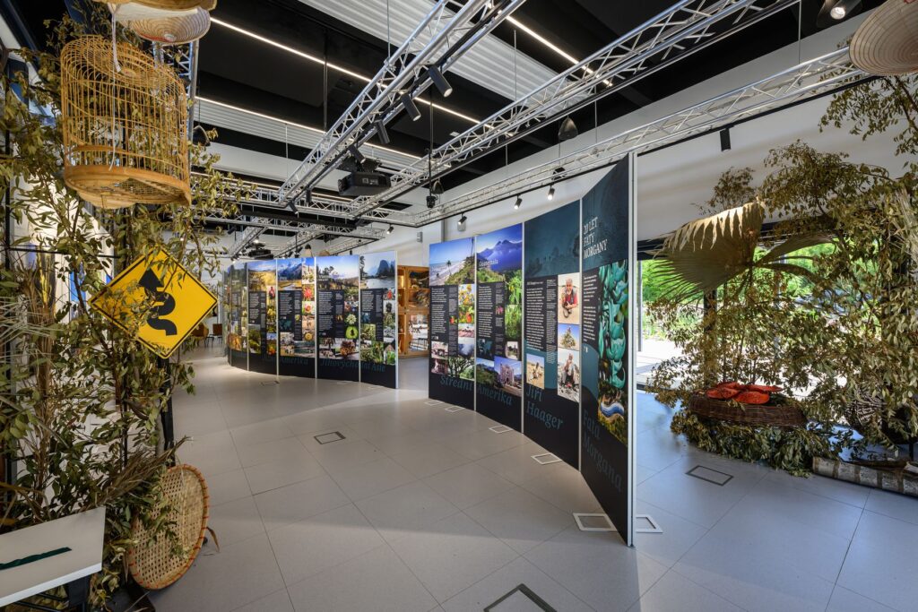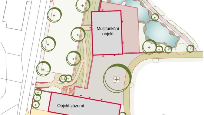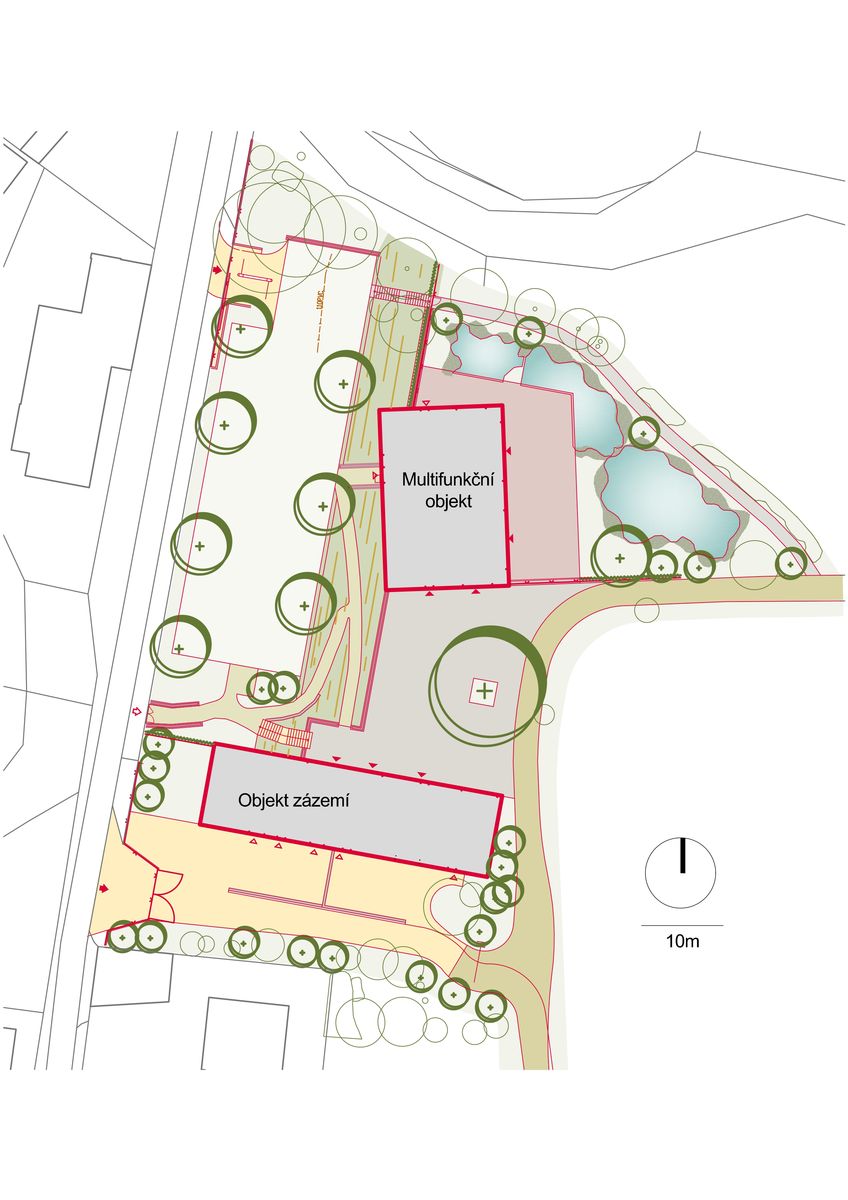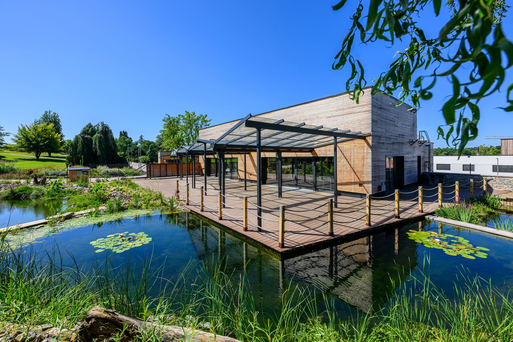 K multifunkčnímu sálu přiléhá vodní plocha, které je součástí klidové zóny botanické zahrady. Zeleň obklopující nové objekty je již součástí expozic a doplňuje kompozici formou ploch, struktur, textur a barev. Jsou zde navrženy jak domácí, tak introdukované druhy rostlin.