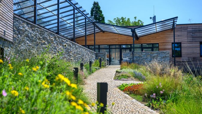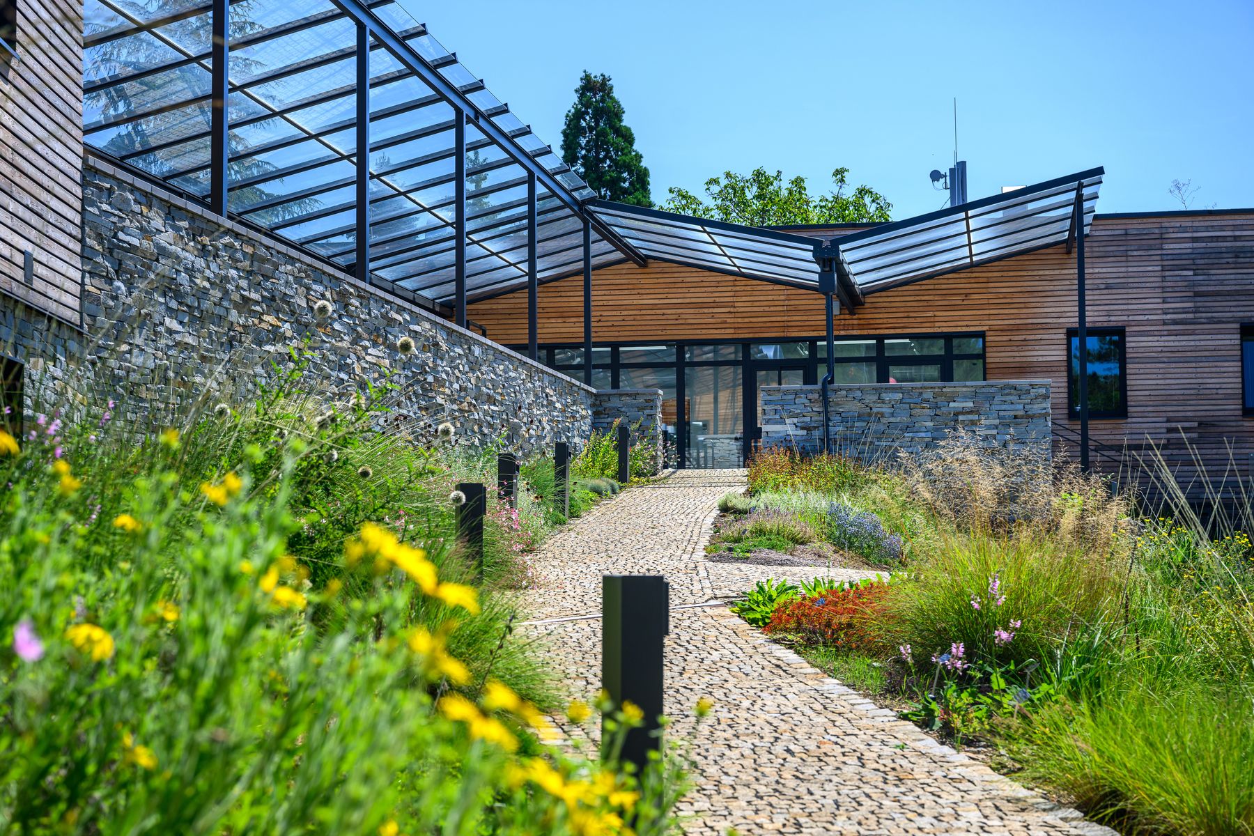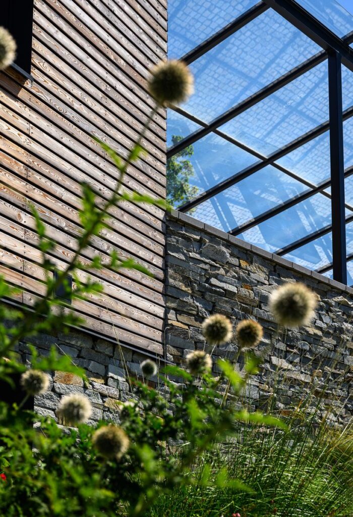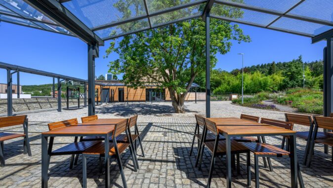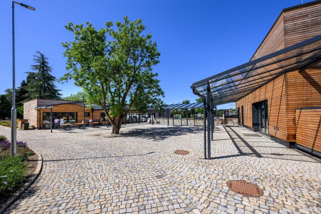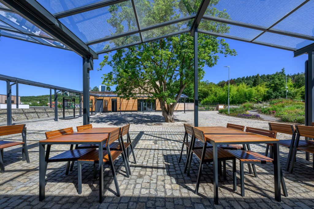 Oba objekty jsou navrženy v lapidárních geometrických formách, aby tvořily neutrální pozadí pro centrální veřejný prostor a okolní botanické expozice. Na objektech i okolních plochách jsou použity přírodní materiály – dřevo (sibiřský modřín), kámen, sklo, hliník, nerez.
