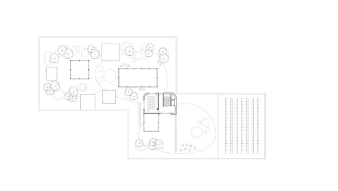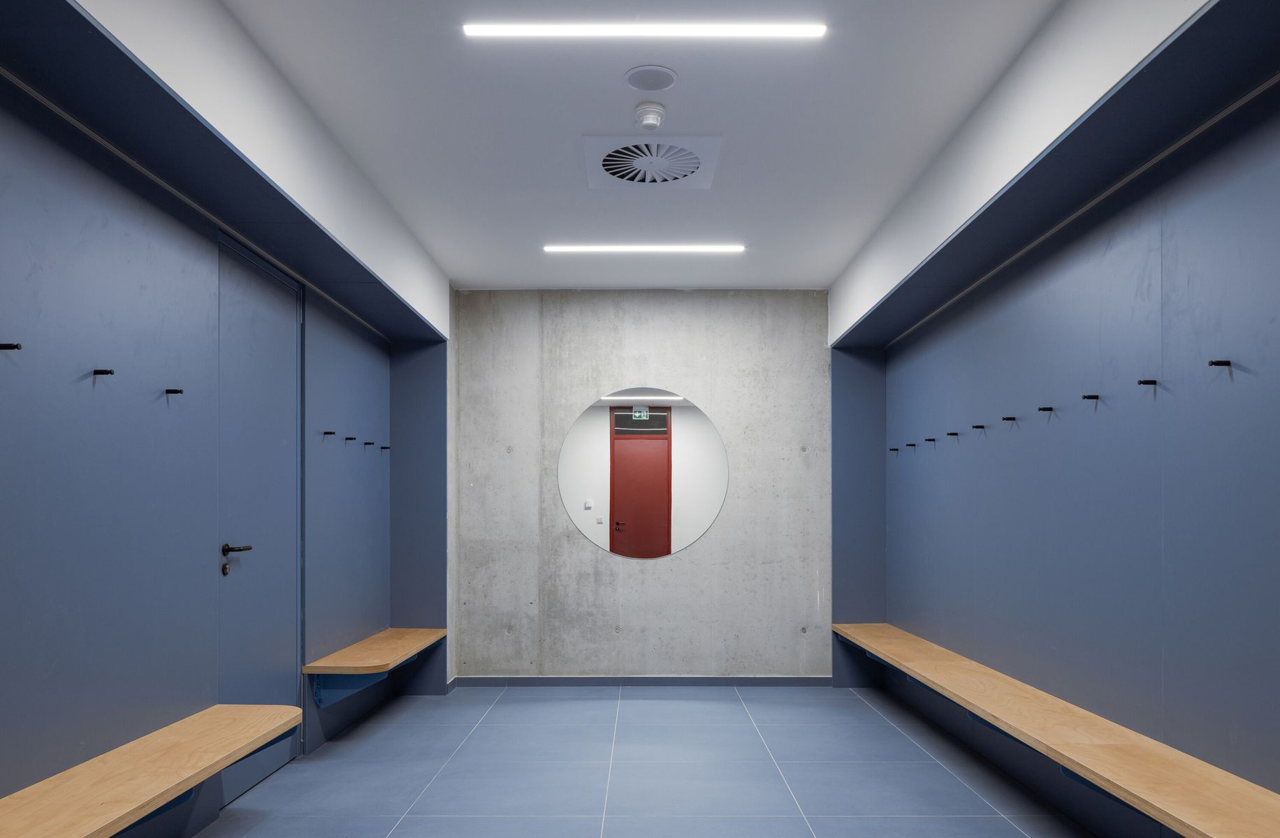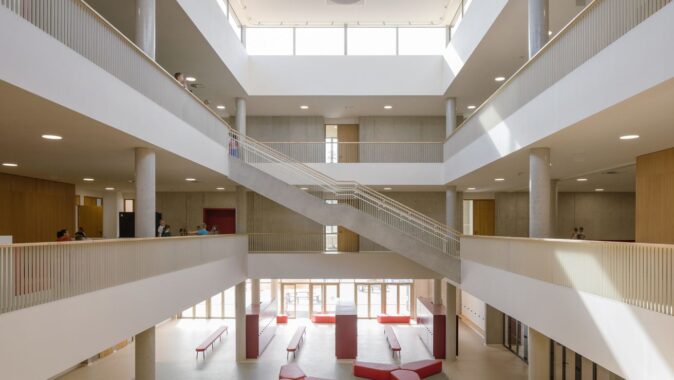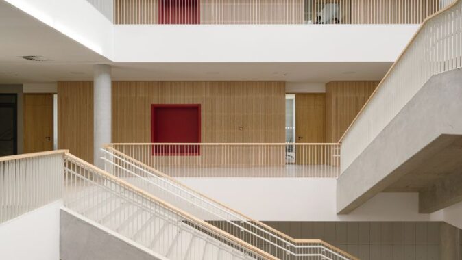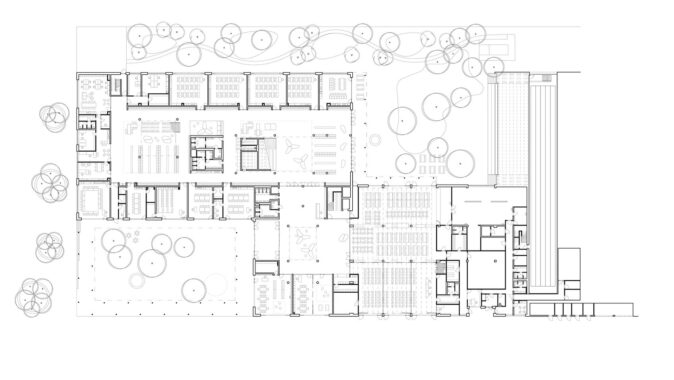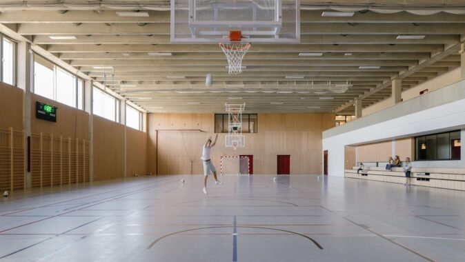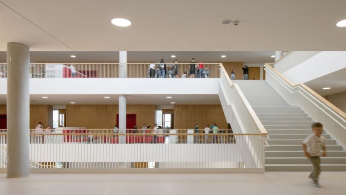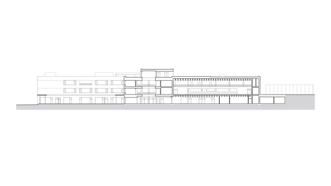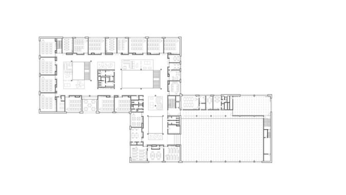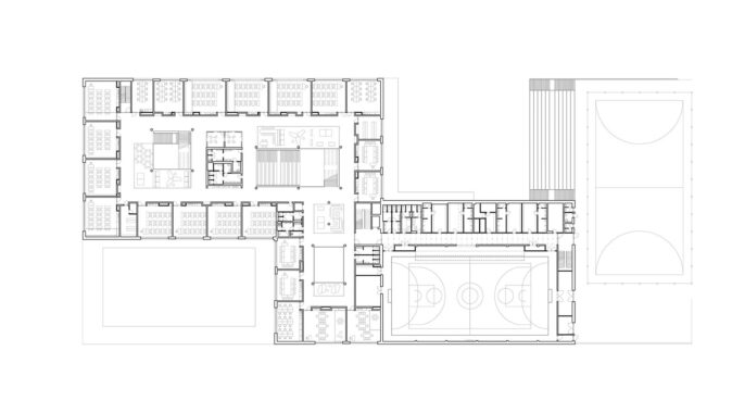 Dvěma dvorům, veřejnému a soukromému, odpovídá základní rozvržení domu. Severní část je definována učebnami a hlavním pobytovým prostorem, jižní část patří sportu, aule a potřebnému zázemím.