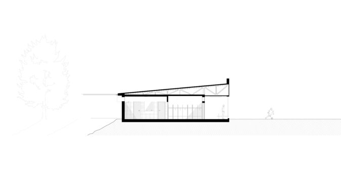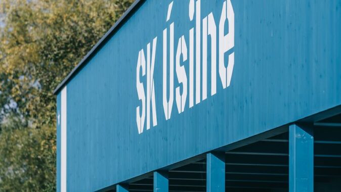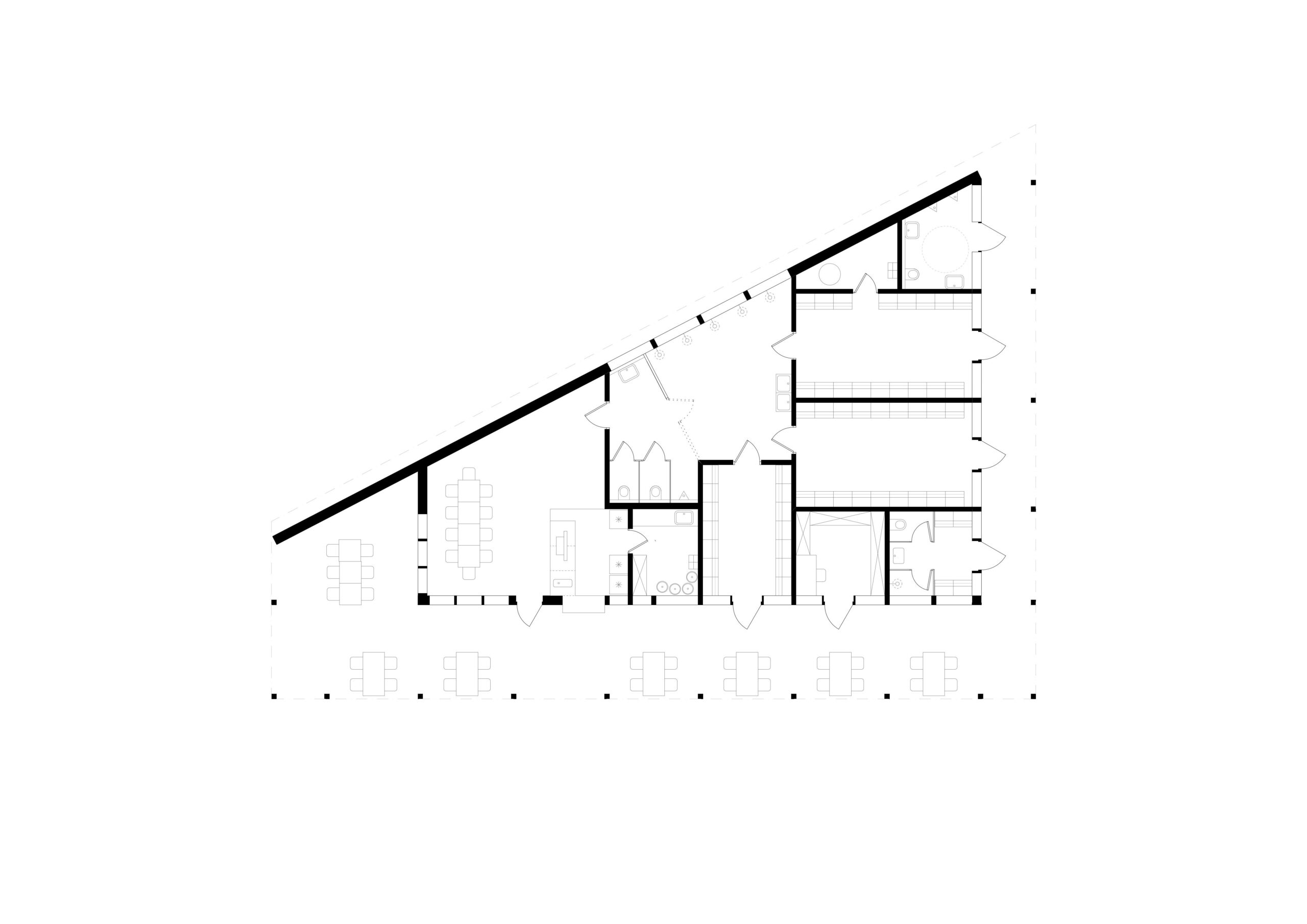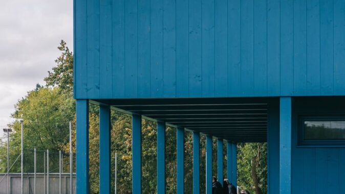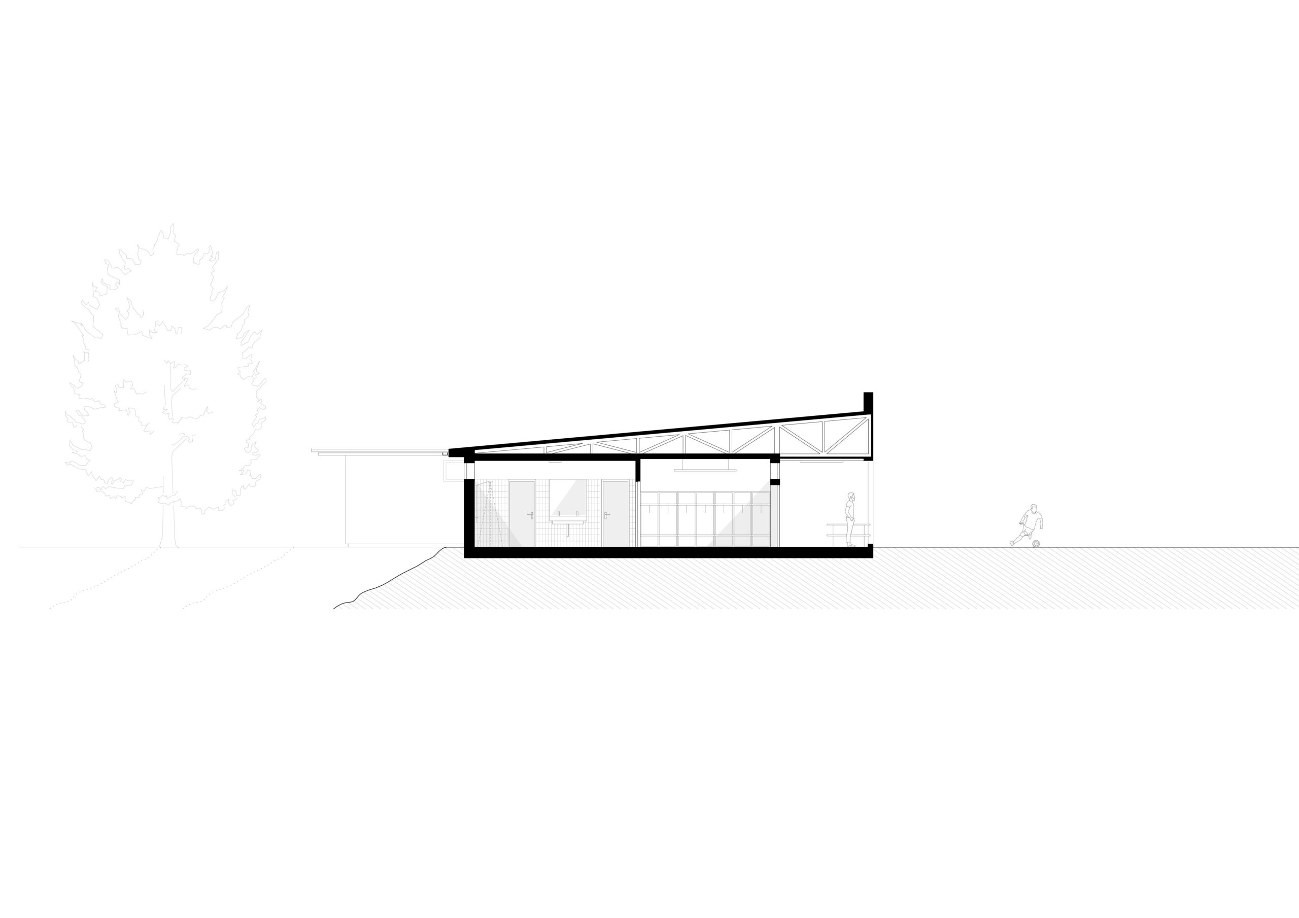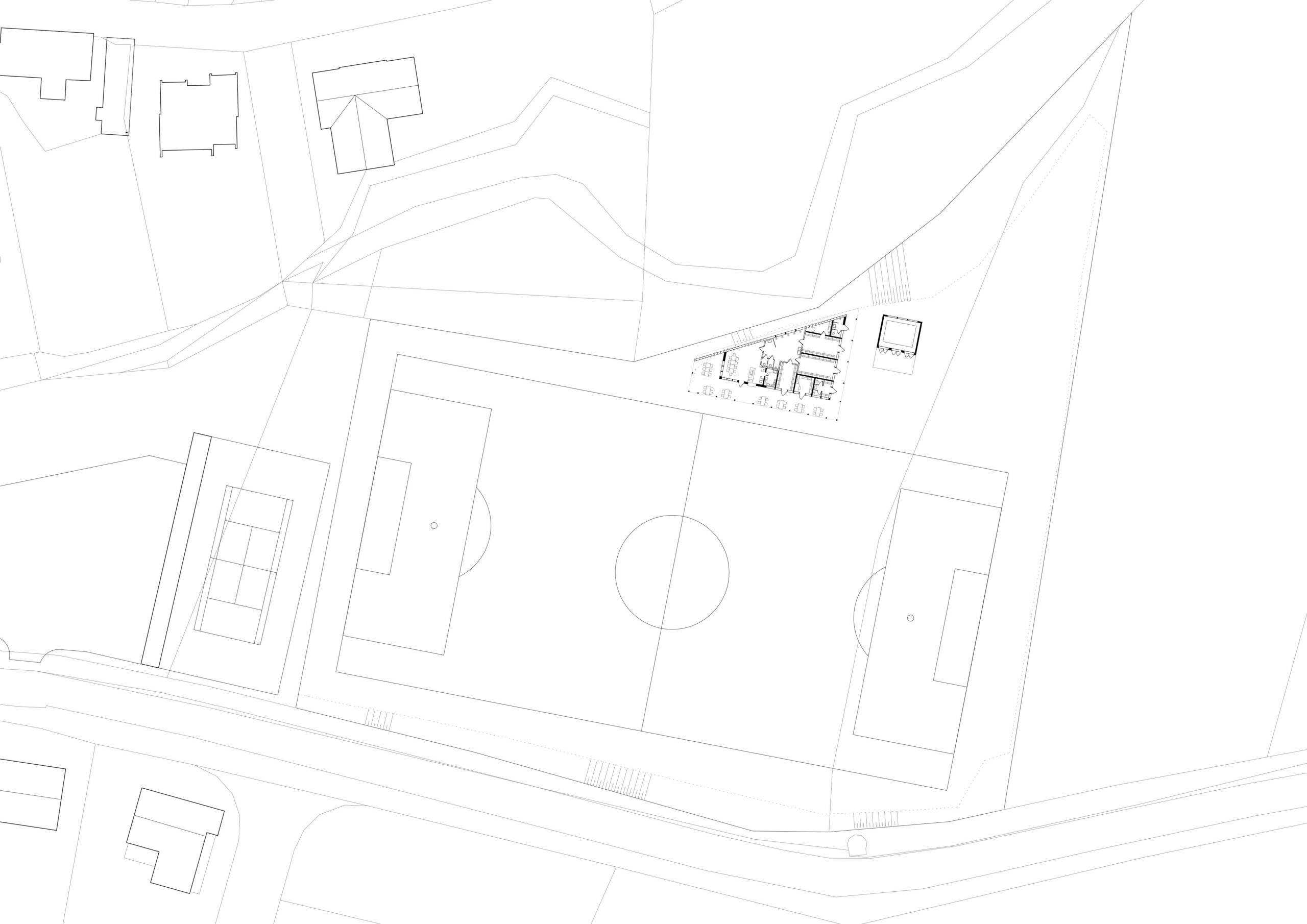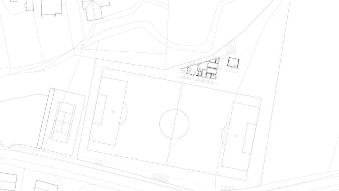 Obvod stavebního pozemku určil trojúhelníkový půdorys stavby. Stavba odkazuje svojí formou k prototypálním stavbám sportovních zázemí z dřevěných prken, výrazných barev a velkých nápisů.