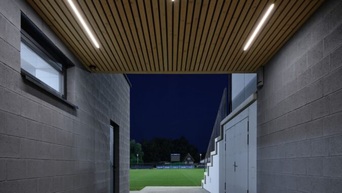 Obvodové stěny tvoří pohledové betonové tvárnice s vloženou tepelnou izolací. Betonová struktura a skladebnost tvárnic je přiznána v exteriéru i interiéru, stejně jako monolitické železobetonové stropy. Ty jsou v klubovně doplněné akustickým dřevěným podhledem plynule přecházejícím do exteriéru. Kontrapunktem k šedému betonu je použití výrazných klubových barev. Leitmotivem celého projektu je modrá barva v několika odstínech, inspirovaná identitou klubu.