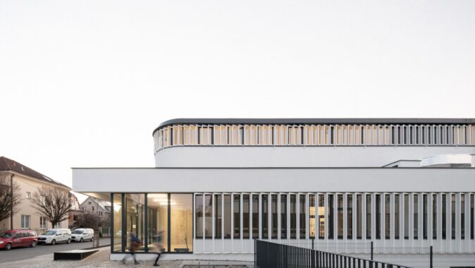 Hmota haly o minimálních vnějších rozměrech 45×25×10 m musela být osazena v zahuštěné, převážně rezidenční zástavbě v ulici Školní tak, aby co nejméně rušila. Proto jsme zvolili zakulacené rohy – objem se tím výrazně redukuje. Zároveň většina objektů v okolí má vždy kolem sebe přístavby, lodžie a pergoly a tím „rozpouští“ svůj objem do prostoru kolem sebe.