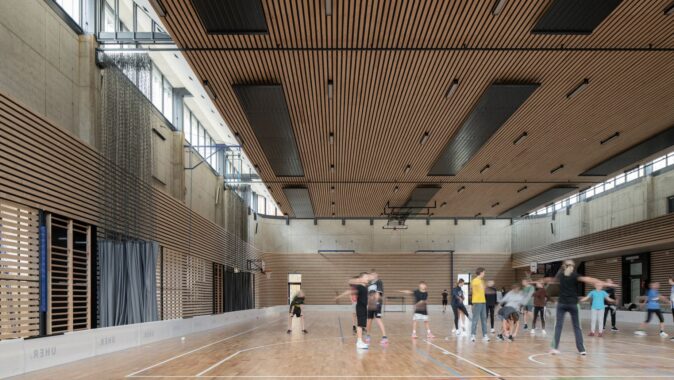 Interiér: je navržen zdravě spartánsky – spoře, s přiznanou technologii. Na podlaze haly je masivní dřevěná palubovka, na stěnách je akustický obklad z dřevěných latí a tlumivého absorbéru pod nimi. Strop je sjednocený dřevěným obkladem. Tribuna je tvořena z pevných samostatných sedadel z ohýbané překližky. Rámy výplní otvorů jsou provedené z hliníku tmavého odstínu.