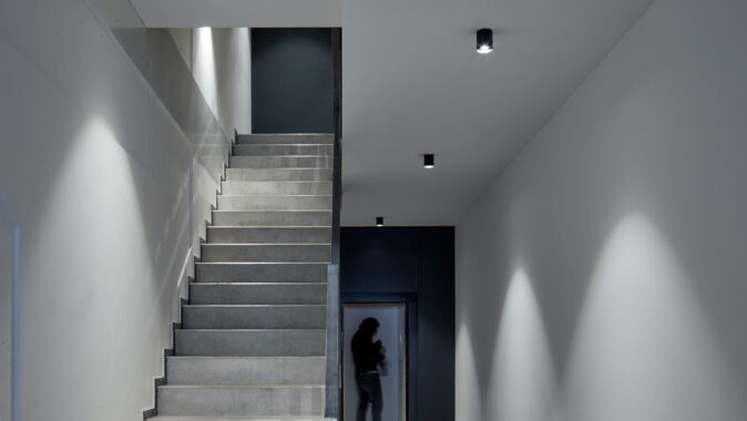 Předsazený systém hliníkových lamel v levé části fasády naznačuje kontury historické budovy, která na parcele kdysi stávala, a připomíná tak původní měřítko i ducha místa. Keramický obklad přechází plynule ze svislé fasády do střešní roviny, přičemž si objekt zachovává současný projev.