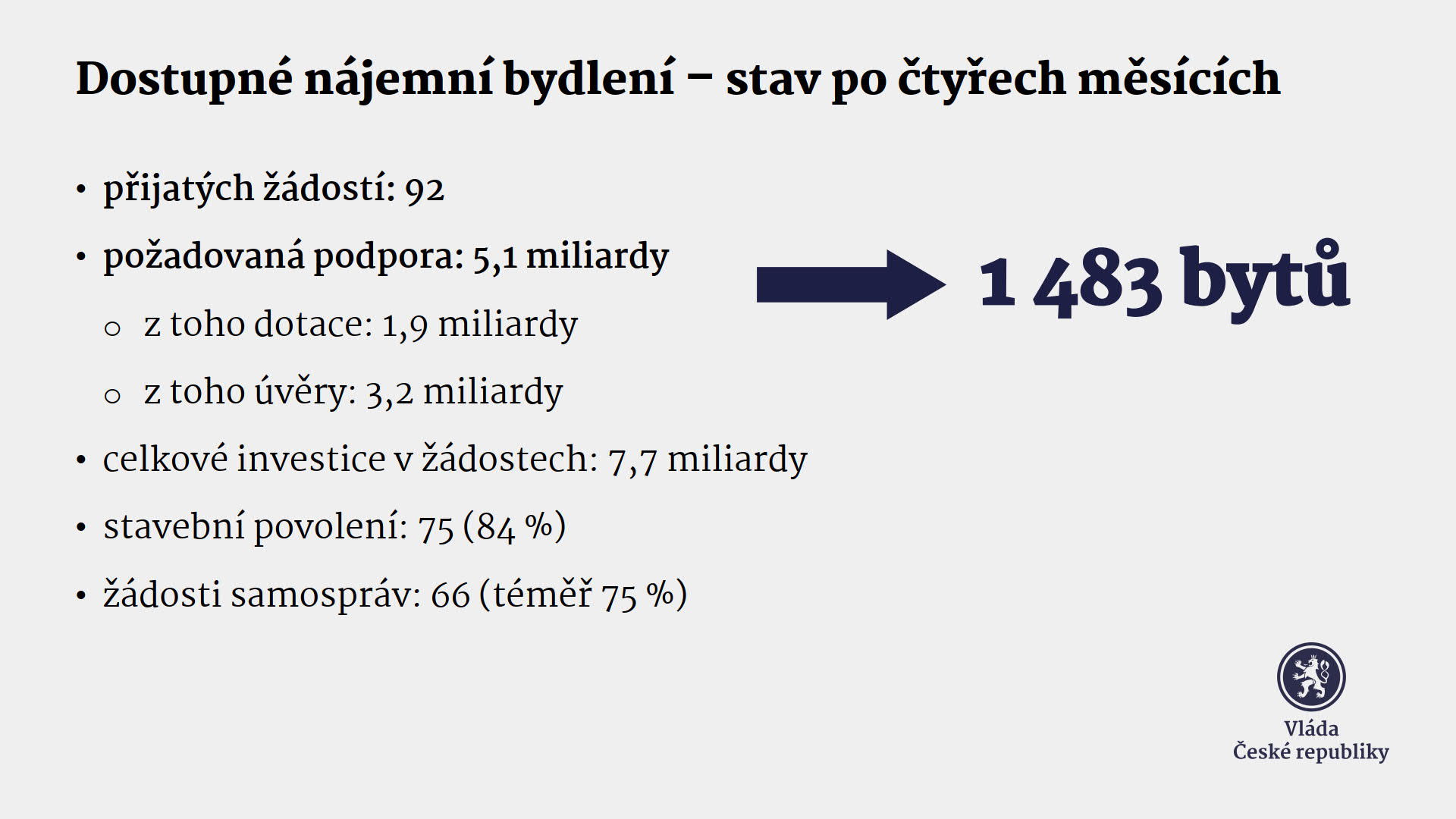 Za pouhé čtyři měsíce si žadatelé v programu řekli o více než dvě třetiny z alokované částky 7 miliard korun. Zhruba 84 % podaných projektů už má stavební povolení. „V tuto chvíli máme na stole přes devadesát konkrétních bytových projektů. Vláda ve velmi krátkém čase spustila investiční a podpůrné nástroje, díky kterým se už dnes staví a připravuje více bytů pro střední třídu, mladé rodiny, učitele nebo zdravotníky. Úspěšně propojujeme obce se soukromým sektorem a nabízíme inovativní spojení úvěrů a dotací z evropských zdrojů i státního rozpočtu. Vysoký zájem žadatelů ukazuje, že se podařilo nastartovat systém podpory výstavby, který bude dlouhodobě udržitelný a postupně zvýší dostupnost bydlení v Česku,“ prohlásil na úvod tiskové konference premiér Petr Fiala.