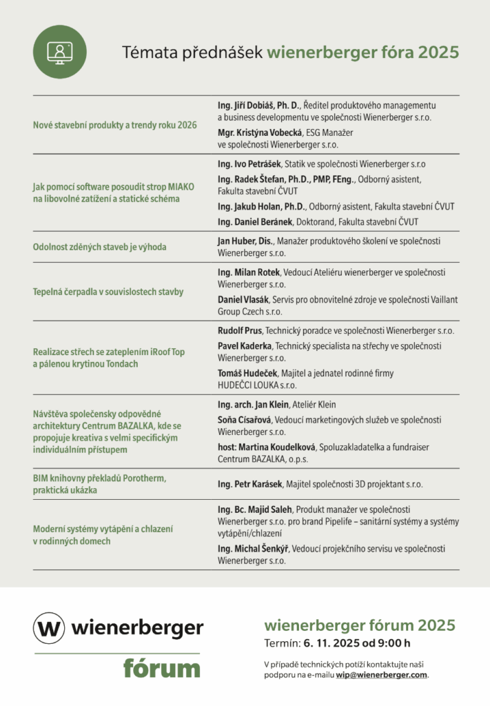 „wienerberger fórum je pro nás příležitostí představit odborné veřejnosti nejnovější produkty i inovace, které usnadní práci projektantům i stavebním firmám. Druhý díl letošního fóra představí kromě nových nástrojů a digitálních řešení také praktické otázky, například jak navrhovat odolné konstrukce, jak efektivně instalovat tepelné čerpadlo nebo jak využít BIM knihovnu pro překlady Porotherm. Chceme poskytnout účastníkům praktické informace, inspiraci i nástroje, které jim pomohou při každodenní praxi,“ říká Jiří Dobiáš, ředitel produktového managementu a business developmentu ve společnosti Wienerberger s.r.o.