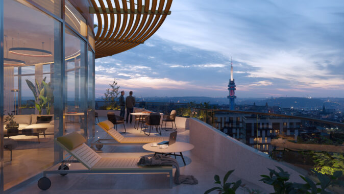 „V centru lokality, v místě původní výškové telekomunikační stavby, vyroste jako dominanta projektu 80 metrů vysoká rezidenční věž. Tato designová stavba bude unikátně vertikálně a horizontálně rozvlněná. A to díky speciálně tvarovaným balkonům s ohýbaným skleněným zábradlím. To dává stavbě její ojedinělou estetickou podobu a zároveň pomáhá stínění bytů,“ doplňuje architektka Jiřičná.