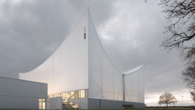 Novostavba sportovně-kulturního centra propojuje stávající zařízení a vytváří nové lokální centrum. Hala s lehkou textilní střechou pracuje s přirozeným světlem a ventilací.